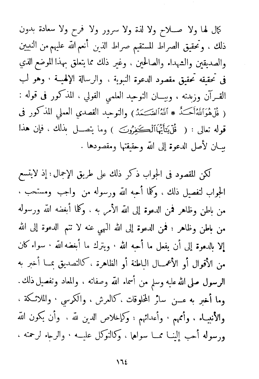 كَمَالَ لَهَا وَلَا صَلَاحَ وَلَا لَذَّةَ وَلَا سُرُورَ وَلَا فَرَحَ وَلَا سَعَادَةَ بِدُونِ ذَلِكَ وَتَحْقِيقِ الصِّرَاطِ الْمُسْتَقِيمِ صِرَاطِ الَّذِينَ أَنْعَمَ اللَّهُ عَلَيْهِمْ مِنْ النَّبِيَّيْنِ وَالصِّدِّيقِينَ وَالشُّهَدَاءِ وَالصَّالِحِينَ وَغَيْرِ ذَلِكَ مِمَّا يَتَعَلَّقُ بِهَذَا الْمَوْضِعِ الَّذِي فِي تَحْقِيقِهِ تَحْقِيقُ مَقْصُودِ الدَّعْوَةِ النَّبَوِيَّةِ وَالرِّسَالَةِ الْإِلَهِيَّةِ وَهُوَ لُبُّ الْقُرْآنِ وَزُبْدَتُهُ وَبَيَانِ التَّوْحِيدِ الْعِلْمِيِّ الْقَوْلِيِّ الْمَذْكُورِ فِي قَوْلِهِ: {قُلْ هُوَ اللَّهُ أَحَدٌ} {اللَّهُ الصَّمَدُ} وَالتَّوْحِيدِ الْقَصْدِي الْعَمَلِيِّ الْمَذْكُورِ فِي قَوْله تَعَالَى {قُلْ يَا أَيُّهَا الْكَافِرُونَ} وَمَا يَتَّصِلُ بِذَلِكَ فَإِنَّ هَذَا بَيَانٌ لِأَصْلِ الدَّعْوَةِ إلَى اللَّهِ وَحَقِيقَتِهَا وَمَقْصُودِهَا. لَكِنَّ الْمَقْصُودَ فِي الْجَوَابِ ذِكْرُ ذَلِكَ عَلَى طَرِيقِ الْإِجْمَالِ؛ إذْ لَا يَتَّسِعُ الْجَوَابُ لِتَفْصِيلِ ذَلِكَ وَكُلُّ مَا أَحَبَّهُ اللَّهُ وَرَسُولُهُ مِنْ وَاجِبٍ وَمُسْتَحَبٍّ مِنْ بَاطِنٍ وَظَاهِرٍ فَمِنْ الدَّعْوَةِ إلَى اللَّهِ الْأَمْرُ بِهِ وَكُلُّ مَا أَبْغَضَهُ اللَّهُ وَرَسُولُهُ مِنْ بَاطِنٍ وَظَاهِرٍ؛ فَمِنْ الدَّعْوَةِ إلَى اللَّهِ النَّهْيُ عَنْهُ لَا تَتِمُّ الدَّعْوَةُ إلَى اللَّهِ إلَّا بِالدَّعْوَةِ إلَى أَنْ يَفْعَلَ مَا أَحَبَّهُ اللَّهُ وَيَتْرُكَ مَا أَبْغَضَهُ اللَّهُ سَوَاءٌ كَانَ مِنْ الْأَقْوَالِ أَوْ الْأَعْمَالِ الْبَاطِنَةِ أَوْ الظَّاهِرَةِ كَالتَّصْدِيقِ بِمَا أَخْبَرَ بِهِ الرَّسُولُ صَلَّى اللَّهُ عَلَيْهِ وَسَلَّمَ مِنْ أَسْمَاءِ اللَّهِ وَصِفَاتِهِ وَالْمَعَادِ وَتَفْصِيلِ ذَلِكَ وَمَا أَخْبَرَ بِهِ عَنْ سَائِرِ الْمَخْلُوقَاتِ كَالْعَرْشِ وَالْكُرْسِيِّ وَالْمَلَائِكَةِ وَالْأَنْبِيَاءِ وَأُمَمِهِمْ وَأَعْدَائِهِمْ؛ وَكَإِخْلَاصِ الدِّينِ لِلَّهِ وَأَنْ يَكُونَ اللَّهُ وَرَسُولُهُ أَحَبَّ إلَيْنَا مِمَّا سِوَاهُمَا وَكَالتَّوَكُّلِ عَلَيْهِ وَالرَّجَاءِ لِرَحْمَتِهِ،