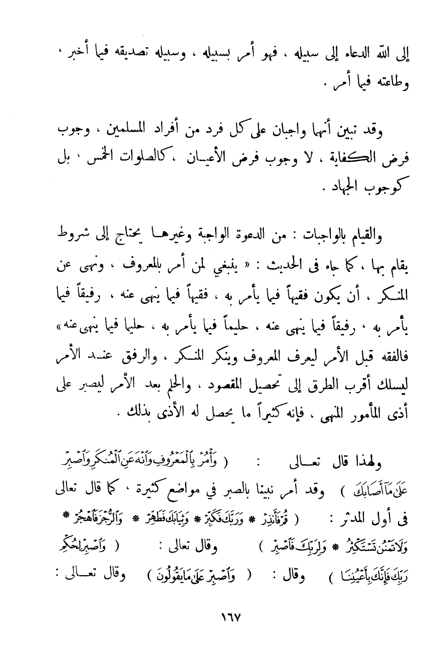 وَالْقِيَامُ بِالْوَاجِبَاتِ: مِنْ الدَّعْوَةِ الْوَاجِبَةِ وَغَيْرِهَا يَحْتَاجُ إلَى شُرُوطٍ يُقَامُ بِهَا كَمَا جَاءَ فِي الْحَدِيثِ: {يَنْبَغِي لِمَنْ أَمَرَ بِالْمَعْرُوفِ وَنَهَى عَنْ الْمُنْكَرِ أَنْ يَكُونَ فَقِيهًا فِيمَا يَأْمُرُ بِهِ فَقِيهًا فِيمَا يَنْهَى عَنْهُ رَفِيقًا فِيمَا يَأْمُرُ بِهِ رَفِيقًا فِيمَا يَنْهَى عَنْهُ حَلِيمًا فِيمَا يَأْمُرُ بِهِ حَلِيمًا فِيمَا يَنْهَى عَنْهُ} فَالْفِقْهُ قَبْلَ الْأَمْرِ لِيُعَرِّفَ الْمَعْرُوفَ وَيُنْكِرَ الْمُنْكَرَ وَالرِّفْقُ عِنْدَ الْأَمْرِ لِيَسْلُكَ أَقْرَبَ الطُّرُقِ إلَى تَحْصِيلِ الْمَقْصُودِ وَالْحِلْمُ بَعْدَ الْأَمْرِ لِيَصْبِرَ عَلَى أَذَى الْمَأْمُورِ الْمَنْهِيِّ فَإِنَّهُ كَثِيرًا مَا يَحْصُلُ لَهُ الْأَذَى بِذَلِكَ. وَلِهَذَا قَالَ تَعَالَى: {وَأْمُرْ بِالْمَعْرُوفِ وَانْهَ عَنِ الْمُنْكَرِ وَاصْبِرْ عَلَى مَا أَصَابَكَ} وَقَدْ أَمَرَ نَبِيَّنَا بِالصَّبْرِ فِي مَوَاضِعَ كَثِيرَةٍ كَمَا قَالَ تَعَالَى فِي أَوَّلِ الْمُدَّثِّرِ: {قُمْ فَأَنْذِرْ} {وَرَبَّكَ فَكَبِّرْ} {وَثِيَابَكَ فَطَهِّرْ} {وَالرُّجْزَ فَاهْجُرْ} {وَلَا تَمْنُنْ تَسْتَكْثِرُ} {وَلِرَبِّكَ فَاصْبِرْ} وَقَالَ تَعَالَى: {وَاصْبِرْ لِحُكْمِ رَبِّكَ فَإِنَّكَ بِأَعْيُنِنَا} وَقَالَ: {وَاصْبِرْ عَلَى مَا يَقُولُونَ}