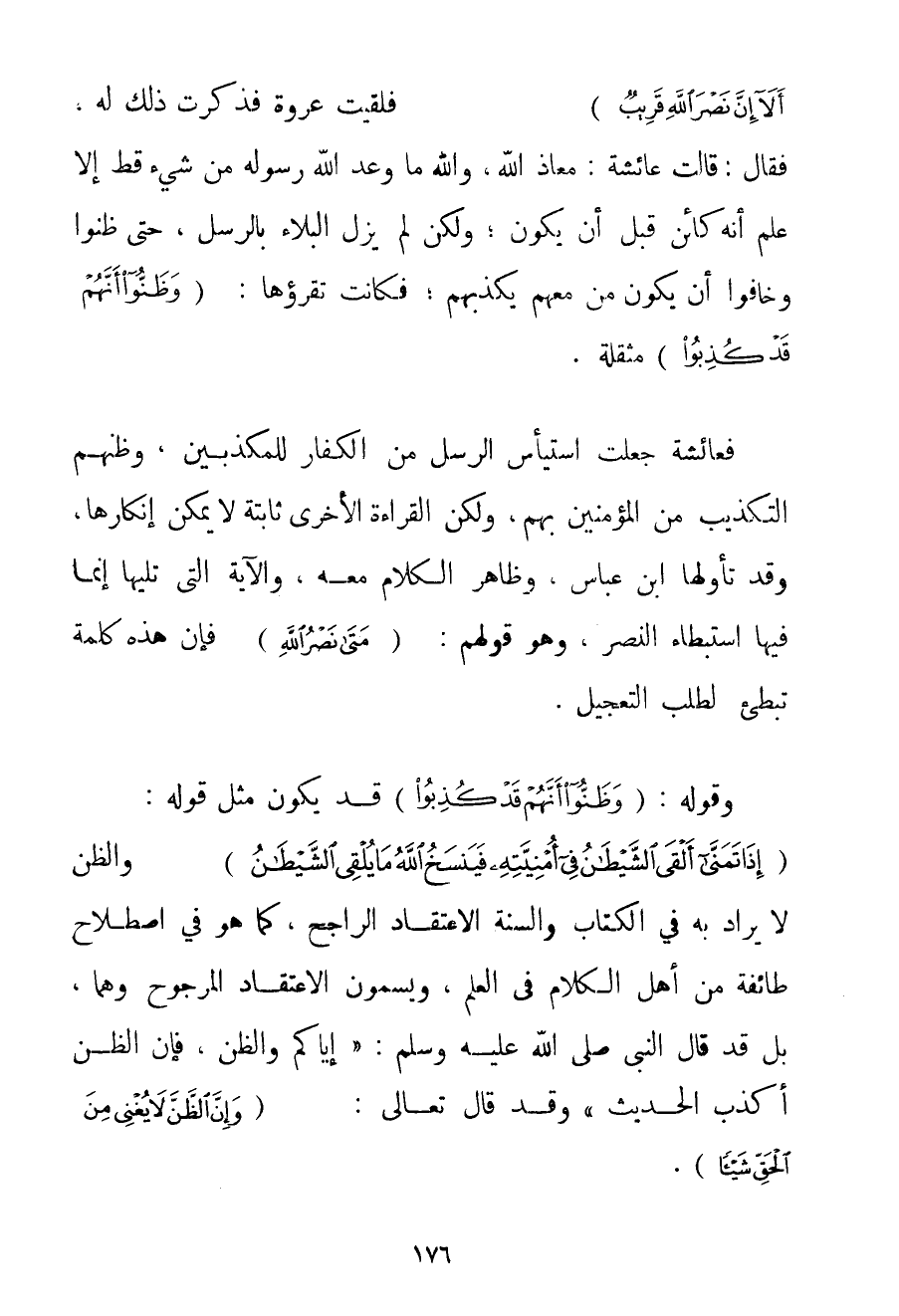 نَصْرُ اللَّهِ أَلَا إنَّ نَصْرَ اللَّهِ قَرِيبٌ} فَلَقِيت عُرْوَةَ فَذَكَرْت ذَلِكَ لَهُ فَقَالَ: قَالَتْ عَائِشَةُ: مَعَاذَ اللَّهِ وَاَللَّهِ مَا وَعَدَ اللَّهُ رَسُولَهُ مِنْ شَيْءٍ قَطُّ إلَّا عَلِمَ أَنَّهُ كَائِنٌ قَبْلَ أَنْ يَكُونَ؛ وَلَكِنْ لَمْ يَزَلْ الْبَلَاءُ بِالرُّسُلِ حَتَّى ظَنُّوا وَخَافُوا أَنْ يَكُونَ مَنْ مَعَهُمْ يُكَذِّبُهُمْ؛ فَكَانَتْ تَقْرَؤُهَا: {وَظَنُّوا أَنَّهُمْ قَدْ كُذِبُوا} مُثَقَّلَةً. فَعَائِشَةُ جَعَلَتْ اسْتَيْأَسَ الرُّسُلُ مِنْ الْكُفَّارِ الْمُكَذِّبِينَ وَظَنَّهُمْ التَّكْذِيبَ مِنْ الْمُؤْمِنِينَ بِهِمْ وَلَكِنَّ الْقِرَاءَةَ الْأُخْرَى ثَابِتَةٌ لَا يُمْكِنُ إنْكَارُهَا وَقَدْ تَأَوَّلَهَا ابْنُ عَبَّاسٍ وَظَاهِرُ الْكَلَامِ مَعَهُ وَالْآيَةُ الَّتِي تَلِيهَا إنَّمَا فِيهَا اسْتِبْطَاءُ النَّصْرِ وَهُوَ قَوْلُهُمْ: {مَتَى نَصْرُ اللَّهِ} فَإِنَّ هَذِهِ كَلِمَةٌ تُبْطِئُ لِطَلَبِ التَّعْجِيلِ. وَقَوْلُهُ: {وَظَنُّوا أَنَّهُمْ قَدْ كُذِبُوا} قَدْ يَكُونُ مِثْلَ قَوْلِهِ: {إذَا تَمَنَّى أَلْقَى الشَّيْطَانُ فِي أُمْنِيَّتِهِ فَيَنْسَخُ اللَّهُ مَا يُلْقِي الشَّيْطَانُ} وَالظَّنُّ لَا يُرَادُ بِهِ فِي الْكِتَابِ وَالسُّنَّةِ الِاعْتِقَادُ الرَّاجِحُ كَمَا هُوَ فِي اصْطِلَاحِ طَائِفَةٍ مِنْ أَهْلِ الْكَلَامِ فِي الْعِلْمِ وَيُسَمُّونَ الِاعْتِقَادَ الْمَرْجُوحَ وَهْمًا بَلْ قَدْ قَالَ النَّبِيُّ صَلَّى اللَّهُ عَلَيْهِ وَسَلَّمَ {إيَّاكُمْ وَالظَّنَّ فَإِنَّ الظَّنَّ أَكْذَبُ الْحَدِيثِ} وَقَدْ قَالَ تَعَالَى: {وَإِنَّ الظَّنَّ لَا يُغْنِي مِنَ الْحَقِّ شَيْئًا} .