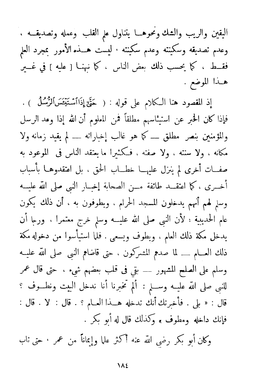 الْيَقِينِ وَالرَّيْبِ وَالشَّكِّ وَنَحْوِهَا يَتَنَاوَلُ عِلْمَ الْقَلْبِ وَعَمَلَهُ وَتَصْدِيقَهُ وَعَدَمَ تَصْدِيقِهِ وَسَكِينَتَهُ وَعَدَمَ سَكِينَتِهِ لَيْسَتْ هَذِهِ الْأُمُورُ بِمُجَرَّدِ الْعِلْمِ فَقَطْ كَمَا يَحْسَبُ ذَلِكَ بَعْضُ النَّاسِ كَمَا نَبَّهْنَا عَلَيْهِ فِي غَيْرِ هَذَا الْمَوْضِعِ. إذْ الْمَقْصُودُ هُنَا الْكَلَامُ عَلَى قَوْلِهِ: {حَتَّى إذَا اسْتَيْئَسَ الرُّسُلُ} . فَإِذَا كَانَ الْخَبَرُ عَنْ اسْتِيئَاسِهِمْ مُطْلَقًا فَمِنْ الْمَعْلُومِ أَنَّ اللَّهَ إذَا وَعَدَ الرُّسُلَ وَالْمُؤْمِنِينَ بِنَصْرِ مُطْلَقٍ - كَمَا هُوَ غَالِبُ إخباراته - لَمْ يُقَيِّدْ زَمَانَهُ وَلَا مَكَانَهُ وَلَا سَنَتَهُ وَلَا صِفَتَهُ فَكَثِيرًا مَا يَعْتَقِدُ النَّاسُ فِي الْمَوْعُودِ بِهِ صِفَاتٍ أُخْرَى لَمْ يَنْزِلْ عَلَيْهَا خِطَابُ الْحَقِّ بَلْ اعْتَقَدُوهَا بِأَسْبَابِ أُخْرَى كَمَا اعْتَقَدَ طَائِفَةٌ مِنْ الصَّحَابَةِ إخْبَارَ النَّبِيِّ صَلَّى اللَّهُ عَلَيْهِ وَسَلَّمَ لَهُمْ أَنَّهُمْ يَدْخُلُونَ الْمَسْجِدَ الْحَرَامَ وَيَطُوفُونَ بِهِ أَنَّ ذَلِكَ يَكُونُ عَامَ الْحُدَيْبِيَةِ؛ لِأَنَّ النَّبِيَّ صَلَّى اللَّهُ عَلَيْهِ وَسَلَّمَ خَرَجَ مُعْتَمِرًا وَرَجَا أَنْ يَدْخُلَ مَكَّةَ ذَلِكَ الْعَامَ وَيَطُوفَ وَيَسْعَى. فَلَمَّا اسْتَيْأَسُوا مِنْ دُخُولِهِ مَكَّةَ ذَلِكَ الْعَامَ - لَمَّا صَدَّهُمْ الْمُشْرِكُونَ حَتَّى قَاضَاهُمْ النَّبِيُّ صَلَّى اللَّهُ عَلَيْهِ وَسَلَّمَ عَلَى الصُّلْحِ الْمَشْهُورِ - بَقِيَ فِي قَلْبِ بَعْضِهِمْ شَيْءٌ حَتَّى {قَالَ عُمَرُ لِلنَّبِيِّ صَلَّى اللَّهُ عَلَيْهِ وَسَلَّمَ أَلَمْ تُخْبِرْنَا أَنَّا نَدْخُلُ الْبَيْتَ وَنَطُوفُ؟ قَالَ: بَلَى. فَأَخْبَرْتُك أَنَّك تَدْخُلُهُ هَذَا الْعَامَ؟ . قَالَ: لَا. قَالَ: فَإِنَّك دَاخِلُهُ وَمُطَوِّفٌ} وَكَذَلِكَ قَالَ لَهُ أَبُو بَكْرٍ. وَكَانَ أَبُو بَكْرٍ رَضِيَ اللَّهُ عَنْهُ أَكْثَرَ عِلْمًا وَإِيمَانًا مِنْ عُمَرَ حَتَّى تَابَ