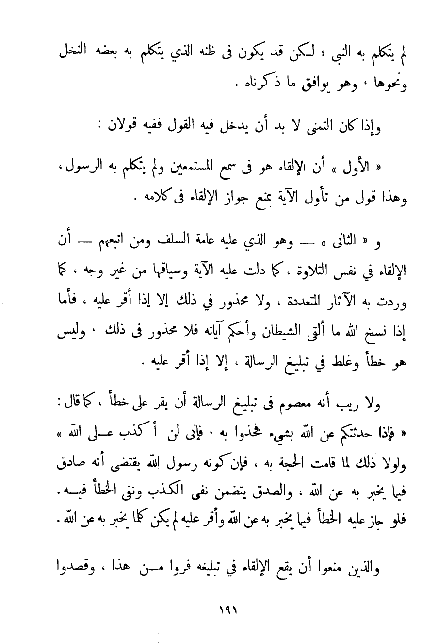 لَمْ يَتَكَلَّمْ بِهِ النَّبِيُّ؛ لَكِنْ قَدْ يَكُونُ فِي ظَنِّهِ الَّذِي يَتَكَلَّمُ بِهِ بَعْضُهُ النَّخْلُ وَنَحْوُهَا وَهُوَ يُوَافِقُ مَا ذَكَرْنَاهُ. وَإِذَا كَانَ التَّمَنِّي لَا بُدَّ أَنْ يَدْخُلَ فِيهِ الْقَوْلُ فَفِيهِ قَوْلَانِ: " الْأَوَّلُ " أَنَّ الْإِلْقَاءَ هُوَ فِي سَمْعِ الْمُسْتَمِعِينَ وَلَمْ يَتَكَلَّمْ بِهِ الرَّسُولُ وَهَذَا قَوْلُ مَنْ تَأَوَّلَ الْآيَةَ بِمَنْعِ جَوَازِ الْإِلْقَاءِ فِي كَلَامِهِ. و " الثَّانِي " - وَهُوَ الَّذِي عَلَيْهِ عَامَّةُ السَّلَفِ وَمَنْ اتَّبَعَهُمْ - أَنَّ الْإِلْقَاءَ فِي نَفْسِ التِّلَاوَةِ كَمَا دَلَّتْ عَلَيْهِ الْآيَةُ وَسِيَاقُهَا مِنْ غَيْرِ وَجْهٍ كَمَا وَرَدَتْ بِهِ الْآثَارُ الْمُتَعَدِّدَةُ وَلَا مَحْذُورَ فِي ذَلِكَ إلَّا إذَا أَقَرَّ عَلَيْهِ فَأَمَّا إذَا نَسَخَ اللَّهُ مَا أَلْقَى الشَّيْطَانُ وَأَحْكَمَ آيَاتِهِ فَلَا مَحْذُورَ فِي ذَلِكَ وَلَيْسَ هُوَ خَطَأٌ وَغَلَطٌ فِي تَبْلِيغِ الرِّسَالَةِ إلَّا إذَا أَقَرَّ عَلَيْهِ. وَلَا رَيْبَ أَنَّهُ مَعْصُومٌ فِي تَبْلِيغِ الرِّسَالَةِ أَنْ يُقِرَّ عَلَى خَطَأٍ كَمَا قَالَ: {فَإِذَا حَدَّثْتُكُمْ عَنْ اللَّهِ بِشَيْءِ فَخُذُوا بِهِ فَإِنِّي لَنْ أَكْذِبَ عَلَى اللَّهِ} وَلَوْلَا ذَلِكَ لَمَا قَامَتْ الْحُجَّةُ بِهِ فَإِنَّ كَوْنَهُ رَسُولَ اللَّهِ يَقْتَضِي أَنَّهُ صَادِقٌ فِيمَا يُخْبِرُ بِهِ عَنْ اللَّهِ وَالصِّدْقُ يَتَضَمَّنُ نَفْيَ الْكَذِبِ وَنَفْيَ الْخَطَأِ فِيهِ. فَلَوْ جَازَ عَلَيْهِ الْخَطَأُ فِيمَا يُخْبِرُ بِهِ عَنْ اللَّهِ وَأَقَرَّ عَلَيْهِ لَمْ يَكُنْ كُلُّ مَا يُخْبِرُ بِهِ عَنْ اللَّهِ. وَاَلَّذِينَ مَنَعُوا أَنْ يَقَعَ الْإِلْقَاءُ فِي تَبْلِيغِهِ فَرُّوا مِنْ هَذَا وَقَصَدُوا