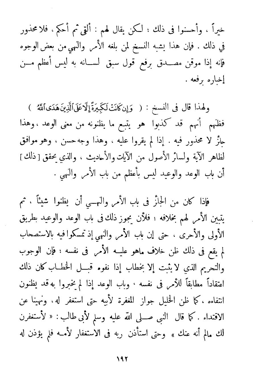 خَيْرًا وَأَحْسَنُوا فِي ذَلِكَ؛ لَكِنْ يُقَالُ لَهُمْ: أَلْقَى ثُمَّ أَحْكَمَ فَلَا مَحْذُورَ فِي ذَلِكَ. فَإِنَّ هَذَا يُشْبِهُ النَّسْخَ لِمَنْ بَلَغَهُ الْأَمْرُ وَالنَّهْيُ مِنْ بَعْضِ الْوُجُوهِ فَإِنَّهُ إذًا مُوقِنٌ مُصَدِّقٌ بِرَفْعِ قَوْلٍ سَبَقَ لِسَانُهُ بِهِ لَيْسَ أَعْظَمَ مِنْ إخْبَارِهِ بِرَفْعِهِ. وَلِهَذَا قَالَ فِي النَّسْخِ: {وَإِنْ كَانَتْ لَكَبِيرَةً إلَّا عَلَى الَّذِينَ هَدَى اللَّهُ} فَظَنُّهُمْ أَنَّهُمْ قَدْ كُذِّبُوا هُوَ يَتَّبِعُ مَا يَظُنُّونَهُ مِنْ مَعْنَى الْوَعْدِ وَهَذَا جَائِزٌ لَا مَحْذُورَ فِيهِ. إذَا لَمْ يُقِرُّوا عَلَيْهِ وَهَذَا وَجْهٌ حَسَنٌ وَهُوَ مُوَافِقٌ لِظَاهِرِ الْآيَةِ وَلِسَائِرِ الْأُصُولِ مِنْ الْآيَاتِ وَالْأَحَادِيثِ وَاَلَّذِي يُحَقِّقُ ذَلِكَ أَنَّ بَابَ الْوَعْدِ وَالْوَعِيدِ لَيْسَ بِأَعْظَمِ مِنْ بَابِ الْأَمْرِ وَالنَّهْيِ. فَإِذَا كَانَ مِنْ الْجَائِزِ فِي بَابِ الْأَمْرِ وَالنَّهْيِ أَنْ يَظُنُّوا شَيْئًا ثُمَّ يَتَبَيَّنُ الْأَمْرُ لَهُمْ بِخِلَافِهِ؛ فَلَأَنْ يَجُوزَ ذَلِكَ فِي بَابِ الْوَعْدِ وَالْوَعِيدِ بِطَرِيقِ الْأَوْلَى وَالْأَحْرَى حَتَّى إنَّ بَابَ الْأَمْرِ وَالنَّهْيِ إذَا تَمَسَّكُوا فِيهِ بِالِاسْتِصْحَابِ لَمْ يَقَعْ فِي ذَلِكَ ظَنُّ خِلَافِ مَا هُوَ عَلَيْهِ الْأَمْرُ فِي نَفْسِهِ؛ فَإِنَّ الْوُجُوبَ وَالتَّحْرِيمَ الَّذِي لَا يَثْبُتُ إلَّا بِخِطَابِ إذَا نَفَوْهُ قَبْلَ الْخِطَابِ كَانَ ذَلِكَ اعْتِقَادًا مُطَابِقًا لِلْأَمْرِ فِي نَفْسِهِ وَبَابُ الْوَعْدِ إذَا لَمْ يُخْبَرُوا بِهِ قَدْ يَظُنُّونَ انْتِفَاءَهُ كَمَا ظَنَّ الْخَلِيلُ جَوَازَ الْمَغْفِرَةِ لِأَبِيهِ حَتَّى اسْتَغْفَرَ لَهُ وَنُهِينَا عَنْ الِاقْتِدَاءِ. كَمَا {قَالَ النَّبِيُّ صَلَّى اللَّهُ عَلَيْهِ وَسَلَّمَ لِأَبِي طَالِبٍ: لَأَسْتَغْفِرَنَّ لَك مَا لَمْ أُنْهَ عَنْك} وَحَتَّى اسْتَأْذَنَ رَبَّهُ فِي الِاسْتِغْفَارِ لِأُمِّهِ فَلَمْ يُؤْذَنْ لَهُ فِي