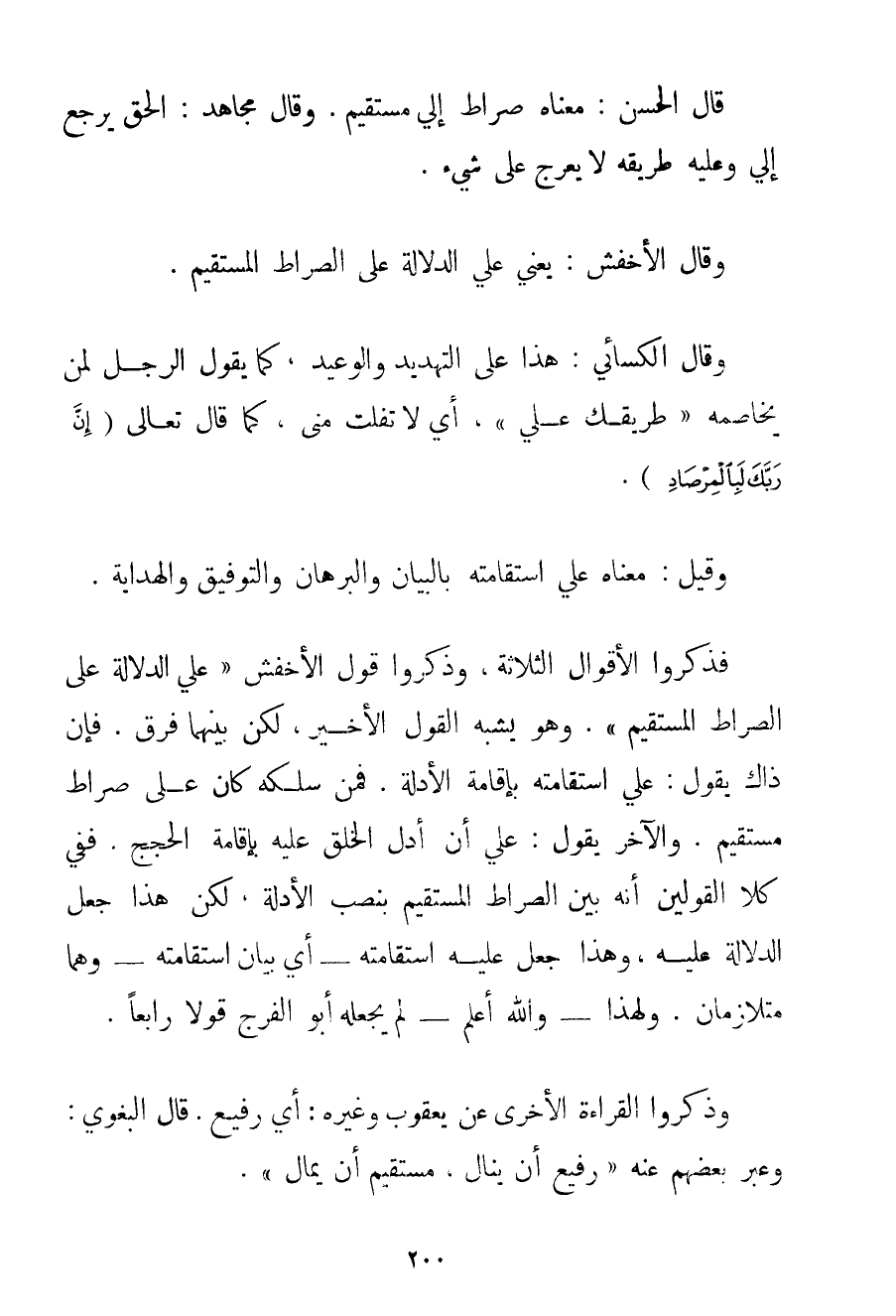 قَالَ الْحَسَنُ: مَعْنَاهُ صِرَاطٌ إلَيَّ مُسْتَقِيمٌ. وَقَالَ مُجَاهِدٌ: الْحَقُّ يَرْجِعُ إلَيَّ وَعَلَيْهِ طَرِيقُهُ لَا يُعَرَّجُ عَلَى شَيْءٍ. وَقَالَ الْأَخْفَشُ: يَعْنِي عَلَيَّ الدَّلَالَةُ عَلَى الصِّرَاطِ الْمُسْتَقِيمِ. وَقَالَ الْكِسَائِيُّ: هَذَا عَلَى التَّهْدِيدِ وَالْوَعِيدِ كَمَا يَقُولُ الرِّجْلُ لِمَنْ يُخَاصِمُهُ " طَرِيقُك عَلَيَّ " أَيْ لَا تَفْلِتُ مِنِّي كَمَا قَالَ تَعَالَى {إنَّ رَبَّكَ لَبِالْمِرْصَادِ} . وَقِيلَ: مَعْنَاهُ عَلَيَّ اسْتِقَامَتُهُ بِالْبَيَانِ وَالْبُرْهَانِ وَالتَّوْفِيقِ وَالْهِدَايَةِ. فَذَكَرُوا الْأَقْوَالَ الثَّلَاثَةَ وَذَكَرُوا قَوْلَ الْأَخْفَشِ " عَلَيَّ الدَّلَالَةُ عَلَى الصِّرَاطِ الْمُسْتَقِيمِ ". وَهُوَ يُشْبِهُ الْقَوْلَ الْأَخِيرَ لَكِنْ بَيْنَهُمَا فَرْقٌ. فَإِنَّ ذَاكَ يَقُولُ: عَلَيَّ اسْتِقَامَتُهُ بِإِقَامَةِ الْأَدِلَّةِ. فَمَنْ سَلَكَهُ كَانَ عَلَى صِرَاطٍ مُسْتَقِيمٍ. وَالْآخَرُ يَقُولُ: عَلَيَّ أَنْ أَدُلَّ الْخَلْقَ عَلَيْهِ بِإِقَامَةِ الْحُجَجِ. فَفِي كِلَا الْقَوْلَيْنِ أَنَّهُ بَيَّنَ الصِّرَاطَ الْمُسْتَقِيمَ بِنَصْبِ الْأَدِلَّةِ لَكِنَّ هَذَا جَعَلَ الدَّلَالَةَ عَلَيْهِ وَهَذَا جَعَلَ عَلَيْهِ اسْتِقَامَتَهُ - أَيْ بَيَانُ اسْتِقَامَتِهِ - وَهُمَا مُتَلَازِمَانِ. وَلِهَذَا - وَاَللَّهُ أَعْلَمُ - لَمْ يَجْعَلْهُ أَبُو الْفَرَجِ قَوْلًا رَابِعًا. وَذَكَرُوا الْقِرَاءَةَ الْأُخْرَى عَنْ يَعْقُوبَ وَغَيْرِهِ: أَيْ رَفِيعٌ. قَالَ البغوي: وَعَبَّرَ بَعْضُهُمْ عَنْهُ " رَفِيعٌ أَنْ يُنَالَ مُسْتَقِيمٌ أَنْ يُمَالَ ".