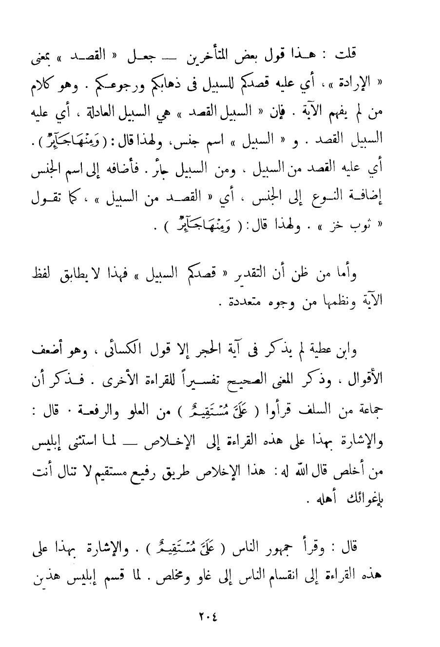 قُلْت: هَذَا قَوْلُ بَعْضِ الْمُتَأَخِّرِينَ - جَعَلَ " الْقَصْدَ " بِمَعْنَى " الْإِرَادَةِ " أَيْ عَلَيْهِ قَصْدُكُمْ لِلسَّبِيلِ فِي ذَهَابِكُمْ وَرُجُوعِكُمْ. وَهُوَ كَلَامُ مَنْ لَمْ يَفْهَمْ الْآيَةَ. فَإِنَّ " السَّبِيلَ الْقَصْدَ " هِيَ السَّبِيلُ الْعَادِلَةُ أَيْ عَلَيْهِ السَّبِيلُ الْقَصْدُ. و " السَّبِيلُ " اسْمُ جِنْسٍ وَلِهَذَا قَالَ: {وَمِنْهَا جَائِرٌ} . أَيْ عَلَيْهِ الْقَصْدُ مِنْ السَّبِيلِ وَمِنْ السَّبِيلِ جَائِرٌ. فَأَضَافَهُ إلَى اسْمِ الْجِنْسِ إضَافَةَ النَّوْعِ إلَى الْجِنْسِ أَيْ " الْقَصْدُ مِنْ السَّبِيلِ " كَمَا تَقُولُ " ثَوْبُ خَزٍّ ". وَلِهَذَا قَالَ: {وَمِنْهَا جَائِرٌ} . وَأَمَّا مَنْ ظَنَّ أَنَّ التَّقْدِيرَ " قَصْدُكُمْ السَّبِيلَ " فَهَذَا لَا يُطَابِقُ لَفْظَ الْآيَةِ وَنَظْمَهَا مِنْ وُجُوهٍ مُتَعَدِّدَةٍ. وَابْنُ عَطِيَّةَ لَمْ يَذْكُرْ فِي آيَةِ الْحِجْرِ إلَّا قَوْلَ الْكِسَائِيِّ وَهُوَ أَضْعَفُ الْأَقْوَالِ وَذَكَرَ الْمَعْنَى الصَّحِيحِ تَفْسِيرًا لِلْقِرَاءَةِ الْأُخْرَى. فَذَكَرَ أَنَّ جَمَاعَةً مِنْ السَّلَفِ قَرَءُوا {عَلَيَّ مُسْتَقِيمٌ} مِنْ الْعُلُوِّ وَالرِّفْعَةِ. قَالَ: وَالْإِشَارَةُ بِهَذَا عَلَى هَذِهِ الْقِرَاءَةِ إلَى الْإِخْلَاصِ - لَمَّا اسْتَثْنَى إبْلِيسُ مَنْ أَخْلَصَ قَالَ اللَّهُ لَهُ: هَذَا الْإِخْلَاصُ طَرِيقٌ رَفِيعٌ مُسْتَقِيمٌ لَا تَنَالُ أَنْتَ بِإِغْوَائِك أَهْلَهُ. قَالَ: وَقَرَأَ جُمْهُورُ النَّاسِ {عَلَيَّ مُسْتَقِيمٌ} . وَالْإِشَارَةُ بِهَذَا عَلَى هَذِهِ الْقِرَاءَةِ إلَى انْقِسَامِ النَّاسِ إلَى غَاوٍ وَمُخْلِصٍ. لَمَّا قَسَّمَ إبْلِيسُ هَذَيْنِ