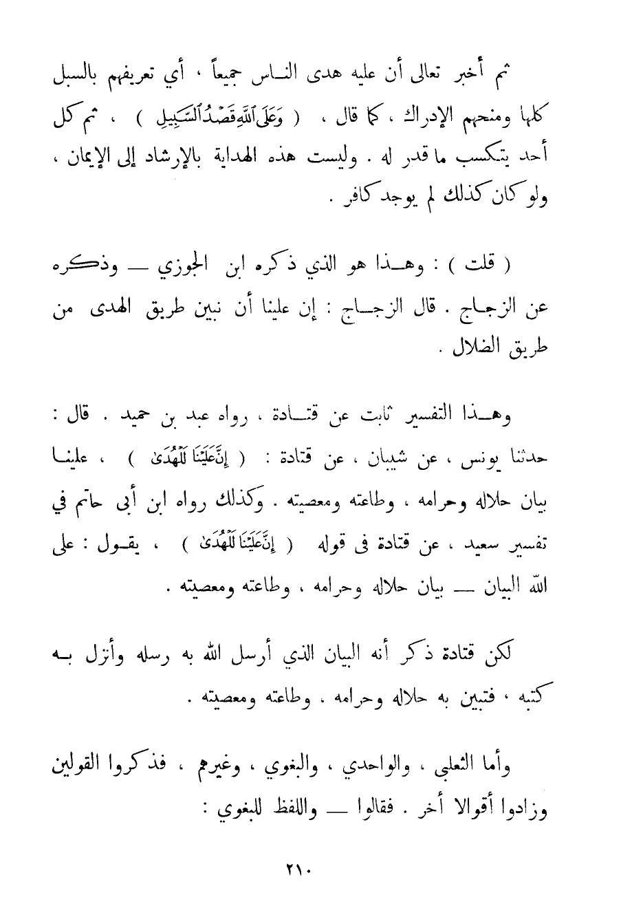 ثُمَّ أَخْبَرَ تَعَالَى أَنَّ عَلَيْهِ هُدَى النَّاسِ جَمِيعًا أَيْ تَعْرِيفُهُمْ بِالسُّبُلِ كُلِّهَا وَمَنْحُهُمْ الْإِدْرَاكَ كَمَا قَالَ {وَعَلَى اللَّهِ قَصْدُ السَّبِيلِ} ثُمَّ كُلُّ أَحَدٍ يَتَكَسَّبُ مَا قُدِّرَ لَهُ. وَلَيْسَتْ هَذِهِ الْهِدَايَةُ بِالْإِرْشَادِ إلَى الْإِيمَانِ وَلَوْ كَانَ كَذَلِكَ لَمْ يُوجَدْ كَافِرٌ. قُلْت: وَهَذَا هُوَ الَّذِي ذَكَرَهُ ابْنُ الْجَوْزِيِّ - وَذَكَرَهُ عَنْ الزَّجَّاجِ. قَالَ الزَّجَّاجُ: إنَّ عَلَيْنَا أَنْ نُبَيِّنَ طَرِيقَ الْهُدَى مِنْ طَرِيقِ الضَّلَالِ. وَهَذَا التَّفْسِيرُ ثَابِتٌ عَنْ قتادة رَوَاهُ عَبْدُ بْنُ حَمِيدٍ. قَالَ: حَدَّثَنَا يُونُسُ عَنْ شيبان عَنْ قتادة: {إنَّ عَلَيْنَا لَلْهُدَى} عَلَيْنَا بَيَانُ حَلَالِهِ وَحَرَامِهِ وَطَاعَتِهِ وَمَعْصِيَتِهِ. وَكَذَلِكَ رَوَاهُ ابْنُ أَبِي حَاتِمٍ فِي تَفْسِيرِ سَعِيدٍ عَنْ قتادة فِي قَوْلِهِ {إنَّ عَلَيْنَا لَلْهُدَى} يَقُولُ: عَلَى اللَّهِ الْبَيَانُ - بَيَانُ حَلَالِهِ وَحَرَامِهِ وَطَاعَتِهِ وَمَعْصِيَتِهِ. لَكِنَّ قتادة ذَكَرَ أَنَّهُ الْبَيَانُ الَّذِي أَرْسَلَ اللَّهُ بِهِ رُسُلَهُ وَأَنْزَلَ بِهِ كُتُبَهُ فَتُبَيِّنُ بِهِ حَلَالَهُ وَحَرَامَهُ وَطَاعَتَهُ وَمَعْصِيَتَهُ. وَأَمَّا الثَّعْلَبِيُّ وَالْوَاحِدِيُّ والبغوي وَغَيْرُهُمْ فَذَكَرُوا الْقَوْلَيْنِ وَزَادُوا أَقْوَالًا أُخَرَ. فَقَالُوا - وَاللَّفْظُ للبغوي: