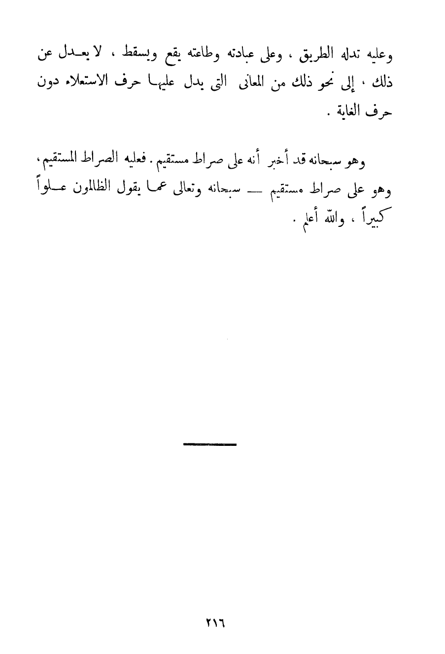 وَعَلَيْهِ تَدُلُّهُ الطَّرِيقُ وَعَلَى عِبَادَتِهِ وَطَاعَتِهِ يَقَعُ وَيَسْقُطُ لَا يَعْدِلُ عَنْ ذَلِكَ إلَى نَحْوِ ذَلِكَ مِنْ الْمَعَانِي الَّتِي يَدُلُّ عَلَيْهَا حَرْفُ الِاسْتِعْلَاءِ دُونَ حَرْفِ الْغَايَةِ. وَهُوَ سُبْحَانَهُ قَدْ أَخْبَرَ أَنَّهُ عَلَى صِرَاطٍ مُسْتَقِيمٍ. فَعَلَيْهِ الصِّرَاطُ الْمُسْتَقِيمُ وَهُوَ عَلَى صِرَاطٍ مُسْتَقِيمٍ - سُبْحَانَهُ وَتَعَالَى عَمَّا يَقُولُ الظَّالِمُونَ عُلُوًّا كَبِيرًا وَاَللَّهُ أَعْلَمُ.