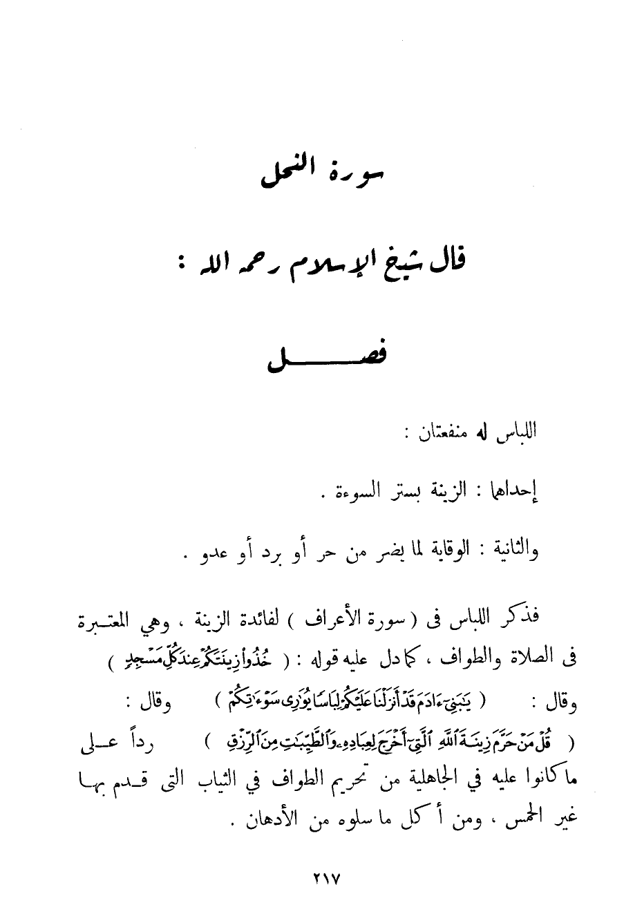 اللِّبَاسُ لَهُ مَنْفَعَتَانِ: إحْدَاهُمَا: الزِّينَةُ بِسَتْرِ السَّوْأَةِ. وَالثَّانِيَةُ: الْوِقَايَةُ لِمَا يَضُرُّ مِنْ حَرٍّ أَوْ بَرْدٍ أَوْ عَدُوٍّ. فَذَكَرَ اللِّبَاسَ فِي (سُورَةِ الْأَعْرَافِ) لِفَائِدَةِ الزِّينَةِ وَهِيَ الْمُعْتَبَرَةُ فِي الصَّلَاةِ وَالطَّوَافِ كَمَا دَلَّ عَلَيْهِ قَوْلُهُ: {خُذُوا زِينَتَكُمْ عِنْدَ كُلِّ مَسْجِدٍ} وَقَالَ: {يَا بَنِي آدَمَ قَدْ أَنْزَلْنَا عَلَيْكُمْ لِبَاسًا يُوَارِي سَوْآتِكُمْ} وَقَالَ: {قُلْ مَنْ حَرَّمَ زِينَةَ اللَّهِ الَّتِي أَخْرَجَ لِعِبَادِهِ وَالطَّيِّبَاتِ مِنَ الرِّزْقِ} رَدًّا عَلَى مَا كَانُوا عَلَيْهِ فِي الْجَاهِلِيَّةِ مِنْ تَحْرِيمِ الطَّوَافِ فِي الثِّيَابِ الَّذِي قَدِمَ بِهَا غَيْرُ الْحُمْسِ وَمِنْ أَكْلِ مَا سَلَّوْهُ مِنْ الْأَدْهَانِ.