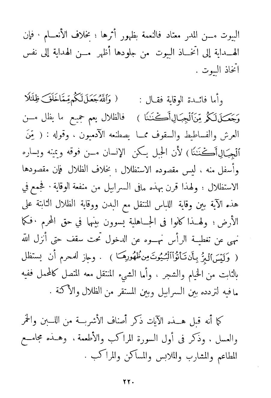 الْبُيُوتِ مِنْ الْمَدَرِ مُعْتَادٌ فَالنِّعْمَةُ بِظُهُورِ أَثَرِهَا؛ بِخِلَافِ الْأَنْعَامِ فَإِنَّ الْهِدَايَةَ إلَى اتِّخَاذِ الْبُيُوتِ مِنْ جُلُودِهَا أَظْهَرُ مِنْ الْهِدَايَةِ إلَى نَفْسِ اتِّخَاذِ الْبُيُوتِ. وَأَمَّا فَائِدَةُ الْوِقَايَةِ فَقَالَ: {وَاللَّهُ جَعَلَ لَكُمْ مِمَّا خَلَقَ ظِلَالًا وَجَعَلَ لَكُمْ مِنَ الْجِبَالِ أَكْنَانًا} فَالظِّلَالُ يَعُمُّ جَمِيعَ مَا يَظِلُّ مِنْ الْعَرْشِ وَالْفَسَاطِيطِ وَالسُّقُوفِ مِمَّا يَصْطَنِعُهُ الْآدَمِيُّونَ وَقَوْلُهُ: {مِنَ الْجِبَالِ أَكْنَانًا} لِأَنَّ الْجَبَلَ يَكِنُّ الْإِنْسَانَ مِنْ فَوْقِهِ وَيَمِينِهِ وَيَسَارِهِ وَأَسْفَلِ مِنْهُ لَيْسَ مَقْصُودُهُ الِاسْتِظْلَالَ؛ بِخِلَافِ الظِّلَالِ فَإِنَّ مَقْصُودَهَا الِاسْتِظْلَالُ؛ وَلِهَذَا قَرَنَ بِهَذِهِ مَا فِي السَّرَابِيلِ مِنْ مَنْفَعَةِ الْوِقَايَةِ فَجَمَعَ فِي هَذِهِ الْآيَةِ بَيْنَ وِقَايَةِ اللِّبَاسِ الْمُنْتَقِلِ مَعَ الْبَدَنِ وَوِقَايَةِ الظِّلَالِ الثَّابِتَةِ عَلَى الْأَرْضِ؛ وَلِهَذَا كَانُوا فِي الْجَاهِلِيَّةِ يُسَوُّونَ بَيْنَهُمَا فِي حَقِّ الْمُحْرِمِ فَكَمَا نَهَى عَنْ تَغْطِيَةِ الرَّأْسِ نَهَوْهُ عَنْ الدُّخُولِ تَحْتَ سَقْفٍ حَتَّى أَنْزَلَ اللَّهُ {وَلَيْسَ الْبِرُّ بِأَنْ تَأْتُوا الْبُيُوتَ مِنْ ظُهُورِهَا} . وَجَازَ لِلْمُحْرِمِ أَنْ يَسْتَظِلَّ بِالثَّابِتِ مِنْ الْخِيَامِ وَالشَّجَرِ وَأَمَّا الشَّيْءُ الْمُنْتَقِلُ مَعَهُ الْمُتَّصِلُ كَالْمَحْمَلِ فَفِيهِ مَا فِيهِ لِتَرَدُّدِهِ بَيْنَ السَّرَابِيلِ وَبَيْنَ الْمُسْتَقِرِّ مِنْ الظِّلَالِ وَالْأَكِنَّةِ. كَمَا أَنَّهُ قَبْلَ هَذِهِ الْآيَاتِ ذَكَرَ أَصْنَافَ الْأَشْرِبَةِ مِنْ اللَّبَنِ وَالْخَمْرِ وَالْعَسَلِ وَذَكَرَ فِي أَوَّلِ السُّورَةِ الْمَرَاكِبَ وَالْأَطْعِمَةَ وَهَذِهِ مَجَامِعُ الْمَطَاعِمِ وَالْمَشَارِبِ وَالْمَلَابِسِ وَالْمَسَاكِنِ وَالْمَرَاكِبِ.