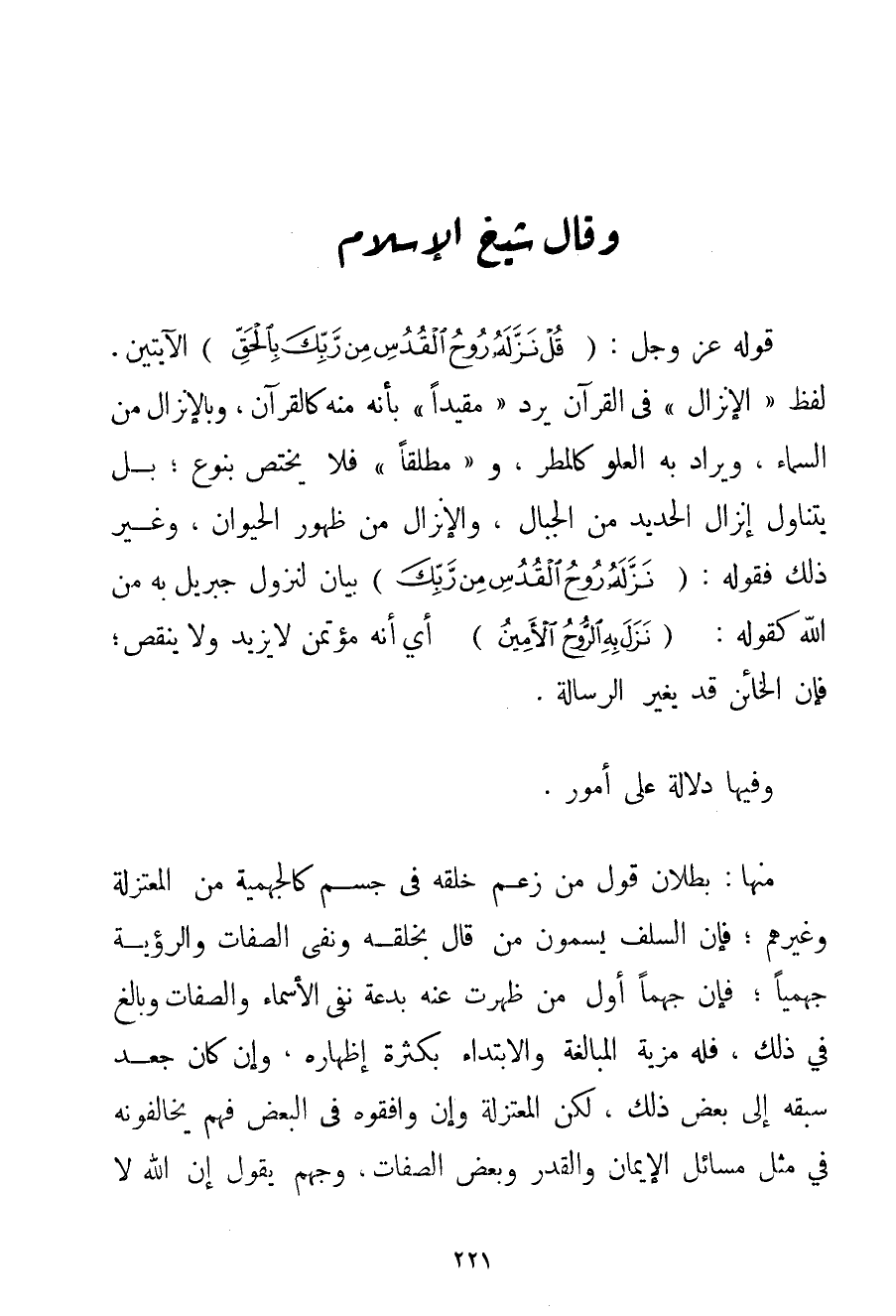قَوْلُهُ عَزَّ وَجَلَّ: {قُلْ نَزَّلَهُ رُوحُ الْقُدُسِ مِنْ رَبِّكَ بِالْحَقِّ} الْآيَتَيْنِ. لَفْظُ " الْإِنْزَالِ " فِي الْقُرْآنِ يَرِدُ " مُقَيَّدًا " بِأَنَّهُ مِنْهُ كَالْقُرْآنِ وَبِالْإِنْزَالِ مِنْ السَّمَاءِ وَيُرَادُ بِهِ الْعُلُوُّ كَالْمَطَرِ و " مُطْلَقًا " فَلَا يَخْتَصُّ بِنَوْعِ (*) ؛ بَلْ يَتَنَاوَلُ إنْزَالَ الْحَدِيدِ مِنْ الْجِبَالِ وَالْإِنْزَالَ مِنْ ظُهُورِ الْحَيَوَانِ وَغَيْرَ ذَلِكَ فَقَوْلُهُ: {نَزَّلَهُ رُوحُ الْقُدُسِ مِنْ رَبِّكَ} بَيَانٌ لِنُزُولِ جِبْرِيلَ بِهِ مِنْ اللَّهِ كَقَوْلِهِ: {نَزَلَ بِهِ الرُّوحُ الْأَمِينُ} أَيْ أَنَّهُ مُؤْتَمَنٌ لَا يَزِيدُ وَلَا يَنْقُصُ؛ فَإِنَّ الْخَائِنَ قَدْ يُغَيِّرُ الرِّسَالَةَ. وَفِيهَا دَلَالَةٌ عَلَى أُمُورٍ. مِنْهَا: بُطْلَانُ قَوْلِ مَنْ زَعَمَ خَلْقَهُ فِي جِسْمٍ كالْجَهْمِيَّة مِنْ الْمُعْتَزِلَةِ وَغَيْرِهِمْ؛ فَإِنَّ السَّلَفَ يُسَمُّونَ مَنْ قَالَ بِخَلْقِهِ وَنَفَى الصِّفَاتِ وَالرُّؤْيَةَ جهميا؛ فَإِنَّ جَهْمًا أَوَّلُ مَنْ ظَهَرَتْ عَنْهُ بِدْعَةُ نَفْيِ الْأَسْمَاءِ وَالصِّفَاتِ وَبَالَغَ فِي ذَلِكَ فَلَهُ مَزِيَّةُ الْمُبَالَغَةِ وَالِابْتِدَاءِ بِكَثْرَةِ إظْهَارِهِ وَإِنْ كَانَ جَعْدٌ سَبَقَهُ إلَى بَعْضِ ذَلِكَ؛ لَكِنَّ الْمُعْتَزِلَةَ وَإِنْ وَافَقُوهُ فِي الْبَعْضِ فَهُمْ يُخَالِفُونَهُ فِي مِثْلِ مَسَائِلِ الْإِيمَانِ وَالْقَدَرِ وَبَعْضِ الصِّفَاتِ وَجَهْمٌ يَقُولُ إنَّ اللَّهَ لَا
