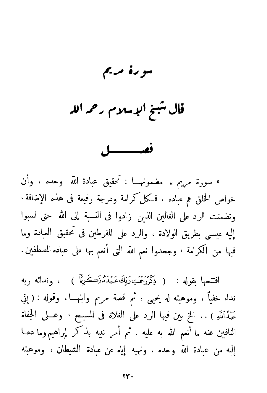 " سُورَةُ مَرْيَمَ " مَضْمُونُهَا: تَحْقِيقُ عِبَادَةِ اللَّهِ وَحْدَهُ وَأَنَّ خَوَاصَّ الْخَلْقِ هُمْ عِبَادُهُ فَكُلُّ كَرَامَةٍ وَدَرَجَةٍ رَفِيعَةٍ فِي هَذِهِ الْإِضَافَةِ وَتَضَمَّنَتْ الرَّدَّ عَلَى الْغَالِينَ الَّذِينَ زَادُوا فِي النِّسْبَةِ إلَى اللَّهِ حَتَّى نَسَبُوا إلَيْهِ عِيسَى بِطَرِيقِ الْوِلَادَةِ وَالرَّدِّ عَلَى الْمُفْرِطِينَ فِي تَحْقِيقِ الْعِبَادَةِ وَمَا فِيهَا مِنْ الْكَرَامَةِ وَجَحَدُوا نِعَمَ اللَّهِ الَّتِي أَنْعَمَ بِهَا عَلَى عِبَادِهِ الْمُصْطَفِينَ. افْتَتَحَهَا بِقَوْلِهِ: {ذِكْرُ رَحْمَةِ رَبِّكَ عَبْدَهُ زَكَرِيَّا} وَنِدَائِهِ رَبَّهُ نِدَاءً خَفِيًّا وَمَوْهِبَتِهِ لَهُ يَحْيَى ثُمَّ قِصَّةِ مَرْيَمَ وَابْنِهَا وَقَوْلِهِ: {إنِّي عَبْدُ اللَّهِ} . . إلَخْ بَيَّنَ فِيهَا الرَّدَّ عَلَى الْغُلَاةِ فِي الْمَسِيحِ وَعَلَى الْجُفَاةِ النَّافِينَ عَنْهُ مَا أَنْعَمَ اللَّهُ بِهِ عَلَيْهِ؛ ثُمَّ أَمَرَ نَبِيَّهُ بِذِكْرِ إبْرَاهِيمَ وَمَا دَعَا إلَيْهِ مِنْ عِبَادَةِ اللَّهِ وَحْدَهُ وَنَهْيِهِ إيَّاهُ عَنْ عِبَادَةِ الشَّيْطَانِ وَمَوْهِبَتِهِ