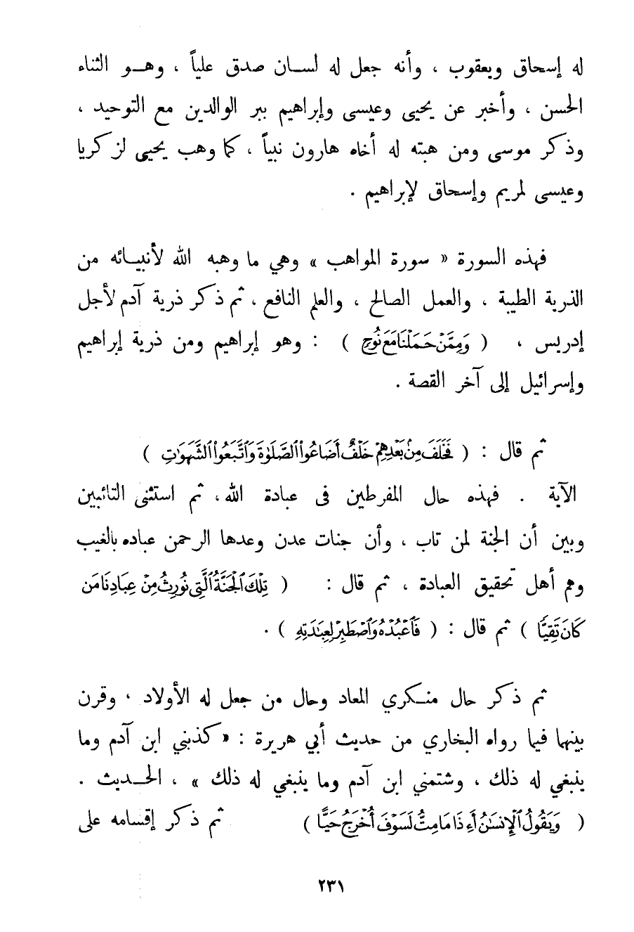 لَهُ إسْحَاقَ وَيَعْقُوبَ وَأَنَّهُ جَعَلَ لَهُ لِسَانَ صِدْقٍ عَلِيًّا وَهُوَ الثَّنَاءُ الْحَسَنُ وَأَخْبَرَ عَنْ يَحْيَى وَعِيسَى وَإِبْرَاهِيمَ بِبِرِّ الْوَالِدَيْنِ مَعَ التَّوْحِيدِ وَذَكَرَ مُوسَى وَمَوْهِبَتَهُ لَهُ أَخَاهُ هَارُونَ نَبِيًّا كَمَا وَهَبَ يَحْيَى لِزَكَرِيَّا وَعِيسَى لِمَرْيَمَ وَإِسْحَاقَ لِإِبْرَاهِيمَ. فَهَذِهِ السُّورَةُ " سُورَةُ الْمَوَاهِبِ " وَهِيَ مَا وَهَبَهُ اللَّهُ لِأَنْبِيَائِهِ مِنْ الذُّرِّيَّةِ الطَّيِّبَةِ وَالْعَمَلِ الصَّالِحِ وَالْعِلْمِ النَّافِعِ ثُمَّ ذَكَرَ ذُرِّيَّةَ آدَمَ لِأَجْلِ إدْرِيسَ {وَمِمَّنْ حَمَلْنَا مَعَ نُوحٍ} وَهُوَ إبْرَاهِيمُ وَمِنْ ذُرِّيَّةِ إبْرَاهِيمَ وَإِسْرَائِيلَ إلَى آخِرِ الْقِصَّةِ. ثُمَّ قَالَ: {فَخَلَفَ مِنْ بَعْدِهِمْ خَلْفٌ أَضَاعُوا الصَّلَاةَ وَاتَّبَعُوا الشَّهَوَاتِ} الْآيَةُ. فَهَذِهِ حَالُ الْمُفَرِّطِينَ فِي عِبَادَةِ اللَّهِ ثُمَّ اسْتَثْنَى التَّائِبِينَ وَبَيَّنَ أَنَّ الْجَنَّةَ لِمَنْ تَابَ وَأَنَّ جَنَّاتِ عَدْنٍ وَعَدَهَا الرَّحْمَنُ عِبَادَهُ بِالْغَيْبِ وَهُمْ أَهْلُ تَحْقِيقِ الْعِبَادَةِ ثُمَّ قَالَ: {تِلْكَ الْجَنَّةُ الَّتِي نُورِثُ مِنْ عِبَادِنَا مَنْ كَانَ تَقِيًّا} ثُمَّ قَالَ: {فَاعْبُدْهُ وَاصْطَبِرْ لِعِبَادَتِهِ} . ثُمَّ ذَكَرَ حَالَ مُنْكِرِي الْمَعَادِ وَحَالَ مَنْ جَعَلَ لَهُ الْأَوْلَادَ وَقَرَنَ بَيْنَهُمَا فِيمَا رَوَاهُ الْبُخَارِيُّ مِنْ حَدِيثِ أَبِي هُرَيْرَةَ: {كَذَّبَنِي ابْنُ آدَمَ وَمَا يَنْبَغِي لَهُ ذَلِكَ وَشَتَمَنِي ابْنُ آدَمَ وَمَا يَنْبَغِي لَهُ ذَلِكَ} الْحَدِيثُ. {وَيَقُولُ الْإِنْسَانُ أَئِذَا مَا مِتُّ لَسَوْفَ أُخْرَجُ حَيًّا} ثُمَّ ذَكَرَ إقْسَامَهُ عَلَى
