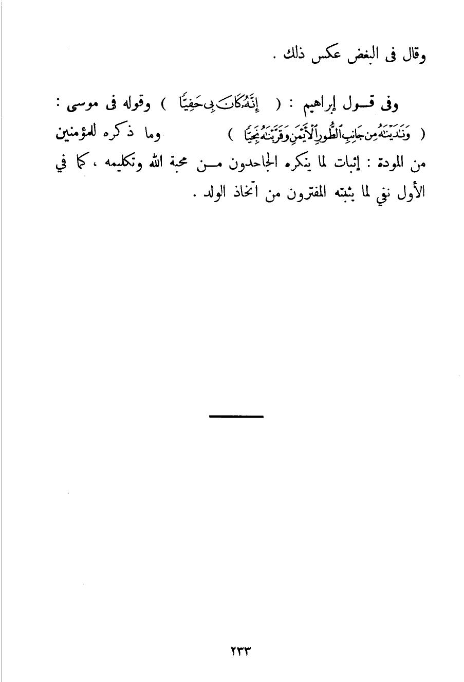 وَقَالَ فِي الْبُغْضِ عَكْسَ ذَلِكَ. وَفِي قَوْلِ إبْرَاهِيمَ: {إنَّهُ كَانَ بِي حَفِيًّا} وَقَوْلِهِ فِي مُوسَى: {وَنَادَيْنَاهُ مِنْ جَانِبِ الطُّورِ الْأَيْمَنِ وَقَرَّبْنَاهُ نَجِيًّا} وَمَا ذَكَرَهُ لِلْمُؤْمِنِينَ مِنْ الْمَوَدَّةِ: إثْبَاتٌ لِمَا يُنْكِرُهُ الْجَاحِدُونَ مِنْ مَحَبَّةِ اللَّهِ وَتَكْلِيمِهِ كَمَا فِي الْأَوَّلِ نَفْيٌ لِمَا يُثْبِتُهُ الْمُفْتَرُونَ مِنْ اتِّخَاذِ الْوَلَدِ.