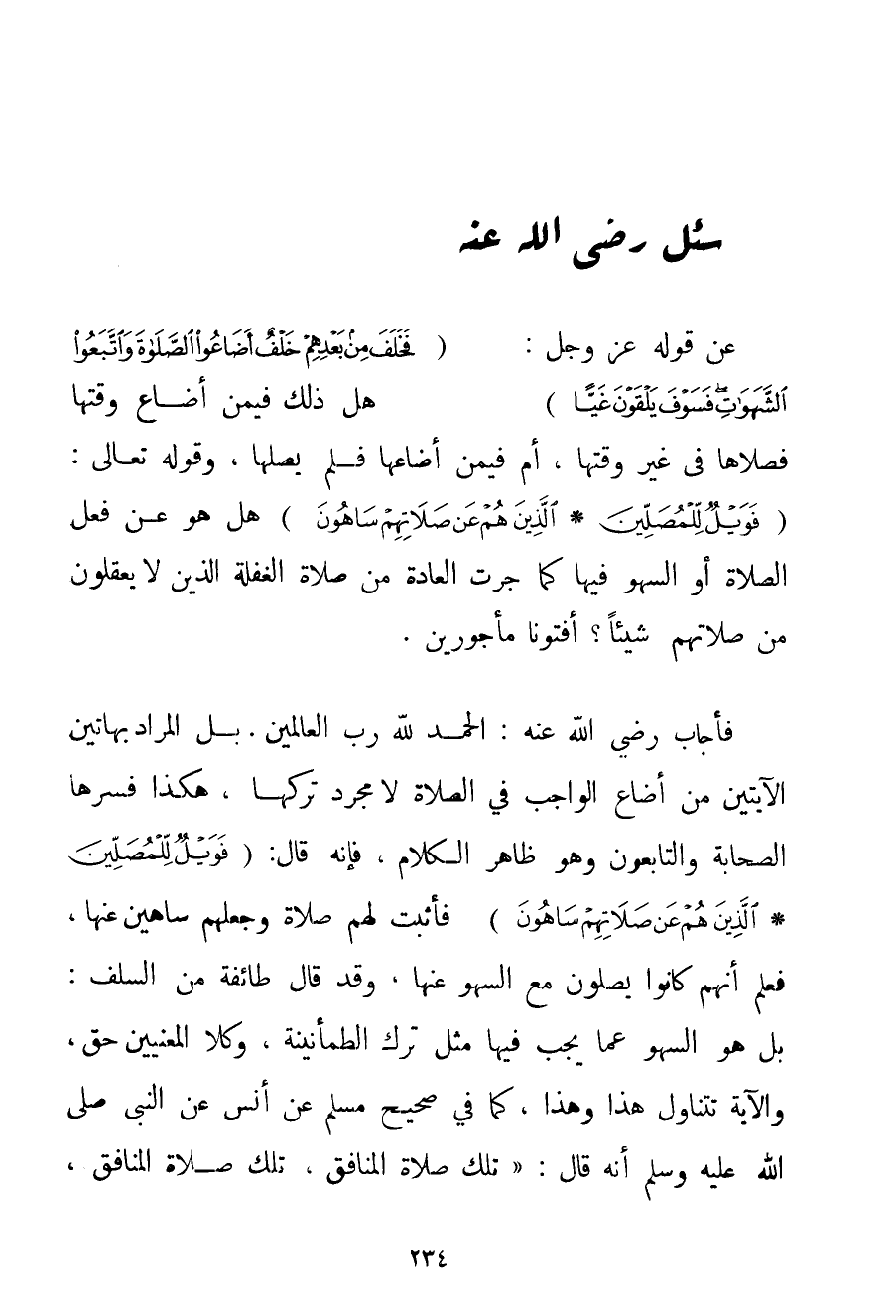 عَنْ قَوْلِهِ عَزَّ وَجَلَّ: {فَخَلَفَ مِنْ بَعْدِهِمْ خَلْفٌ أَضَاعُوا الصَّلَاةَ وَاتَّبَعُوا الشَّهَوَاتِ فَسَوْفَ يَلْقَوْنَ غَيًّا} هَلْ ذَلِكَ فِيمَنْ أَضَاعَ وَقْتَهَا فَصَلَّاهَا فِي غَيْرِ وَقْتِهَا أَمْ فِيمَنْ أَضَاعَهَا فَلَمْ يُصَلِّهَا وقَوْله تَعَالَى {فَوَيْلٌ لِلْمُصَلِّينَ} {الَّذِينَ هُمْ عَنْ صَلَاتِهِمْ سَاهُونَ} هَلْ هُوَ عَنْ فِعْلِ الصَّلَاةِ أَوْ السَّهْوِ فِيهَا كَمَا جَرَتْ الْعَادَةُ مِنْ صَلَاةِ الغفلة الَّذِينَ لَا يَعْقِلُونَ مِنْ صَلَاتِهِمْ شَيْئًا؟ أَفْتُونَا مَأْجُورِينَ.