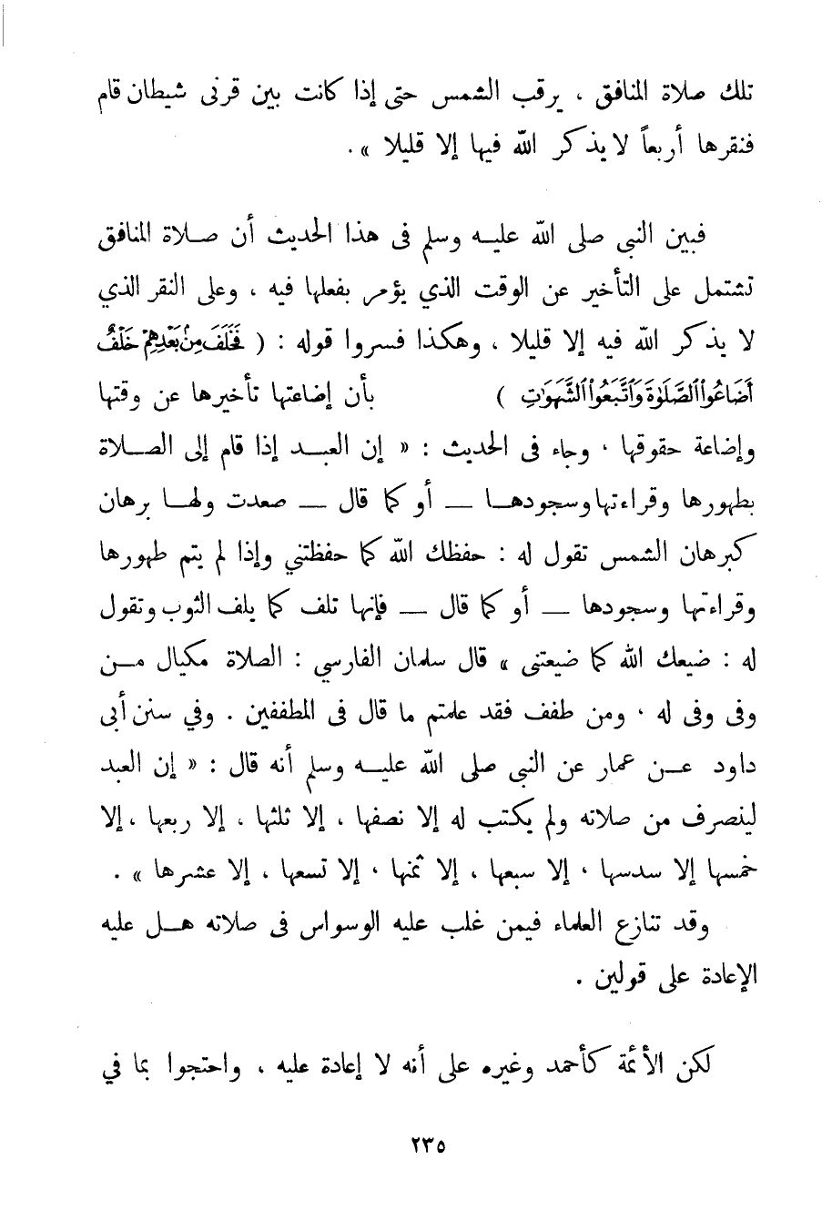 تِلْكَ صَلَاةُ الْمُنَافِقِ يَرْقُبُ الشَّمْسَ حَتَّى إذَا كَانَتْ بَيْنَ قَرْنَيْ شَيْطَانٍ قَامَ فَنَقَرَهَا أَرْبَعًا لَا يَذْكُرُ اللَّهَ فِيهَا إلَّا قَلِيلًا} . فَبَيَّنَ النَّبِيُّ صَلَّى اللَّهُ عَلَيْهِ وَسَلَّمَ فِي هَذَا الْحَدِيثِ أَنَّ صَلَاةَ الْمُنَافِقِ تَشْتَمِلُ عَلَى التَّأْخِيرِ عَنْ الْوَقْتِ الَّذِي يُؤْمَرُ بِفِعْلِهَا فِيهِ وَعَلَى النَّقْرِ الَّذِي لَا يَذْكُرُ اللَّهَ فِيهِ إلَّا قَلِيلًا وَهَكَذَا فَسَّرُوا قَوْلَهُ: {فَخَلَفَ مِنْ بَعْدِهِمْ خَلْفٌ أَضَاعُوا الصَّلَاةَ وَاتَّبَعُوا الشَّهَوَاتِ} بِأَنَّ إضَاعَتَهَا تَأْخِيرُهَا عَنْ وَقْتِهَا وَإِضَاعَةُ حُقُوقِهَا وَجَاءَ فِي الْحَدِيثِ: {إنَّ الْعَبْدَ إذَا قَامَ إلَى الصَّلَاةِ بِطُهُورِهَا وَقِرَاءَتِهَا وَسُجُودِهَا - أَوْ كَمَا قَالَ - صَعِدَتْ وَلَهَا بُرْهَانٌ كَبُرْهَانِ الشَّمْسِ تَقُولُ لَهُ: حَفِظَك اللَّهُ كَمَا حَفِظْتَنِي وَإِذَا لَمْ يُتِمَّ طُهُورَهَا وَقِرَاءَتَهَا وَسُجُودَهَا - أَوْ كَمَا قَالَ - فَإِنَّهَا تَلُفُّ كَمَا يَلُفُّ الثَّوْبُ وَتَقُولُ لَهُ: ضَيَّعَك اللَّهُ كَمَا ضَيَّعْتنِي} قَالَ سَلْمَانُ الْفَارِسِيُّ: الصَّلَاةُ مِكْيَالٌ مَنْ وَفَّى وُفِّيَ لَهُ وَمَنْ طَفَّفَ فَقَدْ عَلِمْتُمْ مَا قَالَ فِي الْمُطَفِّفِينَ. وَفِي سُنَنِ أَبِي دَاوُد عَنْ عَمَّارٍ عَنْ النَّبِيِّ صَلَّى اللَّهُ عَلَيْهِ وَسَلَّمَ أَنَّهُ قَالَ: {إنَّ الْعَبْدَ لَيَنْصَرِفُ مِنْ صَلَاتِهِ وَلَمْ يُكْتَبْ لَهُ إلَّا نِصْفُهَا إلَّا ثُلُثُهَا إلَّا رُبُعُهَا إلَّا خُمُسُهَا إلَّا سُدُسُهَا إلَّا سُبُعُهَا إلَّا ثُمُنُهَا إلَّا تُسْعُهَا إلَّا عُشْرُهَا} . وَقَدْ تَنَازَعَ الْعُلَمَاءُ فِيمَنْ غَلَبَ عَلَيْهِ الْوِسْوَاسُ فِي صِلَاتِهِ هَلْ عَلَيْهِ الْإِعَادَةُ عَلَى قَوْلَيْنِ. لَكِنَّ الْأَئِمَّةَ كَأَحْمَدَ وَغَيْرِهِ عَلَى أَنَّهُ لَا إعَادَةَ عَلَيْهِ وَاحْتَجُّوا بِمَا فِي