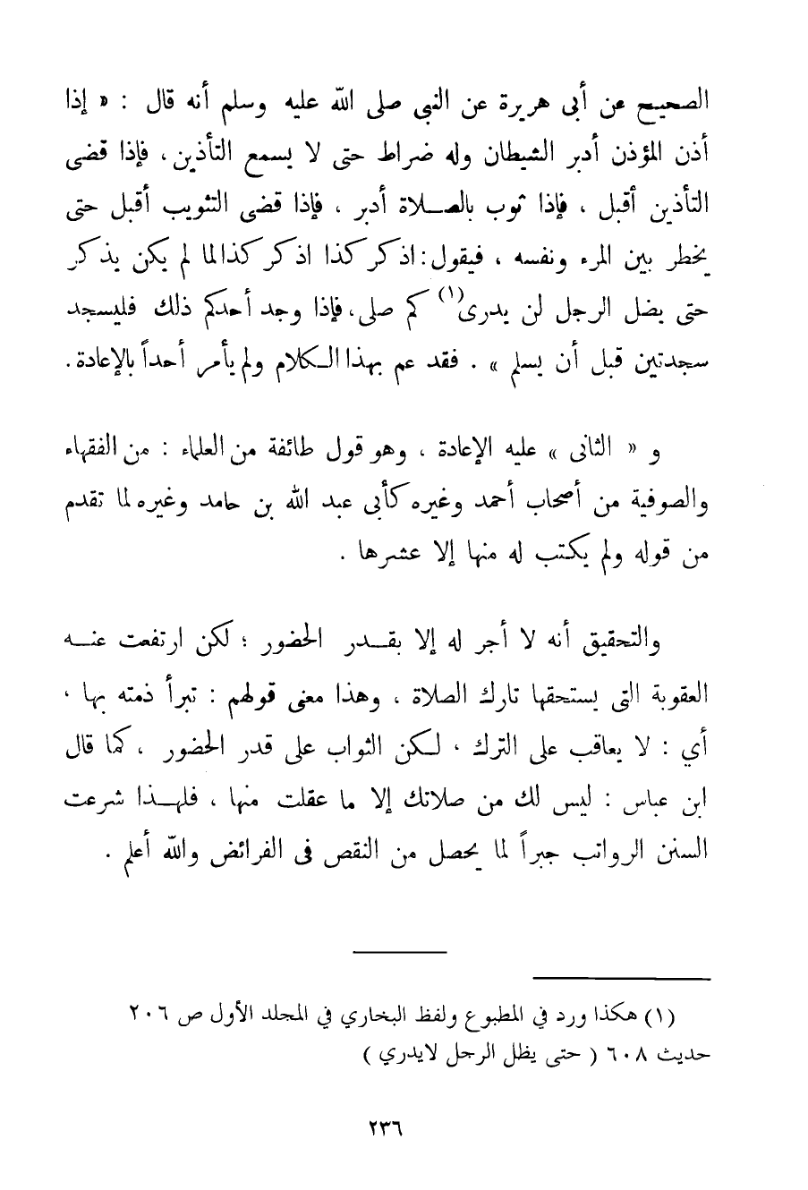 الصَّحِيحِ عَنْ أَبِي هُرَيْرَةَ عَنْ النَّبِيِّ صَلَّى اللَّهُ عَلَيْهِ وَسَلَّمَ أَنَّهُ قَالَ: {إذَا أَذَّنَ الْمُؤَذِّنُ أَدْبَرَ الشَّيْطَانُ وَلَهُ ضُرَاطٌ حَتَّى لَا يَسْمَعَ التَّأْذِينَ فَإِذَا قَضَى التَّأْذِينَ أَقْبَلَ فَإِذَا ثُوِّبَ بِالصَّلَاةِ أَدْبَرَ فَإِذَا قَضَى التَّثْوِيبَ أَقْبَلَ حَتَّى يَخْطُرَ بَيْنَ الْمَرْءِ وَنَفْسِهِ فَيَقُولَ: اُذْكُرْ كَذَا اُذْكُرْ كَذَا لِمَا لَمْ يَكُنْ يَذْكُرُ حَتَّى يُضِلَّ الرَّجُلَ لَنْ يَدْرِيَ كَمْ صَلَّى فَإِذَا وَجَدَ أَحَدُكُمْ ذَلِكَ فَلْيَسْجُدْ سَجْدَتَيْنِ قَبْلَ أَنْ يُسَلِّمَ} . فَقَدْ عَمَّ بِهَذَا الْكَلَامِ وَلَمْ يَأْمُرْ أَحَدًا بِالْإِعَادَةِ. و " الثَّانِي " عَلَيْهِ الْإِعَادَةُ وَهُوَ قَوْلُ طَائِفَةٍ مِنْ الْعُلَمَاءِ: مِنْ الْفُقَهَاءِ وَالصُّوفِيَّةِ مِنْ أَصْحَابِ أَحْمَد وَغَيْرِهِ كَأَبِي عَبْدِ اللَّهِ بْنِ حَامِدٍ وَغَيْرِهِ لِمَا تَقَدَّمَ مِنْ قَوْلِهِ وَلَمْ يُكْتَبْ لَهُ مِنْهَا إلَّا عُشْرُهَا. وَالتَّحْقِيقُ أَنَّهُ لَا أَجْرَ لَهُ إلَّا بِقَدْرِ الْحُضُورِ؛ لَكِنْ ارْتَفَعَتْ عَنْهُ الْعُقُوبَةُ الَّتِي يَسْتَحِقُّهَا تَارِكُ الصَّلَاةِ وَهَذَا مَعْنَى قَوْلِهِمْ: تَبْرَأُ ذِمَّتُهُ بِهَا أَيْ: لَا يُعَاقَبُ عَلَى التَّرْكِ لَكِنَّ الثَّوَابَ عَلَى قَدْرِ الْحُضُورِ كَمَا قَالَ ابْنُ عَبَّاسٍ: لَيْسَ لَك مِنْ صَلَاتِك إلَّا مَا عَقَلْت مِنْهَا فَلِهَذَا شُرِعَتْ السُّنَنُ الرَّوَاتِبُ جَبْرًا لِمَا يَحْصُلُ مِنْ النَّقْصِ فِي الْفَرَائِضِ وَاَللَّهُ أَعْلَمُ.