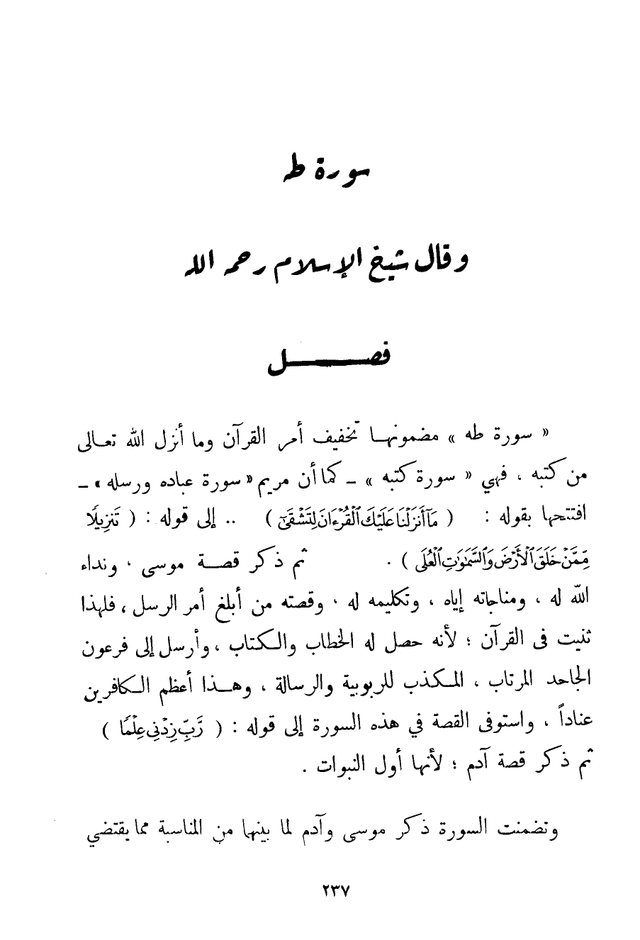 " سُورَةُ طَه " مَضْمُونُهَا تَخْفِيفُ أَمْرِ الْقُرْآنِ وَمَا أَنْزَلَ اللَّهُ تَعَالَى مِنْ كُتُبِهِ فَهِيَ " سُورَةُ كُتُبِهِ " - كَمَا أَنَّ مَرْيَمَ " سُورَةُ عِبَادِهِ وَرُسُلِهِ " - افْتَتَحَهَا بِقَوْلِهِ: {مَا أَنْزَلْنَا عَلَيْكَ الْقُرْآنَ لِتَشْقَى} . . إلَى قَوْلِهِ: {تَنْزِيلًا مِمَّنْ خَلَقَ الْأَرْضَ وَالسَّمَاوَاتِ الْعُلَا} . ثُمَّ ذَكَرَ قِصَّةَ مُوسَى وَنِدَاءَ اللَّهِ لَهُ وَمُنَاجَاتَهُ إيَّاهُ وَتَكْلِيمَهُ لَهُ وَقِصَّتُهُ مِنْ أَبْلَغِ أَمْرِ الرُّسُلِ فَلِهَذَا ثُنِّيَتْ فِي الْقُرْآنِ؛ لِأَنَّهُ حَصَلَ لَهُ الْخِطَابُ وَالْكِتَابُ وَأَرْسَلَ إلَى فِرْعَوْنَ الْجَاحِدِ الْمُرْتَابِ الْمُكَذِّبِ لِلرُّبُوبِيَّةِ وَالرِّسَالَةِ وَهَذَا أَعْظَمُ الْكَافِرِينَ عِنَادًا وَاسْتَوْفَى الْقِصَّةَ فِي هَذِهِ السُّورَةِ إلَى قَوْلِهِ: {رَبِّ زِدْنِي عِلْمًا} ثُمَّ ذَكَرَ قِصَّةَ آدَمَ؛ لِأَنَّهَا أَوَّلُ النُّبُوَّاتِ. وَتَضَمَّنَتْ السُّورَةُ ذِكْرَ مُوسَى وَآدَمَ لِمَا بَيْنَهُمَا مِنْ الْمُنَاسَبَةِ مِمَّا يَقْتَضِي