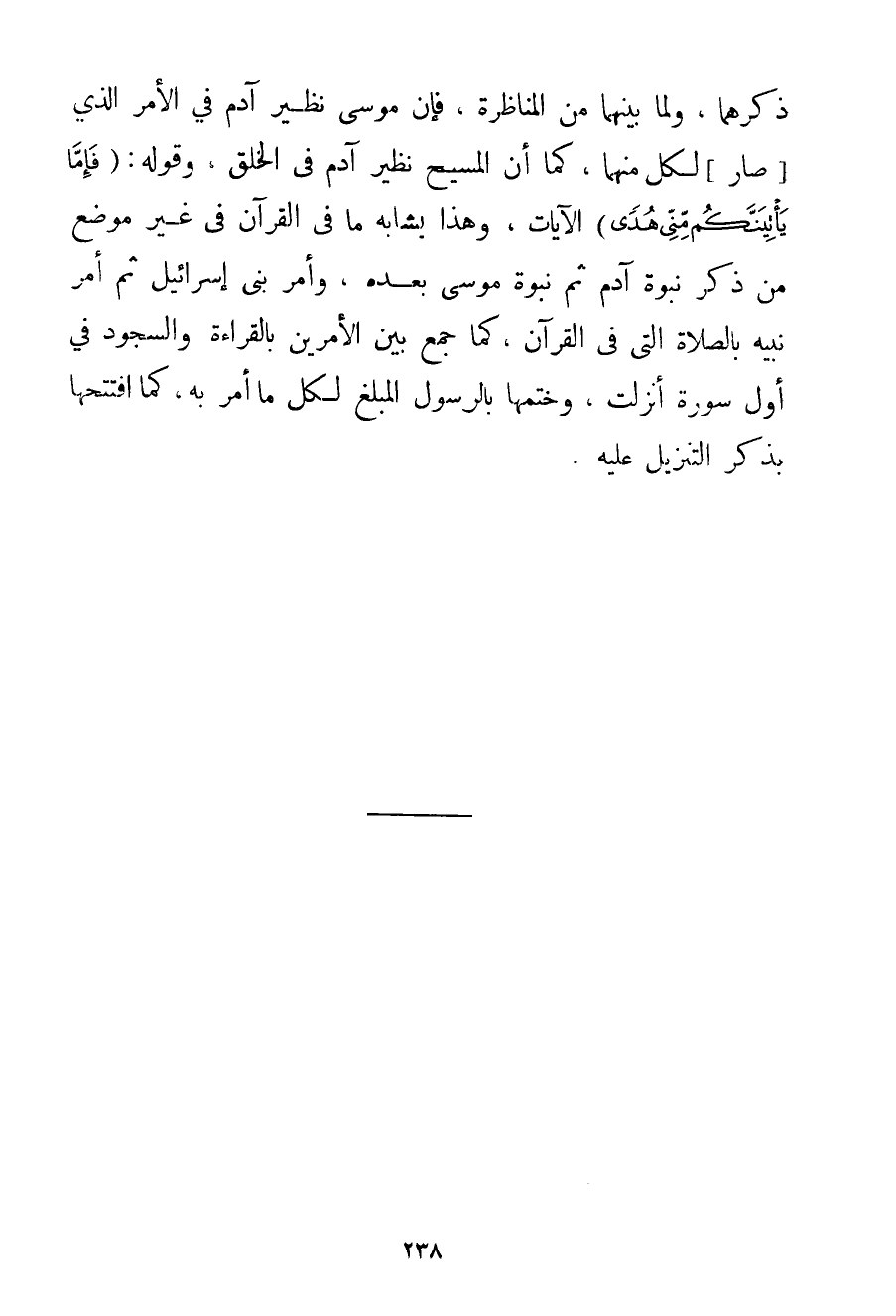 ذِكْرَهُمَا وَلِمَا بَيْنَهُمَا مِنْ الْمُنَاظَرَةِ فَإِنَّ مُوسَى نَظِيرَ آدَمَ فِي الْأَمْرِ الَّذِي صَارَ لِكُلِّ مِنْهُمَا كَمَا أَنَّ الْمَسِيحَ نَظِيرُ آدَمَ فِي الْخَلْقِ وَقَوْلُهُ: {فَإِمَّا يَأْتِيَنَّكُمْ مِنِّي هُدًى} الْآيَاتُ وَهَذَا يُشَابِهُ مَا فِي الْقُرْآنِ فِي غَيْرِ مَوْضِعٍ مِنْ ذِكْرِ نُبُوَّةِ آدَمَ ثُمَّ نُبُوَّةُ مُوسَى بَعْدَهُ وَأَمَرَ بَنِي إسْرَائِيلَ ثُمَّ أَمَرَ نَبِيَّهُ بِالصَّلَاةِ الَّتِي فِي الْقُرْآنِ كَمَا جَمَعَ بَيْنَ الْأَمْرَيْنِ بِالْقِرَاءَةِ وَالسُّجُودِ فِي أَوَّلِ سُورَةٍ أُنْزِلَتْ وَخَتَمَهَا بِالرَّسُولِ الْمُبَلِّغِ لِكُلِّ مَا أُمِرَ بِهِ كَمَا افْتَتَحَهَا بِذِكْرِ التَّنْزِيلِ عَلَيْهِ.