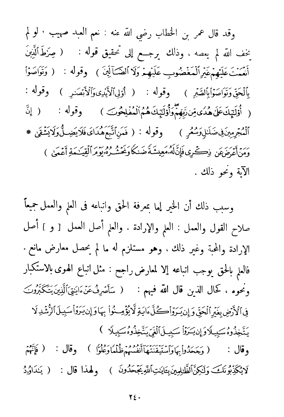 وَقَدْ قَالَ عُمَرُ بْنُ الْخَطَّابِ رَضِيَ اللَّهُ عَنْهُ نِعْمَ الْعَبْدُ صهيب لَوْ لَمْ يَخَفْ اللَّهَ لَمْ يَعْصِهِ وَذَلِكَ يَرْجِعُ إلَى تَحْقِيقِ قَوْلِهِ: {صِرَاطَ الَّذِينَ أَنْعَمْتَ عَلَيْهِمْ غَيْرِ الْمَغْضُوبِ عَلَيْهِمْ وَلَا الضَّالِّينَ} وَقَوْلِهِ: {وَتَوَاصَوْا بِالْحَقِّ وَتَوَاصَوْا بِالصَّبْرِ} وَقَوْلِهِ: {أُولِي الْأَيْدِي وَالْأَبْصَارِ} وَقَوْلِهِ: {أُولَئِكَ عَلَى هُدًى مِنْ رَبِّهِمْ وَأُولَئِكَ هُمُ الْمُفْلِحُونَ} وَقَوْلِهِ: {إنَّ الْمُجْرِمِينَ فِي ضَلَالٍ وَسُعُرٍ} وَقَوْلِهِ: {فَمَنِ اتَّبَعَ هُدَايَ فَلَا يَضِلُّ وَلَا يَشْقَى} {وَمَنْ أَعْرَضَ عَنْ ذِكْرِي فَإِنَّ لَهُ مَعِيشَةً ضَنْكًا وَنَحْشُرُهُ يَوْمَ الْقِيَامَةِ أَعْمَى} الْآيَةُ وَنَحْوَ ذَلِكَ. وَسَبَبُ ذَلِكَ أَنَّ الْخَيْرَ إمَّا بِمَعْرِفَةِ الْحَقِّ وَاتِّبَاعِهِ فِي الْعِلْمِ وَالْعَمَلِ جَمِيعًا صَلَاحُ الْقَوْلِ وَالْعَمَلِ: الْعِلْمُ وَالْإِرَادَةُ. وَالْعِلْمُ أَصْلُ الْعَمَلِ وَأَصْلُ الْإِرَادَةِ وَالْمَحَبَّةِ وَغَيْرِ ذَلِكَ وَهُوَ مُسْتَلْزِمٌ لَهُ مَا لَمْ يَحْصُلْ مُعَارِضٌ مَانِعٌ. فَالْعِلْمُ بِالْحَقِّ يُوجِبُ اتِّبَاعَهُ إلَّا لِمُعَارِضِ رَاجِحٍ: مِثْلَ اتِّبَاعِ الْهَوَى بِالِاسْتِكْبَارِ وَنَحْوَهُ كَحَالِ الَّذِينَ قَالَ اللَّهُ فِيهِمْ: {سَأَصْرِفُ عَنْ آيَاتِيَ الَّذِينَ يَتَكَبَّرُونَ فِي الْأَرْضِ بِغَيْرِ الْحَقِّ وَإِنْ يَرَوْا كُلَّ آيَةٍ لَا يُؤْمِنُوا بِهَا وَإِنْ يَرَوْا سَبِيلَ الرُّشْدِ لَا يَتَّخِذُوهُ سَبِيلًا وَإِنْ يَرَوْا سَبِيلَ الْغَيِّ يَتَّخِذُوهُ سَبِيلًا} وَقَالَ: {وَجَحَدُوا بِهَا وَاسْتَيْقَنَتْهَا أَنْفُسُهُمْ ظُلْمًا وَعُلُوًّا} وَقَالَ: {فَإِنَّهُمْ لَا يُكَذِّبُونَكَ وَلَكِنَّ الظَّالِمِينَ بِآيَاتِ اللَّهِ يَجْحَدُونَ} وَلِهَذَا قَالَ: {يَا دَاوُدُ