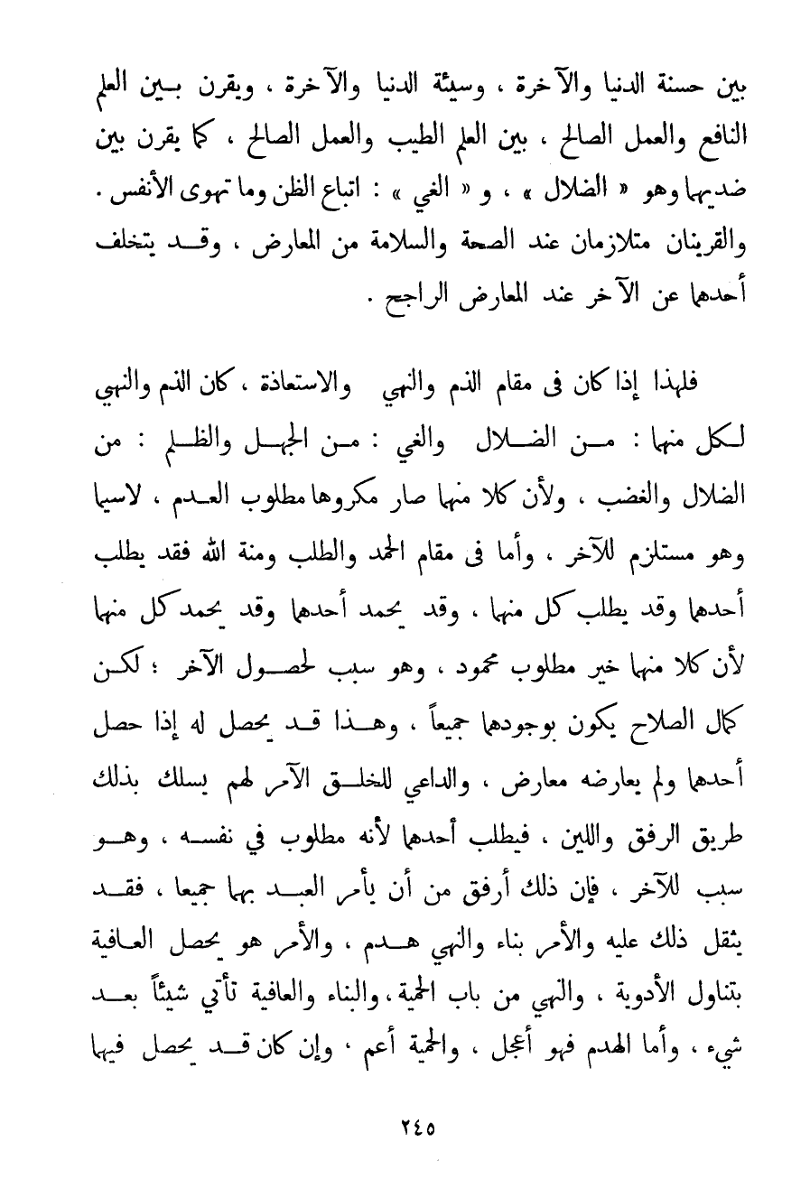 بَيْنَ حَسَنَةِ الدُّنْيَا وَالْآخِرَةِ وَسَيِّئَةِ الدُّنْيَا وَالْآخِرَةِ وَيَقْرِنُ بَيْنَ الْعِلْمِ النَّافِعِ وَالْعَمَلِ الصَّالِحِ بَيْنَ الْعَلَمِ الطَّيِّبِ وَالْعَمَلِ الصَّالِحِ كَمَا يَقْرِنُ بَيْنَ ضِدَّيْهِمَا وَهُوَ " الضَّلَالُ " و " الْغَيُّ ": اتِّبَاعُ الظَّنِّ وَمَا تَهْوَى الْأَنْفُسُ. وَالْقَرِينَانِ مُتَلَازِمَانِ عِنْدَ الصِّحَّةِ وَالسَّلَامَةِ مِنْ الْمُعَارِضِ وَقَدْ يَتَخَلَّفُ أَحَدُهُمَا عَنْ الْآخَرِ عِنْدَ الْمُعَارِضِ الرَّاجِحِ. فَلِهَذَا إذَا كَانَ فِي مَقَامِ الذَّمِّ وَالنَّهْيِ وَالِاسْتِعَاذَةِ كَانَ الذَّمُّ وَالنَّهْيُ لِكُلِّ مِنْهُمَا: مِنْ الضَّلَالِ وَالْغَيِّ: مِنْ الْجَهْلِ وَالظُّلْمِ: مِنْ الضَّلَالِ وَالْغَضَبِ وَلِأَنَّ كُلًّا مِنْهُمَا صَارَ مَكْرُوهًا مَطْلُوبَ الْعَدَمِ لَا سِيَّمَا وَهُوَ مُسْتَلْزِمٌ لِلْآخَرِ وَأَمَّا فِي مَقَامِ الْحَمْدِ وَالطَّلَبِ وَمِنَّةِ اللَّهِ فَقَدْ يُطْلَبُ أَحَدُهُمَا وَقَدْ يُطْلَبُ كُلٌّ مِنْهُمَا وَقَدْ يُحْمَدُ أَحَدُهُمَا وَقَدْ يُحْمَدُ كُلٌّ مِنْهُمَا لِأَنَّ كُلًّا مِنْهُمَا خَيْرٌ مَطْلُوبٌ مَحْمُودٌ وَهُوَ سَبَبٌ لِحُصُولِ الْآخَرِ؛ لَكِنَّ كَمَالَ الصَّلَاحِ يَكُونُ بِوُجُودِهِمَا جَمِيعًا وَهَذَا قَدْ يَحْصُلُ لَهُ إذَا حَصَلَ أَحَدُهُمَا وَلَمْ يُعَارِضْهُ مُعَارِضٌ وَالدَّاعِي لِلْخَلْقِ الْآمِرُ لَهُمْ يسلك بِذَلِكَ طَرِيقَ الرِّفْقِ وَاللِّينِ فَيَطْلُبُ أَحَدَهُمَا لِأَنَّهُ مَطْلُوبٌ فِي نَفْسِهِ وَهُوَ سَبَبٌ لِلْآخَرِ؛ فَإِنَّ ذَلِكَ أَرْفَقُ مِنْ أَنْ يَأْمُرَ الْعَبْدَ بِهِمَا جَمِيعًا فَقَدْ يَثْقُلُ ذَلِكَ عَلَيْهِ وَالْأَمْرُ بِنَاءٌ وَالنَّهْيُ هَدْمٌ وَالْأَمْرُ هُوَ يُحَصِّلُ الْعَافِيَةَ بِتَنَاوُلِ الْأَدْوِيَةِ وَالنَّهْيُ مِنْ بَابِ الْحَمِيَّةِ وَالْبِنَاءُ وَالْعَافِيَةُ تَأْتِي شَيْئًا بَعْدَ شَيْءٍ وَأَمَّا الْهَدْمُ فَهُوَ أَعْجَلُ وَالْحَمِيَّةُ أَعَمُّ وَإِنْ كَانَ قَدْ يَحْصُلُ فِيهِمَا