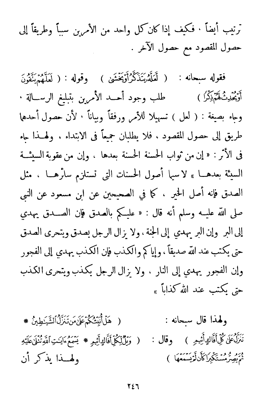 تَرْتِيبٌ أَيْضًا فَكَيْفَ إذَا كَانَ كُلُّ وَاحِدٍ مِنْ الْأَمْرَيْنِ سَبَبًا وَطَرِيقًا إلَى حُصُولِ الْمَقْصُودِ مَعَ حُصُولِ الْآخَرِ. فَقَوْلُهُ سُبْحَانَهُ: {لَعَلَّهُ يَتَذَكَّرُ أَوْ يَخْشَى} وَقَوْلُهُ: {لَعَلَّهُمْ يَتَّقُونَ أَوْ يُحْدِثُ لَهُمْ ذِكْرًا} طَلَبَ وُجُودَ أَحَدِ الْأَمْرَيْنِ بِتَبْلِيغِ الرِّسَالَةِ وَجَاءَ بِصِيغَةِ: (لَعَلَّ تَسْهِيلًا لِلْأَمْرِ وَرِفْقًا وَبَيَانًا لِأَنَّ حُصُولَ أَحَدِهِمَا طَرِيقٌ إلَى حُصُولِ الْمَقْصُودِ فَلَا يُطْلَبَانِ جَمِيعًا فِي الِابْتِدَاءِ وَلِهَذَا جَاءَ فِي الْأَثَرِ: {إنَّ مِنْ ثَوَابِ الْحَسَنَةِ الْحَسَنَةُ بَعْدَهَا وَإِنَّ مِنْ عُقُوبَةِ السَّيِّئَةِ السَّيِّئَةُ بَعْدَهَا} لَا سِيَّمَا أُصُولُ الْحَسَنَاتِ الَّتِي تَسْتَلْزِمُ سَائِرَهَا مِثْلَ الصِّدْقِ فَإِنَّهُ أَصْلُ الْخَيْرِ كَمَا فِي الصَّحِيحَيْنِ عَنْ ابْنِ مَسْعُودٍ عَنْ النَّبِيِّ صَلَّى اللَّهُ عَلَيْهِ وَسَلَّمَ أَنَّهُ قَالَ: {عَلَيْكُمْ بِالصِّدْقِ فَإِنَّ الصِّدْقَ يَهْدِي إلَى الْبِرِّ وَإِنَّ الْبِرَّ يَهْدِي إلَى الْجَنَّةِ وَلَا يَزَالُ الرَّجُلُ يَصْدُقُ وَيَتَحَرَّى الصِّدْقَ حَتَّى يُكْتَبَ عِنْدَ اللَّهِ صِدِّيقًا وَإِيَّاكُمْ وَالْكَذِبَ فَإِنَّ الْكَذِبَ يَهْدِي إلَى الْفُجُورِ وَإِنَّ الْفُجُورَ يَهْدِي إلَى النَّارِ وَلَا يَزَالُ الرَّجُلُ يَكْذِبُ وَيَتَحَرَّى الْكَذِبَ حَتَّى يُكْتَبَ عِنْدَ اللَّهِ كَذَّابًا.} وَلِهَذَا قَالَ سُبْحَانَهُ: {هَلْ أُنَبِّئُكُمْ عَلَى مَنْ تَنَزَّلُ الشَّيَاطِينُ} {تَنَزَّلُ عَلَى كُلِّ أَفَّاكٍ أَثِيمٍ} وَقَالَ: {وَيْلٌ لِكُلِّ أَفَّاكٍ أَثِيمٍ} {يَسْمَعُ آيَاتِ اللَّهِ تُتْلَى عَلَيْهِ ثُمَّ يُصِرُّ مُسْتَكْبِرًا كَأَنْ لَمْ يَسْمَعْهَا} وَلِهَذَا يُذْكَرُ أَنَّ