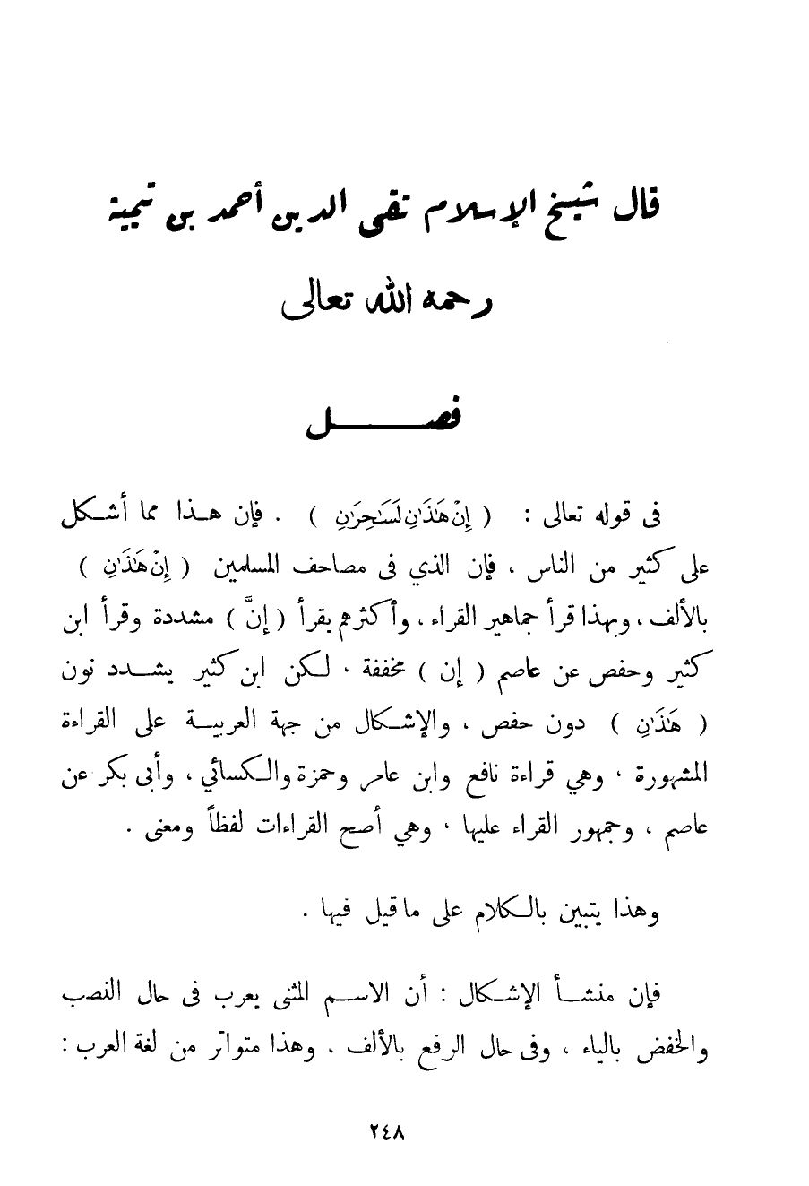فِي قَوْله تَعَالَى {إنْ هَذَانِ لَسَاحِرَانِ} . فَإِنَّ هَذَا مِمَّا أَشْكَلَ عَلَى كَثِيرٍ مِنْ النَّاسِ فَإِنَّ الَّذِي فِي مَصَاحِفِ الْمُسْلِمِينَ {إنْ هَذَانِ} بِالْأَلْفِ وَبِهَذَا قَرَأَ جَمَاهِيرُ الْقُرَّاءِ وَأَكْثَرُهُمْ يَقْرَأُ (إنْ) مُشَدَّدَةً وَقَرَأَ ابْنُ كَثِيرٍ وَحَفْصٌ عَنْ عَاصِمٍ (إنْ) مُخَفَّفَةً لَكِنْ ابْنُ كَثِيرٍ يُشَدِّدُ نُونَ (هَذَانِ) دُونَ حَفْصٍ وَالْإِشْكَالُ مِنْ جِهَةِ الْعَرَبِيَّةِ عَلَى الْقِرَاءَةِ الْمَشْهُورَةِ وَهِيَ قِرَاءَةُ نَافِعٍ وَابْنِ عَامِرٍ وَحَمْزَةَ وَالْكِسَائِيِّ وَأَبِي بَكْرٍ عَنْ عَاصِمٍ وَجُمْهُورُ الْقُرَّاءِ عَلَيْهَا وَهِيَ أَصَحُّ الْقِرَاءَاتِ لَفْظًا وَمَعْنَى. وَهَذَا يَتَبَيَّنُ بِالْكَلَامِ عَلَى مَا قِيلَ فِيهَا. فَإِنَّ مَنْشَأَ الْإِشْكَالِ: أَنَّ الِاسْمَ الْمُثَنَّى يُعْرَبُ فِي حَالِ النَّصْبِ وَالْخَفْضِ بِالْيَاءِ وَفِي حَالِ الرَّفْعِ بِالْأَلْفِ وَهَذَا مُتَوَاتِرٌ مِنْ لُغَةِ الْعَرَبِ: