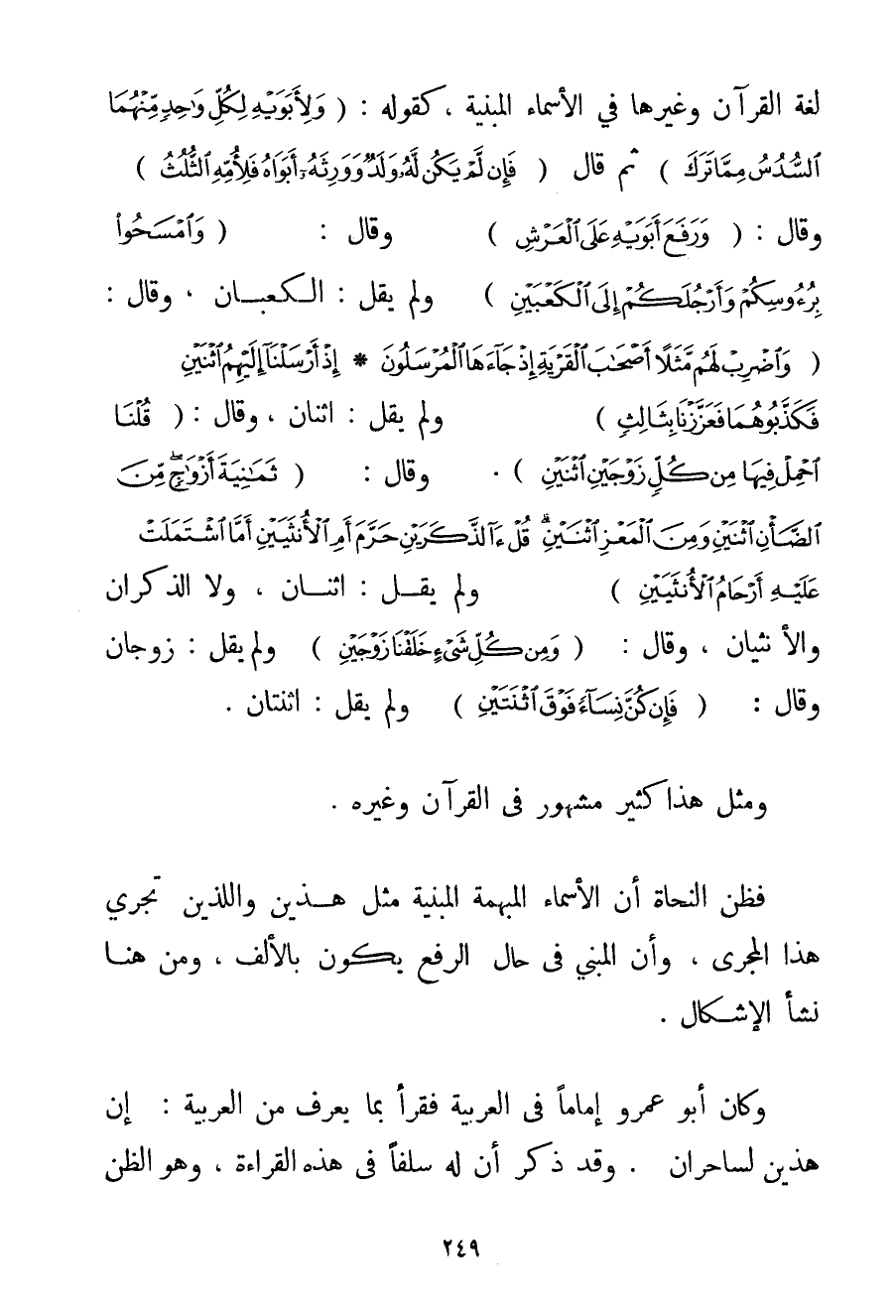 لُغَةِ الْقُرْآنِ وَغَيْرِهَا فِي الْأَسْمَاءِ الْمَبْنِيَّةِ كَقَوْلِهِ: {وَلِأَبَوَيْهِ لِكُلِّ وَاحِدٍ مِنْهُمَا السُّدُسُ مِمَّا تَرَكَ} ثُمَّ قَالَ {فَإِنْ لَمْ يَكُنْ لَهُ وَلَدٌ وَوَرِثَهُ أَبَوَاهُ فَلِأُمِّهِ الثُّلُثُ} وَقَالَ: {وَرَفَعَ أَبَوَيْهِ عَلَى الْعَرْشِ} وَقَالَ: {وَامْسَحُوا بِرُءُوسِكُمْ وَأَرْجُلَكُمْ إلَى الْكَعْبَيْنِ} وَلَمْ يَقُلْ: الْكَعْبَانِ وَقَالَ: {وَاضْرِبْ لَهُمْ مَثَلًا أَصْحَابَ الْقَرْيَةِ إذْ جَاءَهَا الْمُرْسَلُونَ} {إذْ أَرْسَلْنَا إلَيْهِمُ اثْنَيْنِ فَكَذَّبُوهُمَا فَعَزَّزْنَا بِثَالِثٍ} وَلَمْ يَقُلْ: اثْنَانِ وَقَالَ: {قُلْنَا احْمِلْ فِيهَا مِنْ كُلٍّ زَوْجَيْنِ اثْنَيْنِ} . وَقَالَ: {ثَمَانِيَةَ أَزْوَاجٍ مِنَ الضَّأْنِ اثْنَيْنِ وَمِنَ الْمَعْزِ اثْنَيْنِ قُلْ آلذَّكَرَيْنِ حَرَّمَ أَمِ الْأُنْثَيَيْنِ أَمَّا اشْتَمَلَتْ عَلَيْهِ أَرْحَامُ الْأُنْثَيَيْنِ} وَلَمْ يَقُلْ: اثْنَانِ وَلَا الذَّكَرَانِ وَالْأُنْثَيَانِ وَقَالَ: {وَمِنْ كُلِّ شَيْءٍ خَلَقْنَا زَوْجَيْنِ} وَلَمْ يَقُلْ: زَوْجَانِ وَقَالَ: {فَإِنْ كُنَّ نِسَاءً فَوْقَ اثْنَتَيْنِ} وَلَمْ يَقُلْ: اثْنَتَانِ. وَمِثْلُ هَذَا كَثِيرٌ مَشْهُورٌ فِي الْقُرْآنِ وَغَيْرِهِ. فَظَنَّ النُّحَاةُ أَنَّ الْأَسْمَاءَ الْمُبْهَمَةَ الْمَبْنِيَّةَ مِثْلَ هَذَيْنِ وَاَللَّذَيْنِ تَجْرِي هَذَا الْمَجْرَى وَأَنَّ الْمَبْنِيَّ فِي حَالِ الرَّفْعِ يَكُونُ بِالْأَلِفِ وَمِنْ هُنَا نَشَأَ الْإِشْكَالُ. وَكَانَ أَبُو عَمْرٍو إمَامًا فِي الْعَرَبِيَّةِ فَقَرَأَ بِمَا يَعْرِفُ مِنْ الْعَرَبِيَّةِ: إنَّ هَذَيْنِ لَسَاحِرَانِ. وَقَدْ ذَكَرَ أَنَّ لَهُ سَلَفًا فِي هَذِهِ الْقِرَاءَةِ وَهُوَ الظَّنُّ