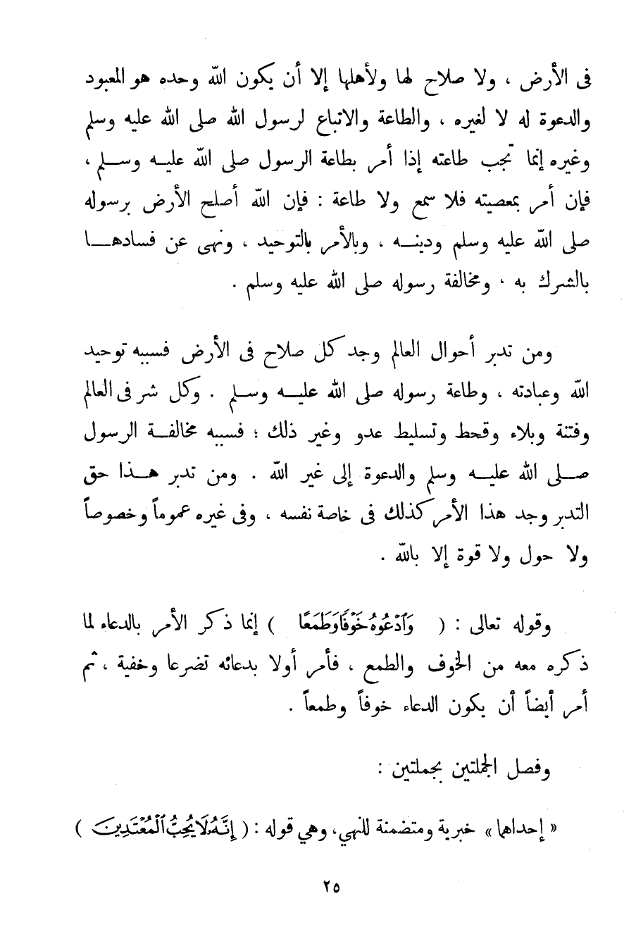 فِي الْأَرْضِ وَلَا صَلَاحَ لَهَا وَلِأَهْلِهَا إلَّا أَنْ يَكُونَ اللَّهُ وَحْدَهُ هُوَ الْمَعْبُودُ وَالدَّعْوَةُ لَهُ لَا لِغَيْرِهِ وَالطَّاعَةُ وَالِاتِّبَاعُ لِرَسُولِ اللَّهِ صَلَّى اللَّهُ عَلَيْهِ وَسَلَّمَ وَغَيْرُهُ إنَّمَا تَجِبُ طَاعَتُهُ إذَا أَمَرَ بِطَاعَةِ الرَّسُولِ صَلَّى اللَّهُ عَلَيْهِ وَسَلَّمَ فَإِنْ أَمَرَ بِمَعْصِيَتِهِ فَلَا سَمْعَ وَلَا طَاعَةَ: فَإِنَّ اللَّهَ أَصْلَحَ الْأَرْضَ بِرَسُولِهِ صَلَّى اللَّهُ عَلَيْهِ وَسَلَّمَ وَدِينِهِ وَبِالْأَمْرِ بِالتَّوْحِيدِ وَنَهَى عَنْ فَسَادِهَا بِالشِّرْكِ بِهِ وَمُخَالَفَةِ رَسُولِهِ صَلَّى اللَّهُ عَلَيْهِ وَسَلَّمَ. وَمَنْ تَدَبَّرَ أَحْوَالَ الْعَالَمِ وَجَدَ كُلَّ صَلَاحٍ فِي الْأَرْضِ فَسَبَبُهُ تَوْحِيدُ اللَّهِ وَعِبَادَتُهُ وَطَاعَةُ رَسُولِهِ صَلَّى اللَّهُ عَلَيْهِ وَسَلَّمَ. وَكُلُّ شَرٍّ فِي الْعَالِمِ وَفِتْنَةٍ وَبَلَاءٍ وَقَحْطٍ وَتَسْلِيطِ عَدُوٍّ وَغَيْرِ ذَلِكَ؛ فَسَبَبُهُ مُخَالَفَةُ الرَّسُولِ صَلَّى اللَّهُ عَلَيْهِ وَسَلَّمَ وَالدَّعْوَةُ إلَى غَيْرِ اللَّهِ. وَمَنْ تَدَبَّرَ هَذَا حَقَّ التَّدَبُّرِ وَجَدَ هَذَا الْأَمْرَ كَذَلِكَ فِي خَاصَّةِ نَفْسِهِ وَفِي غَيْرِهِ عُمُومًا وَخُصُوصًا وَلَا حَوْلَ وَلَا قُوَّةَ إلَّا بِاَللَّهِ. وقَوْله تَعَالَى {وَادْعُوهُ خَوْفًا وَطَمَعًا} إنَّمَا ذَكَرَ الْأَمْرَ بِالدُّعَاءِ لَمَّا ذَكَرَهُ مَعَهُ مِنْ الْخَوْفِ وَالطَّمَعِ فَأَمَرَ أَوَّلًا بِدُعَائِهِ تَضَرُّعًا وَخُفْيَةً ثُمَّ أَمَرَ أَيْضًا أَنْ يَكُونَ الدُّعَاءُ خَوْفًا وَطَمَعًا. وَفَصَلَ الْجُمْلَتَيْنِ بِجُمْلَتَيْنِ: " إحْدَاهُمَا " خَبَرِيَّةٌ وَمُتَضَمِّنَةٌ لِلنَّهْيِ وَهِيَ قَوْلُهُ: {إنَّهُ لَا يُحِبُّ الْمُعْتَدِينَ} .