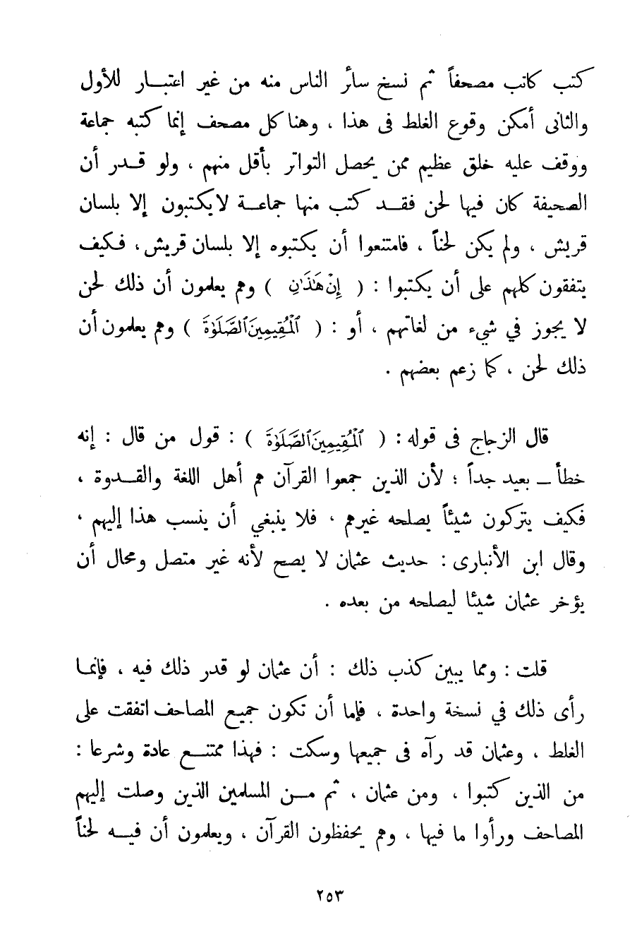 كَتَبَ كَاتِبٌ مُصْحَفًا ثُمَّ نَسَخَ سَائِرُ النَّاسِ مِنْهُ مِنْ غَيْرِ اعْتِبَارٍ لِلْأَوَّلِ وَالثَّانِي أَمْكَنَ وُقُوعُ الْغَلَطِ فِي هَذَا وَهُنَا كُلُّ مُصْحَفٍ إنَّمَا كَتَبَهُ جَمَاعَةٌ وَوَقَفَ عَلَيْهِ خَلْقٌ عَظِيمٌ مِمَّنْ يَحْصُلُ التَّوَاتُرُ بِأَقَلَّ مِنْهُمْ وَلَوْ قُدِّرَ أَنَّ الصَّحِيفَةَ كَانَ فِيهَا لَحْنٌ فَقَدْ كَتَبَ مِنْهَا جَمَاعَةٌ لَا يَكْتُبُونَ إلَّا بِلِسَانِ قُرَيْشٍ وَلَمْ يَكُنْ لَحْنًا فَامْتَنَعُوا أَنْ يَكْتُبُوهُ إلَّا بِلِسَانِ قُرَيْشٍ فَكَيْفَ يَتَّفِقُونَ كُلُّهُمْ عَلَى أَنْ يَكْتُبُوا: {إنْ هَذَانِ} وَهُمْ يَعْلَمُونَ أَنَّ ذَلِكَ لَحْنٌ لَا يَجُوزُ فِي شَيْءٍ مِنْ لُغَاتِهِمْ أَوْ: {الْمُقِيمِينَ الصَّلَاةَ} وَهُمْ يَعْلَمُونَ أَنَّ ذَلِكَ لَحْنٌ كَمَا زَعَمَ بَعْضُهُمْ. قَالَ الزَّجَّاجُ فِي قَوْلِهِ: {الْمُقِيمِينَ الصَّلَاةَ} قَوْلُ مَنْ قَالَ: إنَّهُ خَطَأٌ - بَعِيدٌ جِدًّا؛ لِأَنَّ الَّذِينَ جَمَعُوا الْقُرْآنَ هُمْ أَهْلُ اللُّغَةِ وَالْقُدْوَةُ فَكَيْفَ يَتْرُكُونَ شَيْئًا يُصْلِحُهُ غَيْرُهُمْ فَلَا يَنْبَغِي أَنْ يُنْسَبَ هَذَا إلَيْهِمْ وَقَالَ ابْنُ الْأَنْبَارِيِّ: حَدِيثُ عُثْمَانَ لَا يَصِحُّ لِأَنَّهُ غَيْرُ مُتَّصِلٍ وَمُحَالٍ أَنْ يُؤَخِّرَ عُثْمَانُ شَيْئًا لِيُصْلِحَهُ مَنْ بَعْدَهُ. قُلْت: وَمِمَّا يُبَيِّنُ كَذِبَ ذَلِكَ: أَنَّ عُثْمَانَ لَوْ قُدِّرَ ذَلِكَ فِيهِ فَإِنَّمَا رَأَى ذَلِكَ فِي نُسْخَةٍ وَاحِدَةٍ فَإِمَّا أَنْ تَكُونَ جَمِيعُ الْمَصَاحِفِ اتَّفَقَتْ عَلَى الْغَلَطِ وَعُثْمَانُ قَدْ رَآهُ فِي جَمِيعِهَا وَسَكَتَ: فَهَذَا مُمْتَنِعٌ عَادَةً وَشَرْعًا: مِنْ الَّذِينَ كَتَبُوا وَمِنْ عُثْمَانَ ثُمَّ مِنْ الْمُسْلِمِينَ الَّذِينَ وَصَلَتْ إلَيْهِمْ الْمَصَاحِفُ وَرَأَوْا مَا فِيهَا وَهُمْ يَحْفَظُونَ الْقُرْآنَ وَيَعْلَمُونَ أَنَّ فِيهِ لَحْنًا