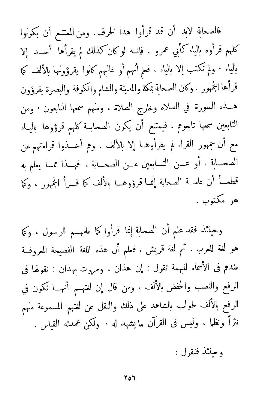 فَالصَّحَابَةُ لَا بُدَّ أَنْ قَدْ قَرَءُوا هَذَا الْحَرْفَ وَمِنْ الْمُمْتَنِعِ أَنْ يَكُونُوا كُلُّهُمْ قَرَءُوهُ بِالْيَاءِ كَأَبِي عَمْرٍو فَإِنَّهُ لَوْ كَانَ كَذَلِكَ لَمْ يَقْرَأْهَا أَحَدٌ إلَّا بِالْيَاءِ وَلَمْ تُكْتَبْ إلَّا بِالْيَاءِ فَعُلِمَ أَنَّهُمْ أَوْ غَالَبَهُمْ كَانُوا يَقْرَءُونَهَا بِالْأَلِفِ كَمَا قَرَأَهَا الْجُمْهُورُ وَكَانَ الصَّحَابَةُ بِمَكَّةَ وَالْمَدِينَةِ وَالشَّامِ وَالْكُوفَةِ وَالْبَصْرَةِ يَقْرَءُونَ هَذِهِ السُّورَةَ فِي الصَّلَاةِ وَخَارِجَ الصَّلَاةِ وَمِنْهُمْ سَمِعَهَا التَّابِعُونَ وَمِنْ التَّابِعَيْنِ سَمِعَهَا تَابِعُوهُمْ فَيَمْتَنِعُ أَنْ يَكُونَ الصَّحَابَةُ كُلُّهُمْ قَرَءُوهَا بِالْيَاءِ مَعَ أَنَّ جُمْهُورَ الْقُرَّاءِ لَمْ يَقْرَءُوهَا إلَّا بِالْأَلِفِ وَهُمْ أَخَذُوا قِرَاءَتَهُمْ عَنْ الصَّحَابَةِ أَوْ عَنْ التَّابِعَيْنِ عَنْ الصَّحَابَةِ فَهَذَا مِمَّا يُعْلَمُ بِهِ قَطْعًا أَنَّ عَامَّةَ الصَّحَابَةِ إنَّمَا قَرَءُوهَا بِالْأَلِفِ كَمَا قَرَأَ الْجُمْهُورُ وَكَمَا هُوَ مَكْتُوبٌ. وَحِينَئِذٍ فَقَدْ عُلِمَ أَنَّ الصَّحَابَةَ إنَّمَا قَرَءُوا كَمَا عَلَّمَهُمْ الرَّسُولُ وَكَمَا هُوَ لُغَةٌ لِلْعَرَبِ ثُمَّ لُغَةُ قُرَيْشٍ فَعُلِمَ أَنَّ هَذِهِ اللُّغَةَ الْفَصِيحَةَ الْمَعْرُوفَةَ عِنْدَهُمْ فِي الْأَسْمَاءِ الْمُبْهَمَةِ تَقُولُ: إنْ هَذَانِ وَمَرَرْت بِهَذَانِ: تَقُولُهَا فِي الرَّفْعِ وَالنَّصْبِ وَالْخَفْضِ بِالْأَلِفِ وَمَنْ قَالَ إنَّ لُغَتَهُمْ أَنَّهَا تَكُونُ فِي الرَّفْعِ بِالْأَلِفِ طُولِبَ بِالشَّاهِدِ عَلَى ذَلِكَ وَالنَّقْلِ عَنْ لُغَتِهِمْ الْمَسْمُوعَةِ مِنْهُمْ نَثْرًا وَنَظْمًا وَلَيْسَ فِي الْقُرْآنِ مَا يَشْهَدُ لَهُ وَلَكِنْ عُمْدَتُهُ الْقِيَاسُ. وَحِينَئِذٍ فَنَقُولُ: