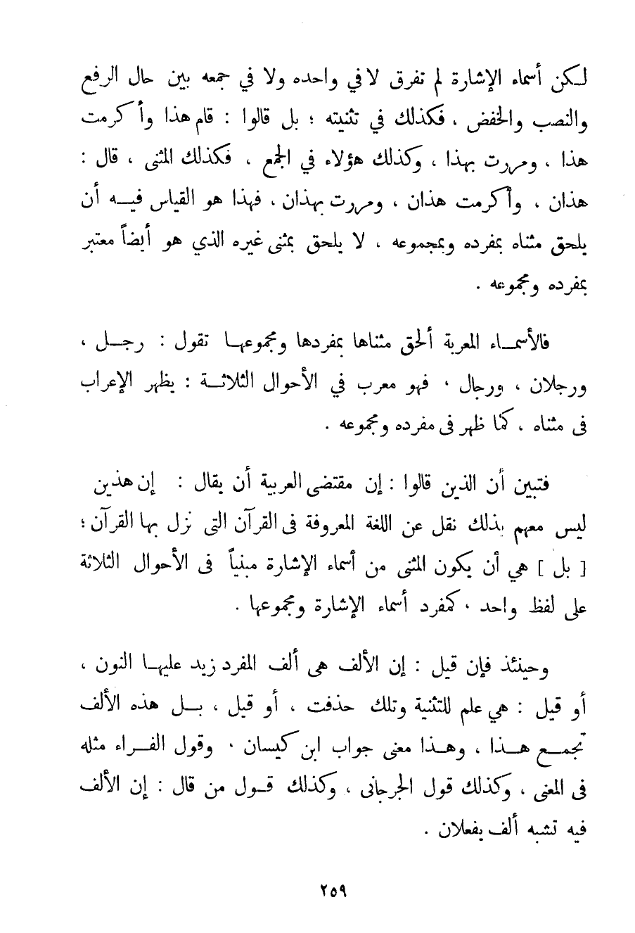 لَكِنَّ أَسْمَاءَ الْإِشَارَةِ لَمْ تُفَرِّقْ لَا فِي وَاحِدِهِ وَلَا فِي جَمْعِهِ بَيْنَ حَالِ الرَّفْعِ وَالنَّصْبِ وَالْخَفْضِ فَكَذَلِكَ فِي تَثْنِيَتِهِ؛ بَلْ قَالُوا: قَامَ هَذَا وَأَكْرَمْت هَذَا وَمَرَرْت بِهَذَا وَكَذَلِكَ هَؤُلَاءِ فِي الْجَمْعِ فَكَذَلِكَ الْمُثَنَّى قَالَ: هَذَانِ وَأَكْرَمْت هَذَانِ وَمَرَرْت بِهَذَانِ فَهَذَا هُوَ الْقِيَاسُ فِيهِ أَنْ يُلْحَقَ مُثَنَّاهُ بِمُفْرَدِهِ وَبِمَجْمُوعِهِ لَا يُلْحَقَ بِمُثَنَّى غَيْرِهِ الَّذِي هُوَ أَيْضًا مُعْتَبَرٌ بِمُفْرَدِهِ وَمَجْمُوعِهِ. فَالْأَسْمَاءُ الْمُعْرَبَةُ أُلْحِقَ مُثَنَّاهَا بِمُفْرَدِهَا وَمَجْمُوعِهَا تَقُولُ: رَجُلٌ وَرَجُلَانِ وَرِجَالٌ فَهُوَ مُعَرَّبٌ فِي الْأَحْوَالِ الثَّلَاثَةِ: يَظْهَرُ الْإِعْرَابُ فِي مُثَنَّاهُ كَمَا ظَهَرَ فِي مُفْرَدِهِ وَمَجْمُوعِهِ. فَتَبَيَّنَ أَنَّ الَّذِينَ قَالُوا: إنَّ مُقْتَضَى الْعَرَبِيَّةِ أَنْ يُقَالَ: إنَّ هَذَيْنِ لَيْسَ مَعَهُمْ بِذَلِكَ نَقْلٌ عَنْ اللُّغَةِ الْمَعْرُوفَةِ فِي الْقُرْآنِ الَّتِي نَزَلَ بِهَا الْقُرْآنُ؛ بَلْ هِيَ أَنْ يَكُونَ الْمُثَنَّى مِنْ أَسْمَاءِ الْإِشَارَةِ مَبْنِيًّا فِي الْأَحْوَالِ الثَّلَاثَةِ عَلَى لَفْظٍ وَاحِدٍ كَمُفْرَدِ أَسْمَاءِ الْإِشَارَةِ وَمَجْمُوعِهَا. وَحِينَئِذٍ فَإِنْ قِيلَ: إنَّ الْأَلِفَ هِيَ أَلِفُ الْمُفْرَدِ زِيدَ عَلَيْهَا النُّونُ أَوْ قِيلَ: هِيَ عَلَمٌ لِلتَّثْنِيَةِ وَتِلْكَ حُذِفَتْ أَوْ قِيلَ بَلْ هَذِهِ الْأَلِفُ تَجْمَعُ هَذَا وَهَذَا مَعْنًى جَوَابُ ابْنُ كيسان وَقَوْلُ الْفَرَّاءِ مِثْلُهُ فِي الْمَعْنَى وَكَذَلِكَ قَوْلُ الجرجاني وَكَذَلِكَ قَوْلُ مَنْ قَالَ: إنَّ الْأَلِفَ فِيهِ تُشْبِهُ أَلِفَ يَفْعَلَانِ.