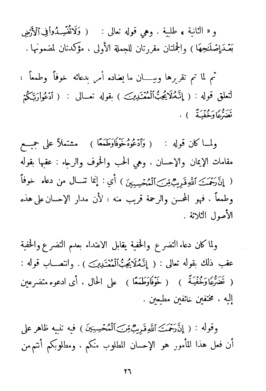 و " الثَّانِيَةُ " طَلَبِيَّةٌ. وَهِيَ قَوْله تَعَالَى {وَلَا تُفْسِدُوا فِي الْأَرْضِ بَعْدَ إصْلَاحِهَا} وَالْجُمْلَتَانِ مُقَرِّرَتَانِ لِلْجُمْلَةِ الْأُولَى مُؤَكِّدَتَانِ لِمَضْمُونِهَا. ثُمَّ لَمَّا تَمَّ تَقْرِيرُهَا وَبَيَانُ مَا يُضَادُّهُ أَمَرَ بِدُعَائِهِ خَوْفًا وَطَمَعًا؛ لِتَعَلُّقِ قَوْلِهِ {إنَّهُ لَا يُحِبُّ الْمُعْتَدِينَ} بِقَوْلِهِ تَعَالَى: {ادْعُوا رَبَّكُمْ تَضَرُّعًا وَخُفْيَةً} . وَلَمَّا كَانَ قَوْلُهُ: {وَادْعُوهُ خَوْفًا وَطَمَعًا} مُشْتَمِلًا عَلَى جَمِيعِ مَقَامَاتِ الْإِيمَانِ وَالْإِحْسَانِ وَهِيَ الْحُبُّ وَالْخَوْفُ وَالرَّجَاءُ: عَقَّبَهَا بِقَوْلِهِ {إنَّ رَحْمَةَ اللَّهِ قَرِيبٌ مِنَ الْمُحْسِنِينَ} أَيْ: إنَّمَا تَنَالُ مَنْ دَعَاهُ خَوْفًا وَطَمَعًا فَهُوَ الْمُحْسِنُ وَالرَّحْمَةُ قَرِيبٌ مِنْهُ؛ لِأَنَّ مَدَارَ الْإِحْسَانِ عَلَى هَذِهِ الْأُصُولِ الثَّلَاثَةِ. وَلَمَّا كَانَ دُعَاءُ التَّضَرُّعِ وَالْخُفْيَةِ يُقَابِلُ الِاعْتِدَاءَ بِعَدَمِ التَّضَرُّعِ وَالْخُفْيَةِ عَقَّبَ ذَلِكَ بِقَوْلِهِ تَعَالَى: {إنَّهُ لَا يُحِبُّ الْمُعْتَدِينَ} . وَانْتِصَابُ قَوْلِهِ: {تَضَرُّعًا وَخُفْيَةً} {خَوْفًا وَطَمَعًا} عَلَى الْحَالِ أَيْ اُدْعُوهُ مُتَضَرِّعِينَ إلَيْهِ مُخْتَفِينَ خَائِفِينَ مُطِيعِينَ. وَقَوْلُهُ: {إنَّ رَحْمَةَ اللَّهِ قَرِيبٌ مِنَ الْمُحْسِنِينَ} فِيهِ تَنْبِيهٌ ظَاهِرٌ عَلَى أَنَّ فِعْلَ هَذَا الْمَأْمُورِ هُوَ الْإِحْسَانُ الْمَطْلُوبُ مِنْكُمْ وَمَطْلُوبُكُمْ أَنْتُمْ مِنْ