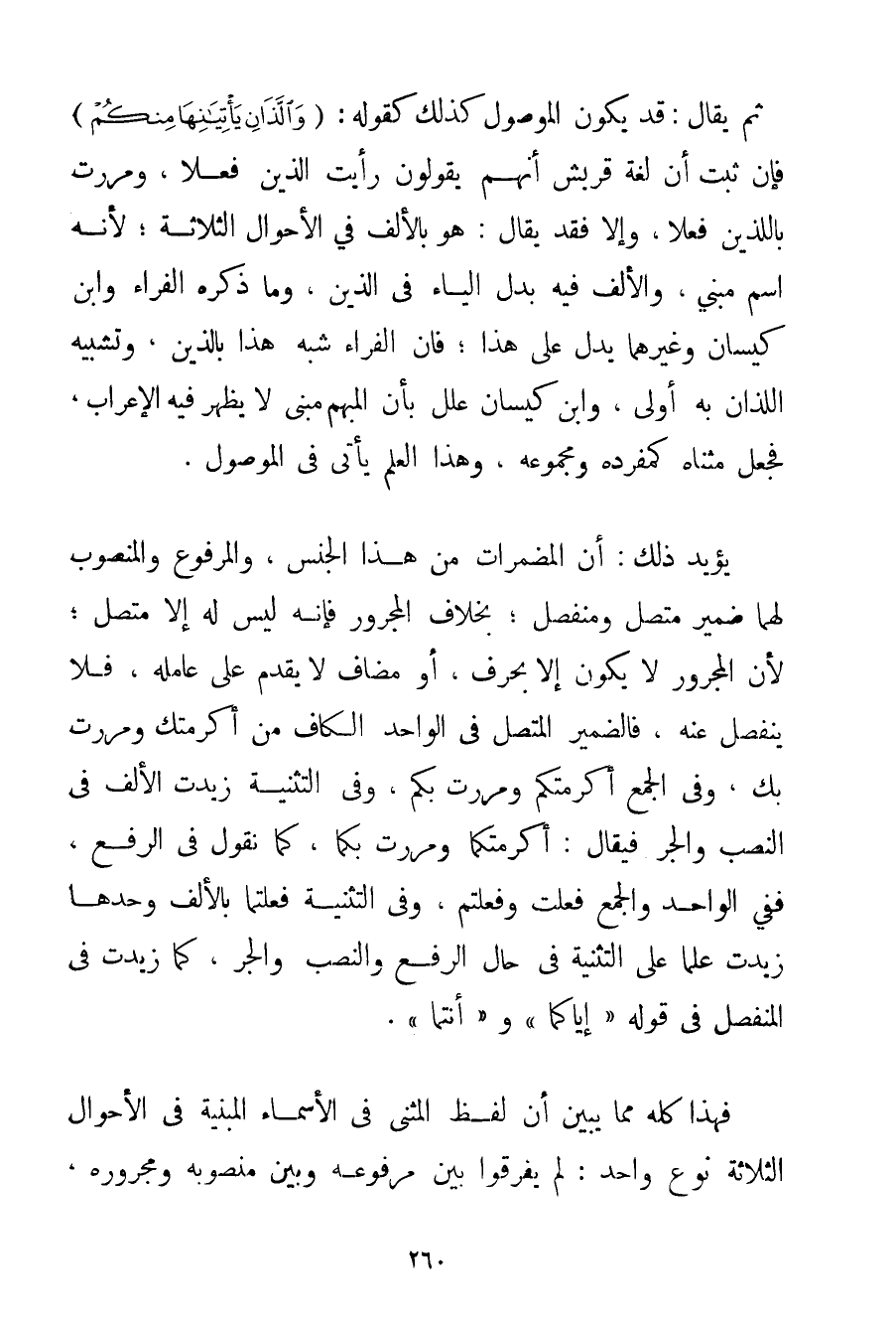 ثُمَّ يُقَالُ: قَدْ يَكُونُ الْمَوْصُولُ كَذَلِكَ كَقَوْلِهِ: {وَاللَّذَانِ يَأْتِيَانِهَا مِنْكُمْ} فَإِنْ ثَبَتَ أَنَّ لُغَةَ قُرَيْشٍ أَنَّهُمْ يَقُولُونَ رَأَيْت الْذَيْنِ فَعَلَا وَمَرَرْت بِاَللَّذَيْنِ فَعَلَا وَإِلَّا فَقَدْ يُقَالُ: هُوَ بِالْأَلِفِ فِي الْأَحْوَالِ الثَّلَاثَةِ؛ لِأَنَّهُ اسْمٌ مَبْنِيٌّ وَالْأَلِفُ فِيهِ بَدَلُ الْيَاءِ فِي الَّذِينَ وَمَا ذَكَرَهُ الْفَرَّاءُ وَابْنُ كيسان وَغَيْرُهُمَا يَدُلُّ عَلَى هَذَا؛ فَإِنَّ الْفَرَّاءَ شَبَّهَ هَذَا بالذين وَتَشْبِيهُ اللَّذَانِ بِهِ أَوْلَى وَابْنُ كيسان عَلَّلَ بِأَنَّ الْمُبْهَمَ مَبْنِيٌّ لَا يَظْهَرُ فِيهِ الْإِعْرَابُ فَجَعَلَ مُثَنَّاهُ كَمُفْرَدِهِ وَمَجْمُوعِهِ وَهَذَا الْعِلْمُ يَأْتِي فِي الْمَوْصُولِ. يُؤَيِّدُ ذَلِكَ: أَنَّ الْمُضْمَرَاتِ مِنْ هَذَا الْجِنْسِ وَالْمَرْفُوعَ وَالْمَنْصُوبَ لَهُمَا ضَمِيرٌ مُتَّصِلٌ وَمُنْفَصِلٌ؛ بِخِلَافِ الْمَجْرُورِ فَإِنَّهُ لَيْسَ لَهُ إلَّا مُتَّصِلٌ؛ لِأَنَّ الْمَجْرُورَ لَا يَكُونُ إلَّا بِحَرْفِ أَوْ مُضَافٌ لَا يُقَدَّمُ عَلَى عَامِلِهِ فَلَا يَنْفَصِلُ عَنْهُ فَالضَّمِيرُ الْمُتَّصِلُ فِي الْوَاحِدِ الْكَافُ مِنْ أَكْرَمْتُك وَمَرَرْت بِك وَفِي الْجَمْعِ أَكْرَمْتُكُمْ وَمَرَرْت بِكُمْ وَفِي التَّثْنِيَةِ زِيدَتْ الْأَلِفُ فِي النَّصْبِ وَالْجَرِّ فَيُقَالُ: أَكْرَمْتُكُمَا وَمَرَرْت بِكُمَا كَمَا نَقُولُ فِي الرَّفْعِ فَفِي الْوَاحِدِ وَالْجَمْعِ فَعَلْت وَفَعَلْتُمْ وَفِي التَّثْنِيَةِ فَعَلْتُمَا بِالْأَلِفِ وَحْدَهَا زِيدَتْ عَلَمًا عَلَى التَّثْنِيَةِ فِي حَالِ الرَّفْعِ وَالنَّصْبِ وَالْجَرِّ كَمَا زِيدَتْ فِي الْمُنْفَصِلِ فِي قَوْلِهِ " إيَّاكُمَا " و " أَنْتُمَا ". فَهَذَا كُلُّهُ مِمَّا يُبَيِّنُ أَنَّ لَفْظَ الْمُثَنَّى فِي الْأَسْمَاءِ الْمَبْنِيَّةِ فِي الْأَحْوَالِ الثَّلَاثَةِ نَوْعٌ وَاحِدٌ: لَمْ يُفَرِّقُوا بَيْنَ مَرْفُوعِهِ وَبَيْنَ مَنْصُوبِهِ وَمَجْرُورِهِ