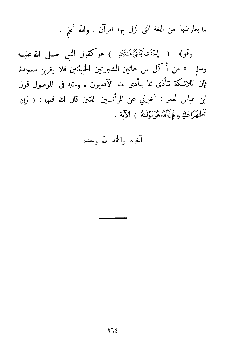 مَا يُعَارِضُهَا مِنْ اللُّغَةِ الَّتِي نَزَلَ بِهَا الْقُرْآنُ. وَاَللَّهُ أَعْلَمُ. وَقَوْلُهُ: {إحْدَى ابْنَتَيَّ هَاتَيْنِ} هُوَ كَقَوْلِ النَّبِيِّ صَلَّى اللَّهُ عَلَيْهِ وَسَلَّمَ {مَنْ أَكَلَ مِنْ هَاتَيْنِ الشَّجَرَتَيْنِ الْخَبِيثَتَيْنِ فَلَا يَقْرَبَنَّ مَسْجِدَنَا فَإِنَّ الْمَلَائِكَةَ تَتَأَذَّى مِمَّا يَتَأَذَّى مِنْهُ الْآدَمِيُّونَ} وَمِثْلُهُ فِي الْمَوْصُولِ قَوْلُ ابْنِ عَبَّاسٍ لِعُمَرِ: أَخْبِرْنِي عَنْ الْمَرْأَتَيْنِ اللَّتَيْنِ قَالَ اللَّهُ فِيهِمَا: {وَإِنْ تَظَاهَرَا عَلَيْهِ فَإِنَّ اللَّهَ هُوَ مَوْلَاهُ} الْآيَةُ. آخِرُهُ وَالْحَمْدُ لِلَّهِ وَحْدَهُ