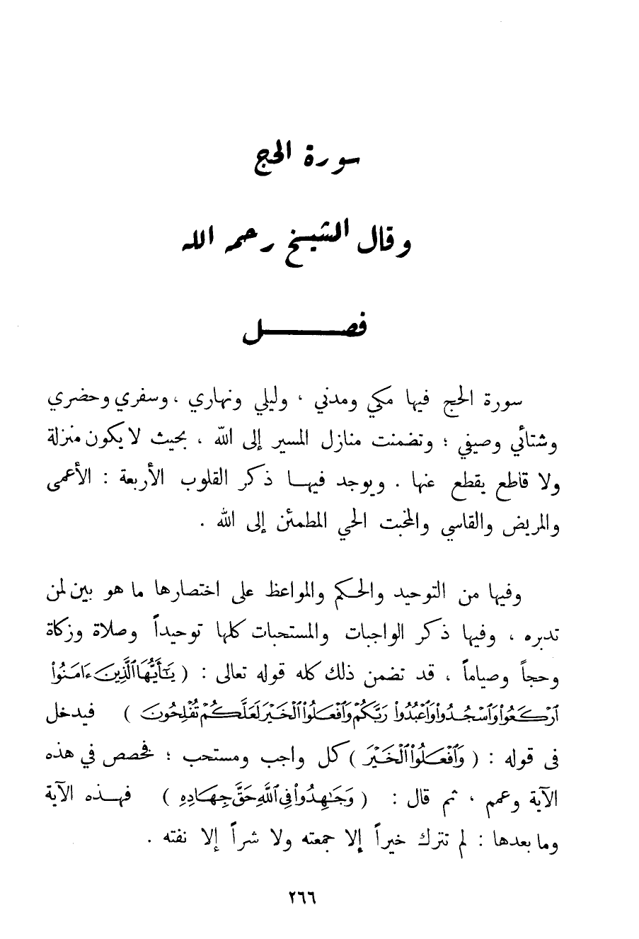 سُورَةُ الْحَجِّ فِيهَا مَكِّيٌّ وَمَدَنِيٌّ وَلَيْلِيٌّ وَنَهَارِيٌّ وَسَفَرِيٌّ وَحَضَرِيٌّ وَشِتَائِيٌّ وَصَيْفِيٌّ؛ وَتَضَمَّنَتْ مَنَازِلَ الْمَسِيرِ إلَى اللَّهِ بِحَيْثُ لَا يَكُونُ مَنْزِلَةٌ وَلَا قَاطِعٌ يَقْطَعُ عَنْهَا. وَيُوجَدُ فِيهَا ذِكْرُ الْقُلُوبِ الْأَرْبَعَةِ: الْأَعْمَى وَالْمَرِيضُ وَالْقَاسِي وَالْمُخْبِتُ الْحَيُّ الْمُطْمَئِنُّ إلَى اللَّهِ. وَفِيهَا مِنْ التَّوْحِيدِ وَالْحُكْمِ وَالْمَوَاعِظِ عَلَى اخْتِصَارِهَا مَا هُوَ بَيِّنٌ لِمَنْ تَدَبَّرَهُ وَفِيهَا ذِكْرُ الْوَاجِبَاتِ والمستحبات كُلُّهَا تَوْحِيدًا وَصَلَاةً وَزَكَاةً وَحَجًّا وَصِيَامًا قَدْ تَضَمَّنَ ذَلِكَ كُلَّهُ قَوْله تَعَالَى {يَا أَيُّهَا الَّذِينَ آمَنُوا ارْكَعُوا وَاسْجُدُوا وَاعْبُدُوا رَبَّكُمْ وَافْعَلُوا الْخَيْرَ لَعَلَّكُمْ تُفْلِحُونَ} فَيَدْخُلُ فِي قَوْلِهِ: {وَافْعَلُوا الْخَيْرَ} كُلُّ وَاجِبٍ وَمُسْتَحَبٍّ؛ فَخَصَّصَ فِي هَذِهِ الْآيَةِ وَعَمَّمَ ثُمَّ قَالَ: {وَجَاهِدُوا فِي اللَّهِ حَقَّ جِهَادِهِ} فَهَذِهِ الْآيَةُ وَمَا بَعْدَهَا: لَمْ تَتْرُكْ خَيْرًا إلَّا جَمَعَتْهُ وَلَا شَرًّا إلَّا نَفَتْهُ.