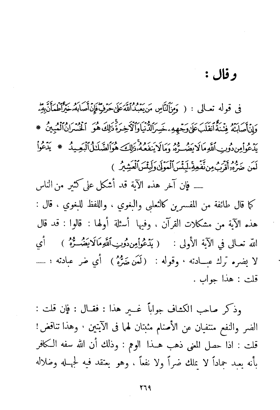 فِي قَوْله تَعَالَى {وَمِنَ النَّاسِ مَنْ يَعْبُدُ اللَّهَ عَلَى حَرْفٍ فَإِنْ أَصَابَهُ خَيْرٌ اطْمَأَنَّ بِهِ وَإِنْ أَصَابَتْهُ فِتْنَةٌ انْقَلَبَ عَلَى وَجْهِهِ خَسِرَ الدُّنْيَا وَالْآخِرَةَ ذَلِكَ هُوَ الْخُسْرَانُ الْمُبِينُ} {يَدْعُو مِنْ دُونِ اللَّهِ مَا لَا يَضُرُّهُ وَمَا لَا يَنْفَعُهُ ذَلِكَ هُوَ الضَّلَالُ الْبَعِيدُ} {يَدْعُو لَمَنْ ضَرُّهُ أَقْرَبُ مِنْ نَفْعِهِ لَبِئْسَ الْمَوْلَى وَلَبِئْسَ الْعَشِيرُ} فَإِنَّ آخِرَ هَذِهِ الْآيَةِ قَدْ أَشْكَلَ عَلَى كَثِيرٍ مِنْ النَّاسِ كَمَا قَالَ طَائِفَةٌ مِنْ الْمُفَسِّرِينَ كَالثَّعْلَبِيِّ والبغوي وَاللَّفْظُ للبغوي قَالَ: هَذِهِ الْآيَةُ مِنْ مُشْكِلَاتِ الْقُرْآنِ وَفِيهَا أَسْئِلَةٌ أَوَّلُهَا: قَالُوا: قَدْ قَالَ اللَّهُ تَعَالَى فِي الْآيَةِ الْأُولَى: {يَدْعُو مِنْ دُونِ اللَّهِ مَا لَا يَضُرُّهُ} أَيْ لَا يَضُرُّهُ تَرْكُ عِبَادَتِهِ وَقَوْلُهُ: {لَمَنْ ضَرُّهُ} أَيْ ضَرُّ عِبَادَتِهِ؛ - قُلْت: هَذَا جَوَابٌ. وَذَكَرَ صَاحِبُ الْكَشَّافِ جَوَابًا غَيْرَ هَذَا: فَقَالَ: فَإِنْ قُلْت: الضُّرُّ وَالنَّفْعُ مُنْتَفِيَانِ عَنْ الْأَصْنَامِ مُثْبَتَانِ لَهُمَا فِي الْآيَتَيْنِ وَهَذَا تَنَاقُضٌ قُلْت: إذَا حَصَلَ الْمَعْنَى ذَهَبَ هَذَا الْوَهْمُ: وَذَلِكَ أَنَّ اللَّهَ سَفَّهَ الْكَافِرَ بِأَنَّهُ يَعْبُدُ جَمَادًا لَا يَمْلِكُ ضُرًّا وَلَا نَفْعًا وَهُوَ يَعْتَقِدُ فِيهِ لِجَهْلِهِ وَضَلَالِهِ