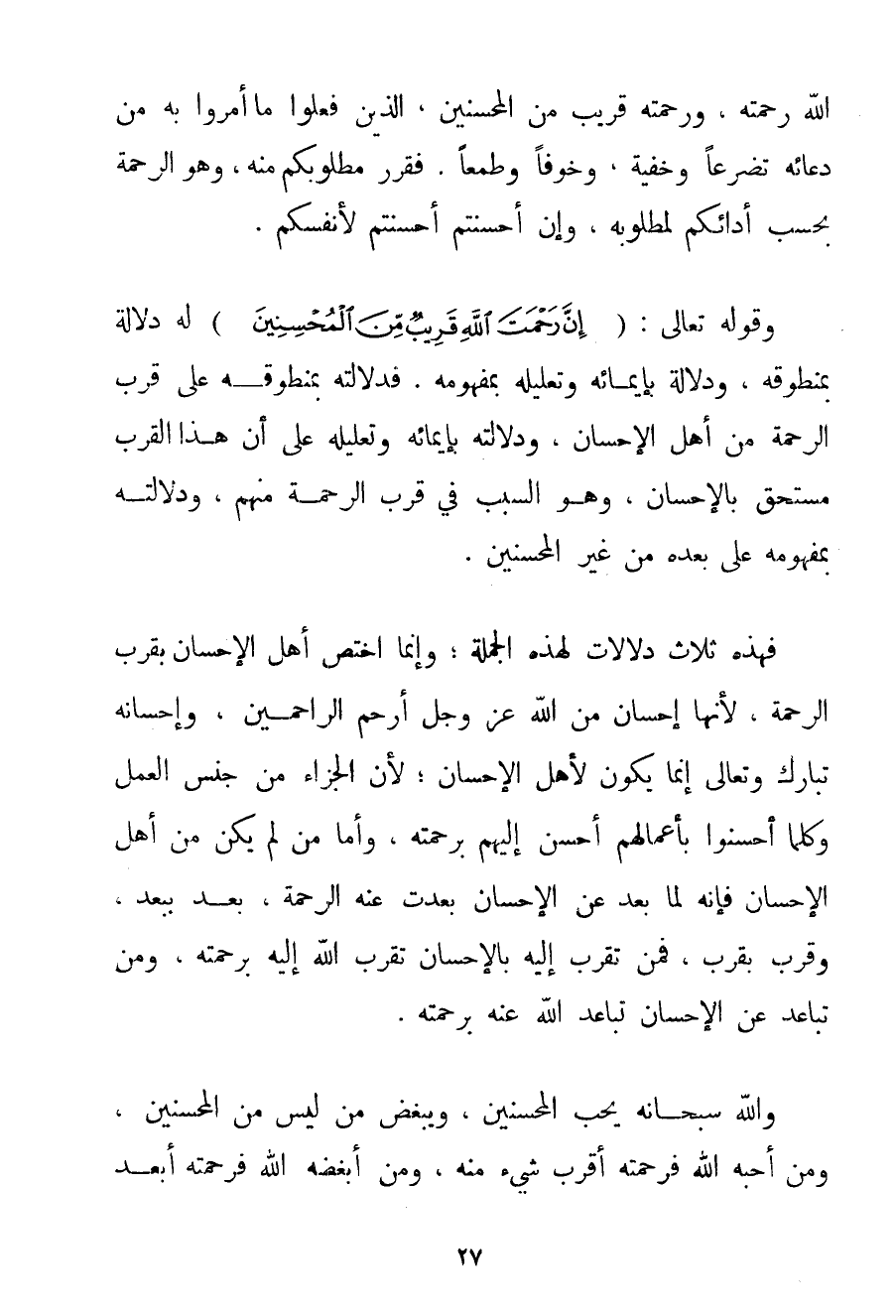 اللَّهِ رَحْمَتُهُ وَرَحْمَتُهُ قَرِيبٌ مِنْ الْمُحْسِنِينَ الَّذِينَ فَعَلُوا مَا أُمِرُوا بِهِ مِنْ دُعَائِهِ تَضَرُّعًا وَخُفْيَةً وَخَوْفًا وَطَمَعًا. فَقَرَّرَ مَطْلُوبَكُمْ مِنْهُ وَهُوَ الرَّحْمَةُ بِحَسَبِ أَدَائِكُمْ لِمَطْلُوبِهِ وَإِنْ أَحْسَنْتُمْ أَحْسَنْتُمْ لِأَنْفُسِكُمْ. وقَوْله تَعَالَى {إنَّ رَحْمَةَ اللَّهِ قَرِيبٌ مِنَ الْمُحْسِنِينَ} لَهُ دَلَالَةٌ بِمَنْطُوقِهِ وَدَلَالَةٌ بِإِيمَائِهِ وَتَعْلِيلِهِ بِمَفْهُومِهِ. فَدَلَالَتُهُ بِمَنْطُوقِهِ عَلَى قُرْبِ الرَّحْمَةِ مِنْ أَهْلِ الْإِحْسَانِ وَدَلَالَتُهُ بِإِيمَائِهِ وَتَعْلِيلِهِ عَلَى أَنَّ هَذَا الْقُرْبَ مُسْتَحَقٌّ بِالْإِحْسَانِ وَهُوَ السَّبَبُ فِي قُرْبِ الرَّحْمَةِ مِنْهُمْ وَدَلَالَتُهُ بِمَفْهُومِهِ عَلَى بُعْدِهِ مِنْ غَيْرِ الْمُحْسِنِينَ. فَهَذِهِ ثَلَاثُ دَلَالَاتِ لِهَذِهِ الْجُمْلَةِ؛ وَإِنَّمَا اُخْتُصَّ أَهْلُ الْإِحْسَانِ بِقُرْبِ الرَّحْمَةِ لِأَنَّهَا إحْسَانٌ مِنْ اللَّهِ عَزَّ وَجَلَّ أَرْحَمِ الرَّاحِمِينَ وَإِحْسَانُهُ تَبَارَكَ وَتَعَالَى إنَّمَا يَكُونُ لِأَهْلِ الْإِحْسَانِ؛ لِأَنَّ الْجَزَاءَ مِنْ جِنْسِ الْعَمَلِ وَكُلَّمَا أَحْسَنُوا بِأَعْمَالِهِمْ أَحْسَنَ إلَيْهِمْ بِرَحْمَتِهِ وَأَمَّا مَنْ لَمْ يَكُنْ مِنْ أَهْلِ الْإِحْسَانِ فَإِنَّهُ لَمَّا بَعُدَ عَنْ الْإِحْسَانِ بَعُدَتْ عَنْهُ الرَّحْمَةُ بُعْدٌ بِبُعْدِ وَقُرْبٌ بِقُرْبِ فَمَنْ تَقَرَّبَ إلَيْهِ بِالْإِحْسَانِ تَقَرَّبَ اللَّهُ إلَيْهِ بِرَحْمَتِهِ وَمَنْ تَبَاعَدَ عَنْ الْإِحْسَانِ تَبَاعَدَ اللَّهُ عَنْهُ بِرَحْمَتِهِ. وَاَللَّهُ سُبْحَانَهُ يُحِبُّ الْمُحْسِنِينَ وَيُبْغِضُ مَنْ لَيْسَ مِنْ الْمُحْسِنِينَ وَمَنْ أَحَبَّهُ اللَّهُ فَرَحْمَتُهُ أَقْرَبُ شَيْءٍ مِنْهُ وَمَنْ أَبْغَضَهُ اللَّهُ فَرَحْمَتُهُ أَبْعَدُ