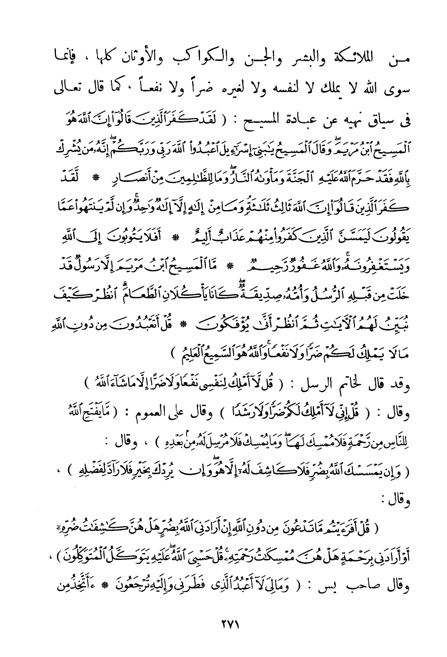 اللَّهِ مِنْ الْمَلَائِكَةِ وَالْبَشَرِ وَالْجِنِّ وَالْكَوَاكِبِ وَالْأَوْثَانِ كُلِّهَا فَإِنَّمَا سِوَى اللَّهِ لَا يَمْلِكُ لَا لِنَفْسِهِ وَلَا لِغَيْرِهِ ضُرًّا وَلَا نَفْعًا. كَمَا قَالَ تَعَالَى فِي سِيَاقِ نَهْيِهِ عَنْ عِبَادَةِ الْمَسِيحِ: {لَقَدْ كَفَرَ الَّذِينَ قَالُوا إنَّ اللَّهَ هُوَ الْمَسِيحُ ابْنُ مَرْيَمَ وَقَالَ الْمَسِيحُ يَا بَنِي إسْرَائِيلَ اعْبُدُوا اللَّهَ رَبِّي وَرَبَّكُمْ إنَّهُ مَنْ يُشْرِكْ بِاللَّهِ فَقَدْ حَرَّمَ اللَّهُ عَلَيْهِ الْجَنَّةَ وَمَأْوَاهُ النَّارُ وَمَا لِلظَّالِمِينَ مِنْ أَنْصَارٍ} {لَقَدْ كَفَرَ الَّذِينَ قَالُوا إنَّ اللَّهَ ثَالِثُ ثَلَاثَةٍ وَمَا مِنْ إلَهٍ إلَّا إلَهٌ وَاحِدٌ وَإِنْ لَمْ يَنْتَهُوا عَمَّا يَقُولُونَ لَيَمَسَّنَّ الَّذِينَ كَفَرُوا مِنْهُمْ عَذَابٌ أَلِيمٌ} {أَفَلَا يَتُوبُونَ إلَى اللَّهِ وَيَسْتَغْفِرُونَهُ وَاللَّهُ غَفُورٌ رَحِيمٌ} {مَا الْمَسِيحُ ابْنُ مَرْيَمَ إلَّا رَسُولٌ قَدْ خَلَتْ مِنْ قَبْلِهِ الرُّسُلُ وَأُمُّهُ صِدِّيقَةٌ كَانَا يَأْكُلَانِ الطَّعَامَ انْظُرْ كَيْفَ نُبَيِّنُ لَهُمُ الْآيَاتِ ثُمَّ انْظُرْ أَنَّى يُؤْفَكُونَ} {قُلْ أَتَعْبُدُونَ مِنْ دُونِ اللَّهِ مَا لَا يَمْلِكُ لَكُمْ ضَرًّا وَلَا نَفْعًا وَاللَّهُ هُوَ السَّمِيعُ الْعَلِيمُ} وَقَدْ قَالَ لِخَاتَمِ الرُّسُلِ: {قُلْ لَا أَمْلِكُ لِنَفْسِي نَفْعًا وَلَا ضَرًّا إلَّا مَا شَاءَ اللَّهُ} وَقَالَ: {قُلْ إنِّي لَا أَمْلِكُ لَكُمْ ضَرًّا وَلَا رَشَدًا} وَقَالَ عَلَى الْعُمُومِ: {مَا يَفْتَحِ اللَّهُ لِلنَّاسِ مِنْ رَحْمَةٍ فَلَا مُمْسِكَ لَهَا وَمَا يُمْسِكْ فَلَا مُرْسِلَ لَهُ مِنْ بَعْدِهِ} وَقَالَ: {وَإِنْ يَمْسَسْكَ اللَّهُ بِضُرٍّ فَلَا كَاشِفَ لَهُ إلَّا هُوَ وَإِنْ يُرِدْكَ بِخَيْرٍ فَلَا رَادَّ لِفَضْلِهِ} وَقَالَ: {قُلْ أَفَرَأَيْتُمْ مَا تَدْعُونَ مِنْ دُونِ اللَّهِ إنْ أَرَادَنِيَ اللَّهُ بِضُرٍّ هَلْ هُنَّ كَاشِفَاتُ ضُرِّهِ أَوْ أَرَادَنِي بِرَحْمَةٍ هَلْ هُنَّ مُمْسِكَاتُ رَحْمَتِهِ قُلْ حَسْبِيَ اللَّهُ عَلَيْهِ يَتَوَكَّلُ الْمُتَوَكِّلُونَ} وَقَالَ صَاحِبُ يس: {وَمَا لِيَ لَا أَعْبُدُ الَّذِي فَطَرَنِي وَإِلَيْهِ تُرْجَعُونَ}