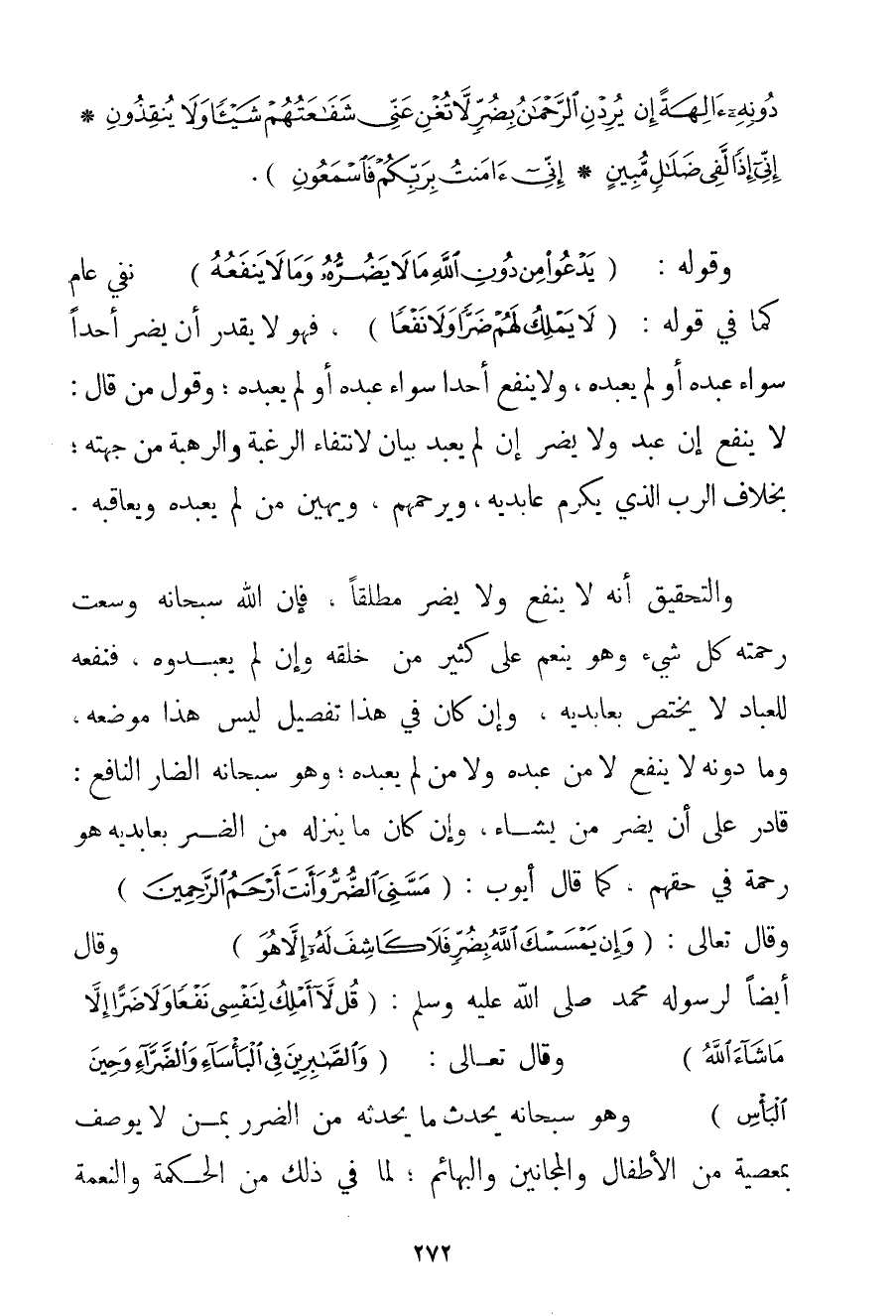 {أَأَتَّخِذُ مِنْ دُونِهِ آلِهَةً إنْ يُرِدْنِ الرَّحْمَنُ بِضُرٍّ لَا تُغْنِ عَنِّي شَفَاعَتُهُمْ شَيْئًا وَلَا يُنْقِذُونِ} {إنِّي إذًا لَفِي ضَلَالٍ مُبِينٍ} {إنِّي آمَنْتُ بِرَبِّكُمْ فَاسْمَعُونِ} . وَقَوْلُهُ: {يَدْعُو مِنْ دُونِ اللَّهِ مَا لَا يَضُرُّهُ وَمَا لَا يَنْفَعُهُ} نَفْيٌ عَامٌّ كَمَا فِي قَوْلِهِ: {وَلَا يَمْلِكُ لَهُمْ ضَرًّا وَلَا نَفْعًا} فَهُوَ لَا يَقْدِرُ أَنْ يَضُرَّ أَحَدًا سَوَاءٌ عَبَدَهُ أَوْ لَمْ يَعْبُدْهُ وَلَا يَنْفَعَ أَحَدًا سَوَاءٌ عَبَدَهُ أَوْ لَمْ يَعْبُدْهُ؛ وَقَوْلُ مَنْ قَالَ: لَا يَنْفَعُ إنْ عُبِدَ وَلَا يَضُرُّ إنْ لَمْ يُعْبَدْ بَيَانٌ لِانْتِفَاءِ الرَّغْبَةِ وَالرَّهْبَةِ مِنْ جِهَتِهِ؛ بِخِلَافِ الرَّبِّ الَّذِي يُكْرِمُ عَابِدِيهِ وَيَرْحَمُهُمْ وَيُهِينُ مَنْ لَمْ يَعْبُدْهُ وَيُعَاقِبُهُ. وَالتَّحْقِيقُ أَنَّهُ لَا يَنْفَعُ وَلَا يَضُرُّ مُطْلَقًا فَإِنَّ اللَّهَ سُبْحَانَهُ وَسِعَتْ رَحْمَتُهُ كُلَّ شَيْءٍ وَهُوَ يُنْعِمُ عَلَى كَثِيرٍ مِنْ خَلْقِهِ وَإِنْ لَمْ يَعْبُدُوهُ فَنَفْعُهُ لِلْعِبَادِ لَا يَخْتَصُّ بِعَابِدِيهِ وَإِنْ كَانَ فِي هَذَا تَفْصِيلٌ لَيْسَ هَذَا مَوْضِعَهُ وَمَا دُونَهُ لَا يَنْفَعُ لَا مَنْ عَبَدَهُ وَلَا مَنْ لَمْ يَعْبُدْهُ؛ وَهُوَ سُبْحَانَهُ الضَّارُّ النَّافِعُ: قَادِرٌ عَلَى أَنْ يَضُرَّ مَنْ يَشَاءُ وَإِنْ كَانَ مَا يُنْزِلُهُ مِنْ الضُّرِّ بِعَابِدِيهِ هُوَ رَحْمَةٌ فِي حَقِّهِمْ كَمَا قَالَ أَيُّوبُ: {مَسَّنِيَ الضُّرُّ وَأَنْتَ أَرْحَمُ الرَّاحِمِينَ} وَقَالَ تَعَالَى: {وَإِنْ يَمْسَسْكَ اللَّهُ بِضُرٍّ فَلَا كَاشِفَ لَهُ إلَّا هُوَ} وَقَالَ أَيْضًا لِرَسُولِهِ مُحَمَّدٍ صَلَّى اللَّهُ عَلَيْهِ وَسَلَّمَ {قُلْ لَا أَمْلِكُ لِنَفْسِي نَفْعًا وَلَا ضَرًّا إلَّا مَا شَاءَ اللَّهُ} وَقَالَ تَعَالَى: {وَالصَّابِرِينَ فِي الْبَأْسَاءِ وَالضَّرَّاءِ وَحِينَ الْبَأْسِ} وَهُوَ سُبْحَانَهُ يُحْدِثُ مَا يُحْدِثُهُ مِنْ الضَّرَرِ بِمَنْ لَا يُوصَفُ بِمَعْصِيَةِ مِنْ الْأَطْفَالِ وَالْمَجَانِينِ وَالْبَهَائِمِ؛ لِمَا فِي ذَلِكَ مِنْ الْحِكْمَةِ وَالنِّعْمَةِ