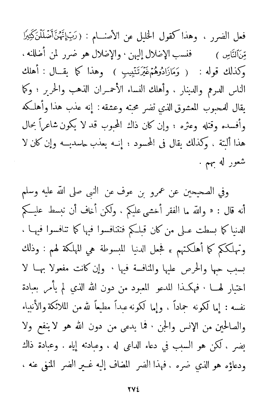 فَعَلَ الضَّرَرَ وَهَذَا كَقَوْلِ الْخَلِيلِ عَنْ الْأَصْنَامِ: {رَبِّ إنَّهُنَّ أَضْلَلْنَ كَثِيرًا مِنَ النَّاسِ} فَنُسِبَ الْإِضْلَالُ إلَيْهِنَّ وَالْإِضْلَالُ هُوَ ضَرَرٌ لِمَنْ أَضْلَلْنَهُ وَكَذَلِكَ قَوْلُهُ: {وَمَا زَادُوهُمْ غَيْرَ تَتْبِيبٍ} وَهَذَا كَمَا يُقَالُ: أَهْلَكَ النَّاسَ الدِّرْهَمُ وَالدِّينَارُ وَأَهْلَكَ النِّسَاءَ الْأَحْمَرَانِ الذَّهَبُ وَالْحَرِيرُ؛ وَكَمَا يُقَالُ لِلْمَحْبُوبِ الْمَعْشُوقِ الَّذِي تَضُرُّ مَحَبَّتُهُ وَعِشْقُهُ: إنَّهُ عَذَّبَ هَذَا وَأَهْلَكَهُ وَأَفْسَدَهُ وَقَتَلَهُ وَعَثَّرَهُ؛ وَإِنْ كَانَ ذَاكَ الْمَحْبُوبُ قَدْ لَا يَكُونُ شَاعِرًا بِحَالِ هَذَا أَلْبَتَّةَ وَكَذَلِكَ يُقَالُ فِي الْمَحْسُودِ؛ إنَّهُ يُعَذِّبُ حَاسِدِيهِ وَإِنْ كَانَ لَا شُعُورَ لَهُ بِهِمْ. وَفِي الصَّحِيحَيْنِ عَنْ عَمْرِو بْنِ عَوْفٍ عَنْ النَّبِيِّ صَلَّى اللَّهُ عَلَيْهِ وَسَلَّمَ أَنَّهُ قَالَ: {وَاَللَّهِ مَا الْفَقْرَ أَخْشَى عَلَيْكُمْ وَلَكِنْ أَخَافُ أَنْ تُبْسَطَ عَلَيْكُمْ الدُّنْيَا كَمَا بُسِطَتْ عَلَى مَنْ كَانَ قَبْلَكُمْ فَتَتَنَافَسُوا فِيهَا كَمَا تَنَافَسُوا فِيهَا وَتُهْلِكُكُمْ كَمَا أَهْلَكَتْهُمْ} فَجَعَلَ الدُّنْيَا الْمَبْسُوطَةَ هِيَ الْمُهْلِكَةُ لَهُمْ: وَذَلِكَ بِسَبَبِ حُبِّهَا وَالْحِرْصِ عَلَيْهَا وَالْمُنَافَسَةِ فِيهَا وَإِنْ كَانَتْ مَفْعُولًا بِهَا لَا اخْتِيَارَ لَهَا فَهَكَذَا الْمَدْعُوُّ الْمَعْبُودُ مِنْ دُونِ اللَّهِ الَّذِي لَمْ يَأْمُرْ بِعِبَادَةِ نَفْسِهِ: إمَّا لِكَوْنِهِ جَمَادًا وَإِمَّا لِكَوْنِهِ عَبْدًا مُطِيعًا لِلَّهِ مِنْ الْمَلَائِكَةِ وَالْأَنْبِيَاءِ وَالصَّالِحِينَ مِنْ الْإِنْسِ وَالْجِنِّ فَمَا يُدْعَى مِنْ دُونِ اللَّهِ هُوَ لَا يَنْفَعُ وَلَا يَضُرُّ لَكِنْ هُوَ السَّبَبُ فِي دُعَاءِ الدَّاعِي لَهُ وَعِبَادَتِهِ إيَّاهُ. وَعِبَادَةُ ذَاكَ وَدُعَاؤُهُ هُوَ الَّذِي ضَرَّهُ فَهَذَا الضُّرُّ الْمُضَافُ إلَيْهِ غَيْرُ الضُّرِّ الْمَنْفِيِّ عَنْهُ