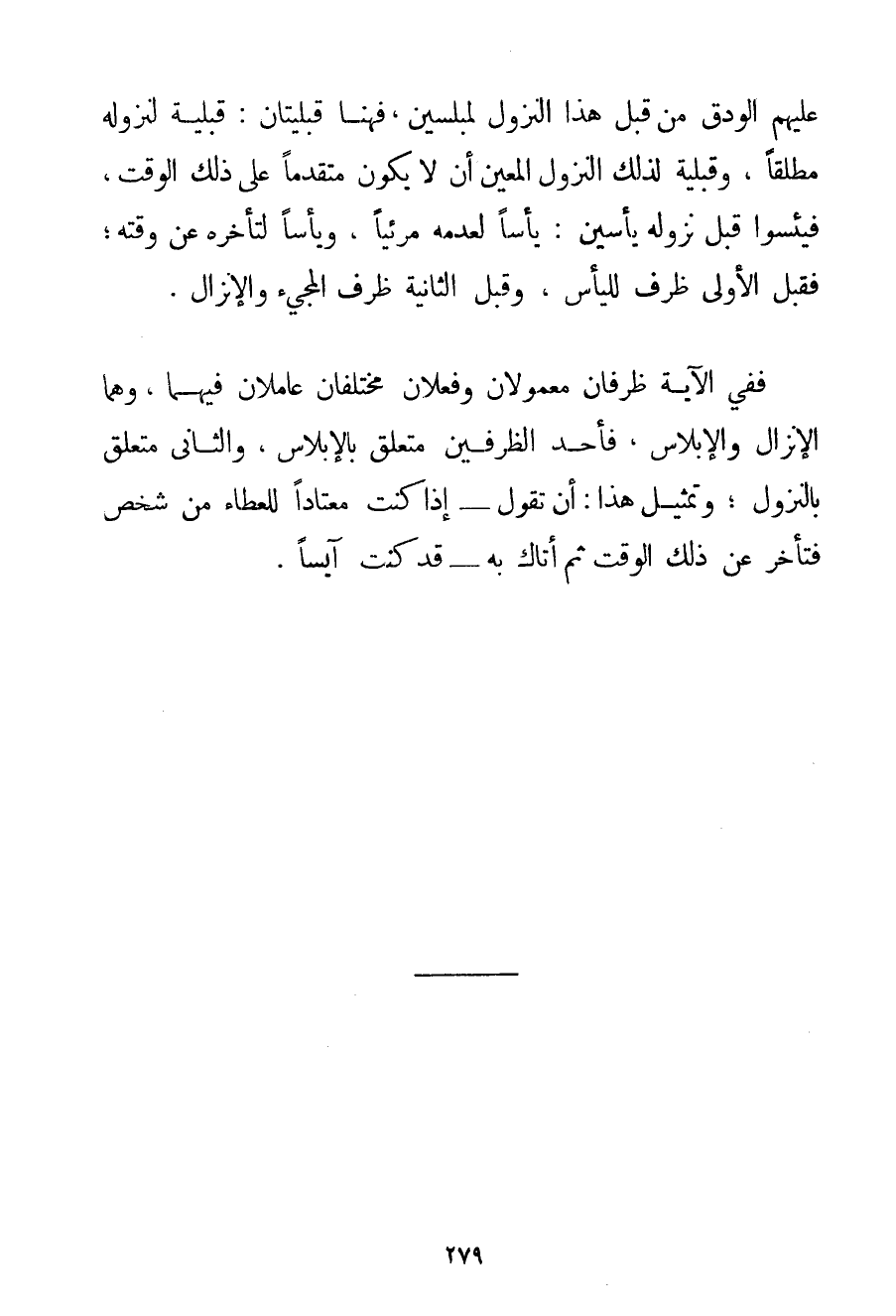 عَلَيْهِمْ الْوَدْقُ مِنْ قَبْلِ هَذَا النُّزُولِ لَمُبْلِسِينَ فَهُنَا قِبْلِيَّتَانِ: قِبْلِيَّةٌ لِنُزُولِهِ مُطْلَقًا وَقِبْلِيَّةٌ لِذَلِكَ النُّزُولِ الْمُعَيَّنِ أَنْ لَا يَكُونُ مُتَقَدِّمًا عَلَى ذَلِكَ الْوَقْتِ فَيَئِسُوا قَبْلَ نُزُولِهِ يَأْسَيْنَ: يَأْسًا لِعَدَمِهِ مَرْئِيًّا وَيَأْسًا لِتَأَخُّرِهِ عَنْ وَقْتِهِ؛ فَقَبْلَ الْأُولَى ظَرْفُ الْيَأْسِ وَقَبْلَ الثَّانِيَةِ ظَرْفُ الْمَجِيءِ وَالْإِنْزَالِ. فَفِي الْآيَةِ ظَرْفَانِ مَعْمُولَانِ وَفِعْلَانِ مُخْتَلِفَانِ عَامِلَانِ فِيهِمَا وَهُمَا الْإِنْزَالُ وَالْإِبْلَاسُ فَأَحَدُ الظَّرْفَيْنِ مُتَعَلِّقٌ بِالْإِبْلَاسِ وَالثَّانِي مُتَعَلِّقٌ بِالنُّزُولِ؛ وَتَمْثِيلُ هَذَا: أَنْ تَقُولَ إذَا كُنْت مُعْتَادًا لِلْعَطَاءِ مِنْ شَخْصٍ فَتَأَخَّرَ عَنْ ذَلِكَ الْوَقْتِ ثُمَّ أَتَاك بِهِ قَدْ كُنْت آيِسًا.