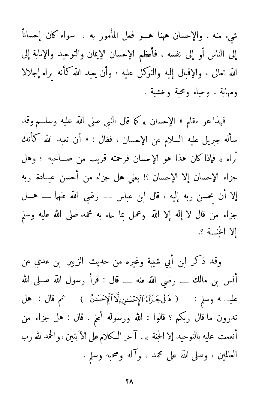 شَيْءٍ مِنْهُ وَالْإِحْسَانُ هَاهُنَا هُوَ فِعْلُ الْمَأْمُورِ بِهِ سَوَاءٌ كَانَ إحْسَانًا إلَى النَّاسِ أَوْ إلَى نَفْسِهِ فَأَعْظَمُ الْإِحْسَانِ الْإِيمَانُ وَالتَّوْحِيدُ وَالْإِنَابَةُ إلَى اللَّهِ تَعَالَى وَالْإِقْبَالُ إلَيْهِ وَالتَّوَكُّلُ عَلَيْهِ وَأَنْ يَعْبُدَ اللَّهَ كَأَنَّهُ يَرَاهُ إجْلَالًا وَمَهَابَةً وَحَيَاءً وَمَحَبَّةً وَخَشْيَةً. فَهَذَا هُوَ مَقَامُ " الْإِحْسَانِ " كَمَا {قَالَ النَّبِيُّ صَلَّى اللَّهُ عَلَيْهِ وَسَلَّمَ وَقَدْ سَأَلَهُ جِبْرِيلُ عَلَيْهِ السَّلَامُ عَنْ الْإِحْسَانِ؛ فَقَالَ: أَنْ تَعْبُدَ اللَّهَ كَأَنَّك تَرَاهُ} " فَإِذَا كَانَ هَذَا هُوَ الْإِحْسَانُ فَرَحْمَتُهُ قَرِيبٌ مِنْ صَاحِبِهِ؛ وَهَلْ جَزَاءُ الْإِحْسَانِ إلَّا الْإِحْسَانُ يَعْنِي هَلْ جَزَاءُ مَنْ أَحْسَنَ عِبَادَةَ رَبِّهِ إلَّا أَنْ يُحْسِنَ رَبُّهُ إلَيْهِ قَالَ ابْنُ عَبَّاسٍ - رَضِيَ اللَّهُ عَنْهُمَا - هَلْ جَزَاءُ مَنْ قَالَ لَا إلَهَ إلَّا اللَّهُ وَعَمِلَ بِمَا جَاءَ بِهِ مُحَمَّدٌ صَلَّى اللَّهُ عَلَيْهِ وَسَلَّمَ إلَّا الْجَنَّةُ؟ . وَقَدْ ذَكَرَ ابْنُ أَبِي شَيْبَةَ وَغَيْرُهُ مِنْ حَدِيثِ الزُّبَيْرِ بْنِ عَدِيٍّ عَنْ أَنَسِ بْنِ مَالِكٍ - رَضِيَ اللَّهُ عَنْهُ - قَالَ: {قَرَأَ رَسُولُ اللَّهِ صَلَّى اللَّهُ عَلَيْهِ وَسَلَّمَ {هَلْ جَزَاءُ الْإِحْسَانِ إلَّا الْإِحْسَانُ} ثُمَّ قَالَ: هَلْ تَدْرُونَ مَا قَالَ رَبُّكُمْ؟ قَالُوا: اللَّهُ وَرَسُولُهُ أَعْلَمُ. قَالَ: هَلْ جَزَاءُ مَنْ أَنْعَمْت عَلَيْهِ بِالتَّوْحِيدِ إلَّا الْجَنَّةُ} ". آخِرُ الْكَلَامِ عَلَى الْآيَتَيْنِ وَالْحَمْدُ لِلَّهِ رَبِّ الْعَالَمِينَ وَصَلَّى اللَّهُ عَلَى مُحَمَّدٍ وَآلِهِ وَصَحْبِهِ وَسَلَّمَ.