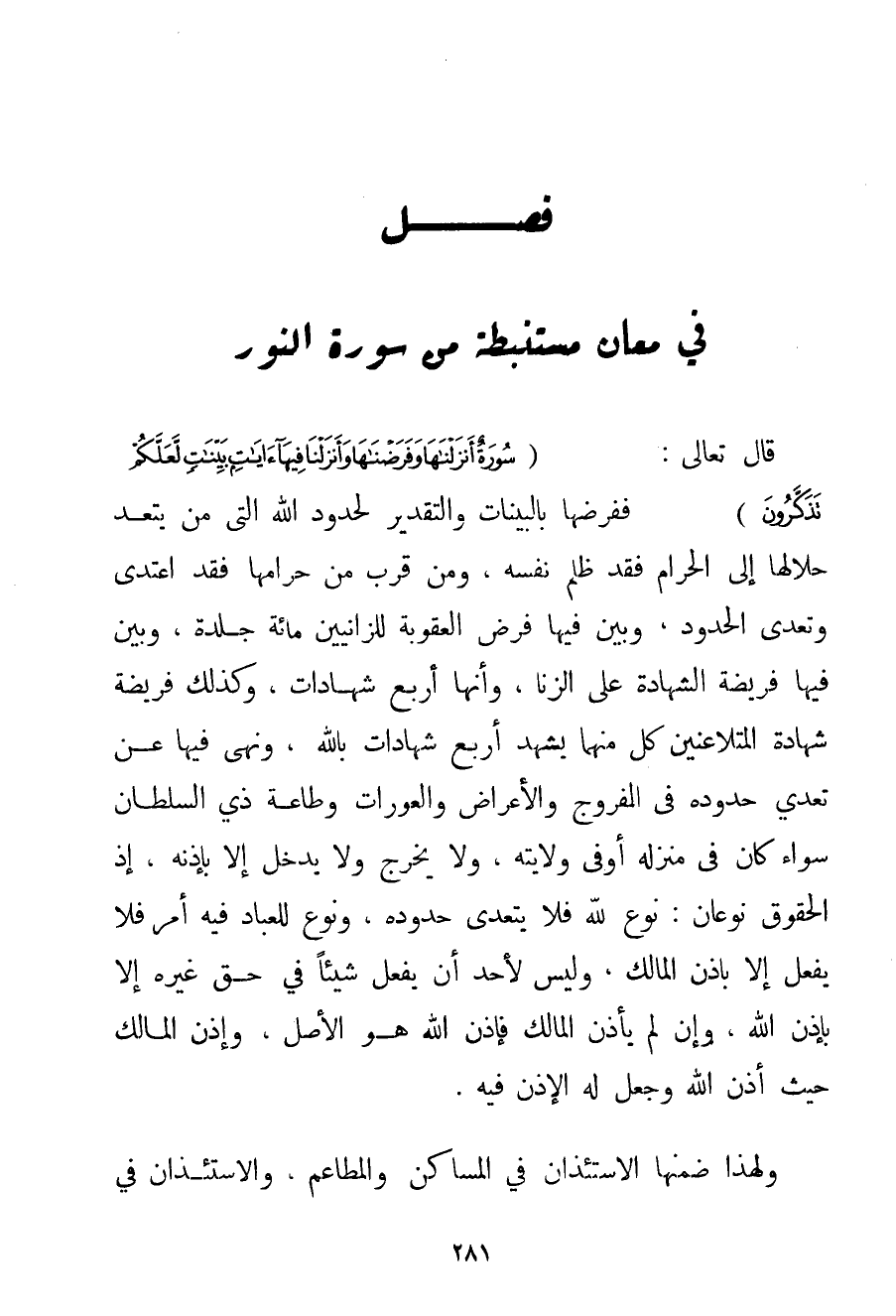 قَالَ تَعَالَى: {سُورَةٌ أَنْزَلْنَاهَا وَفَرَضْنَاهَا وَأَنْزَلْنَا فِيهَا آيَاتٍ بَيِّنَاتٍ لَعَلَّكُمْ تَذَكَّرُونَ} فَفَرَضَهَا بِالْبَيِّنَاتِ وَالتَّقْدِيرِ لِحُدُودِ اللَّهِ الَّتِي مَنْ يَتَعَدَّ حَلَالَهَا إلَى الْحَرَامِ فَقَدْ ظَلَمَ نَفْسَهُ وَمَنْ قَرُبَ مِنْ حَرَامِهَا فَقَدْ اعْتَدَى وَتَعَدَّى الْحُدُودَ وَبَيَّنَ فِيهَا فَرْضَ الْعُقُوبَةِ لِلزَّانِيَيْنِ مِائَةَ جِلْدَةٍ وَبَيَّنَ فِيهَا فَرِيضَةَ الشَّهَادَةِ عَلَى الزِّنَا وَأَنَّهَا أَرْبَعُ شَهَادَاتٍ وَكَذَلِكَ فَرِيضَةُ شَهَادَةِ الْمُتَلَاعِنَيْنِ كُلٌّ مِنْهُمَا يَشْهَدُ أَرْبَعَ شَهَادَاتٍ بِاَللَّهِ وَنَهَى فِيهَا عَنْ تَعَدِّي حُدُودِهِ فِي الْفُرُوجِ وَالْأَعْرَاضِ وَالْعَوْرَاتِ وَطَاعَةِ ذِي السُّلْطَانِ سَوَاءٌ كَانَ فِي مَنْزِلِهِ أَوْ فِي وِلَايَتِهِ وَلَا يَخْرُجُ وَلَا يَدْخُلُ إلَّا بِإِذْنِهِ إذْ الْحُقُوقُ نَوْعَانِ: نَوْعٌ لِلَّهِ فَلَا يَتَعَدَّى حُدُودَهُ وَنَوْعٌ لِلْعِبَادِ فِيهِ أَمْرٌ فَلَا يُفْعَلُ إلَّا بِإِذْنِ الْمَالِكِ وَلَيْسَ لِأَحَدِ أَنْ يَفْعَلَ شَيْئًا فِي حَقِّ غَيْرِهِ إلَّا بِإِذْنِ اللَّهِ وَإِنْ لَمْ يَأْذَنْ الْمَالِكُ فَإِذْنُ اللَّهِ هُوَ الْأَصْلُ وَإِذْنُ الْمَالِكِ حَيْثُ أَذِنَ اللَّهُ وَجَعَلَ لَهُ الْإِذْنَ فِيهِ. وَلِهَذَا ضَمَّنَهَا الِاسْتِئْذَانَ فِي الْمَسَاكِنِ وَالْمَطَاعِمِ وَالِاسْتِئْذَانَ فِي