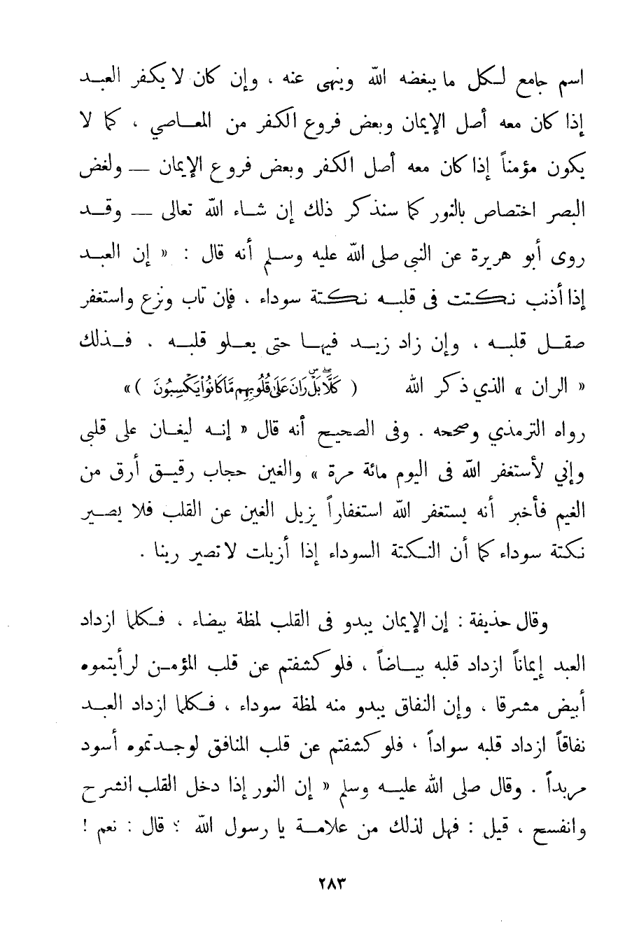 اسْمٌ جَامِعٌ لِكُلِّ مَا يُبْغِضُهُ اللَّهُ وَيَنْهَى عَنْهُ وَإِنْ كَانَ لَا يَكْفُرُ الْعَبْدُ إذَا كَانَ مَعَهُ أَصْلُ الْإِيمَانِ وَبَعْضُ فُرُوعِ الْكُفْرِ مِنْ الْمَعَاصِي كَمَا لَا يَكُونُ مُؤْمِنًا إذَا كَانَ مَعَهُ أَصْلُ الْكُفْرِ وَبَعْضُ فُرُوعِ الْإِيمَانِ - وَلِغَضِّ الْبَصَرِ اخْتِصَاصٌ بِالنُّورِ كَمَا سَنَذْكُرُ ذَلِكَ إنْ شَاءَ اللَّهُ تَعَالَى - وَقَدْ رَوَى أَبُو هُرَيْرَةَ عَنْ النَّبِيِّ صَلَّى اللَّهُ عَلَيْهِ وَسَلَّمَ أَنَّهُ قَالَ: {إنَّ الْعَبْدَ إذَا أَذْنَبَ نُكِتَتْ فِي قَلْبِهِ نُكْتَةٌ سَوْدَاءُ فَإِنْ تَابَ وَنَزَعَ وَاسْتَغْفَرَ صُقِلَ قَلْبُهُ وَإِنْ زَادَ زِيدَ فِيهَا حَتَّى يَعْلُوَ قَلْبَهُ فَذَلِكَ الران الَّذِي ذَكَرَ اللَّهُ {كَلَّا بَلْ رَانَ عَلَى قُلُوبِهِمْ مَا كَانُوا يَكْسِبُونَ} } رَوَاهُ التِّرْمِذِيُّ وَصَحَّحَهُ. وَفِي الصَّحِيحِ أَنَّهُ قَالَ {إنَّهُ ليغان عَلَى قَلْبِي وَإِنِّي لَأَسْتَغْفِرُ اللَّهَ فِي الْيَوْمِ مِائَةَ مَرَّةٍ} وَالْغَيْنُ حِجَابٌ رَقِيقٌ أَرَقُّ مِنْ الْغَيْمِ فَأَخْبَرَ أَنَّهُ يَسْتَغْفِرُ اللَّهَ اسْتِغْفَارًا يُزِيلُ الْغَيْنَ عَنْ الْقَلْبِ فَلَا يَصِيرُ نُكْتَةً سَوْدَاءَ كَمَا أَنَّ النُّكْتَةَ السَّوْدَاءَ إذَا أُزِيلَتْ لَا تَصِيرُ رَيْنًا. وَقَالَ حُذَيْفَةُ: إنَّ الْإِيمَانَ يَبْدُو فِي الْقَلْبِ لمظة بَيْضَاءَ فَكُلَّمَا ازْدَادَ الْعَبْدُ إيمَانًا ازْدَادَ قَلْبُهُ بَيَاضًا فَلَوْ كَشَفْتُمْ عَنْ قَلْبِ الْمُؤْمِنِ لَرَأَيْتُمُوهُ أَبْيَضَ مُشْرِقًا وَإِنَّ النِّفَاقَ يَبْدُو مِنْهُ لمظة سَوْدَاءُ فَكُلَّمَا ازْدَادَ الْعَبْدُ نِفَاقًا ازْدَادَ قَلْبُهُ سَوَادًا فَلَوْ كَشَفْتُمْ عَنْ قَلْبِ الْمُنَافِقِ لَوَجَدْتُمُوهُ أَسْوَدَ مِرْبَدًا. وَقَالَ صَلَّى اللَّهُ عَلَيْهِ وَسَلَّمَ {إنَّ النُّورَ إذَا دَخَلَ الْقَلْبَ انْشَرَحَ وَانْفَسَحَ قِيلَ: فَهَلْ لِذَلِكَ مِنْ عَلَامَةٍ يَا رَسُولَ اللَّهِ؟ قَالَ: نَعَمْ