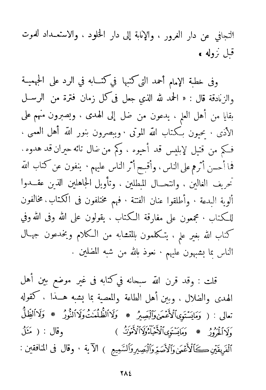 التَّجَافِي عَنْ دَارِ الْغُرُورِ وَالْإِنَابَةُ إلَى دَارِ الْخُلُودِ وَالِاسْتِعْدَادُ لِلْمَوْتِ قَبْلَ نُزُولِهِ} . وَفِي خُطْبَةِ الْإِمَامِ أَحْمَدَ الَّتِي كَتَبَهَا فِي كِتَابِهِ فِي الرَّدِّ عَلَى الْجَهْمِيَّة وَالزَّنَادِقَةِ قَالَ: " الْحَمْدُ لِلَّهِ الَّذِي جَعَلَ فِي كُلِّ زَمَانٍ فَتْرَةً مِنْ الرُّسُلِ بَقَايَا مِنْ أَهْلِ الْعِلْمِ يَدْعُونَ مَنْ ضَلَّ إلَى الْهُدَى وَيَصْبِرُونَ مِنْهُمْ عَلَى الْأَذَى يُحْيُونَ بِكِتَابِ اللَّهِ الْمَوْتَى وَيُبَصِّرُونَ بِنُورِ اللَّهِ أَهْلَ الْعَمَى فَكَمْ مِنْ قَتِيلٍ لإبليس قَدْ أَحْيَوْهُ وَكَمْ مِنْ ضَالٍّ تَائِهٍ حَيْرَانَ قَدْ هَدَوْهُ فَمَا أَحْسَنَ أَثَرُهُمْ عَلَى النَّاسِ وَأَقْبَحَ أَثَرُ النَّاسِ عَلَيْهِمْ يَنْفُونَ عَنْ كِتَابِ اللَّهِ تَحْرِيفَ الْغَالِينَ وَانْتِحَالَ الْمُبْطِلِينَ وَتَأْوِيلَ الْجَاهِلِينَ الَّذِينَ عَقَدُوا أَلْوِيَةَ الْبِدْعَةِ وَأَطْلَقُوا عَنَانَ الْفِتْنَةِ فَهُمْ مُخْتَلِفُونَ فِي الْكِتَابِ مُخَالِفُونَ لِلْكِتَابِ مُجْمِعُونَ عَلَى مُفَارَقَةِ الْكِتَابِ يَقُولُونَ عَلَى اللَّهِ وَفِي اللَّهِ وَفِي كِتَابِ اللَّهِ بِغَيْرِ عِلْمٍ يَتَكَلَّمُونَ بِالْمُتَشَابِهِ مِنْ الْكَلَامِ وَيَخْدَعُونَ جُهَّالَ النَّاسِ بِمَا يُشَبِّهُونَ عَلَيْهِمْ نَعُوذُ بِاَللَّهِ مِنْ شُبَهِ الْمُضِلِّينَ. قُلْت: وَقَدْ قَرَنَ اللَّهُ سُبْحَانَهُ فِي كِتَابِهِ فِي غَيْرِ مَوْضِعٍ بَيْنَ أَهْلِ الْهُدَى وَالضَّلَالِ وَبَيْنَ أَهْلِ الطَّاعَةِ وَالْمَعْصِيَةِ بِمَا يُشْبِهُ هَذَا كَقَوْلِهِ تَعَالَى: {وَمَا يَسْتَوِي الْأَعْمَى وَالْبَصِيرُ} {وَلَا الظُّلُمَاتُ وَلَا النُّورُ} {وَلَا الظِّلُّ وَلَا الْحَرُورُ} {وَمَا يَسْتَوِي الْأَحْيَاءُ وَلَا الْأَمْوَاتُ} وَقَالَ: {مَثَلُ الْفَرِيقَيْنِ كَالْأَعْمَى وَالْأَصَمِّ وَالْبَصِيرِ وَالسَّمِيعِ} الْآيَةُ وَقَالَ فِي الْمُنَافِقِينَ: