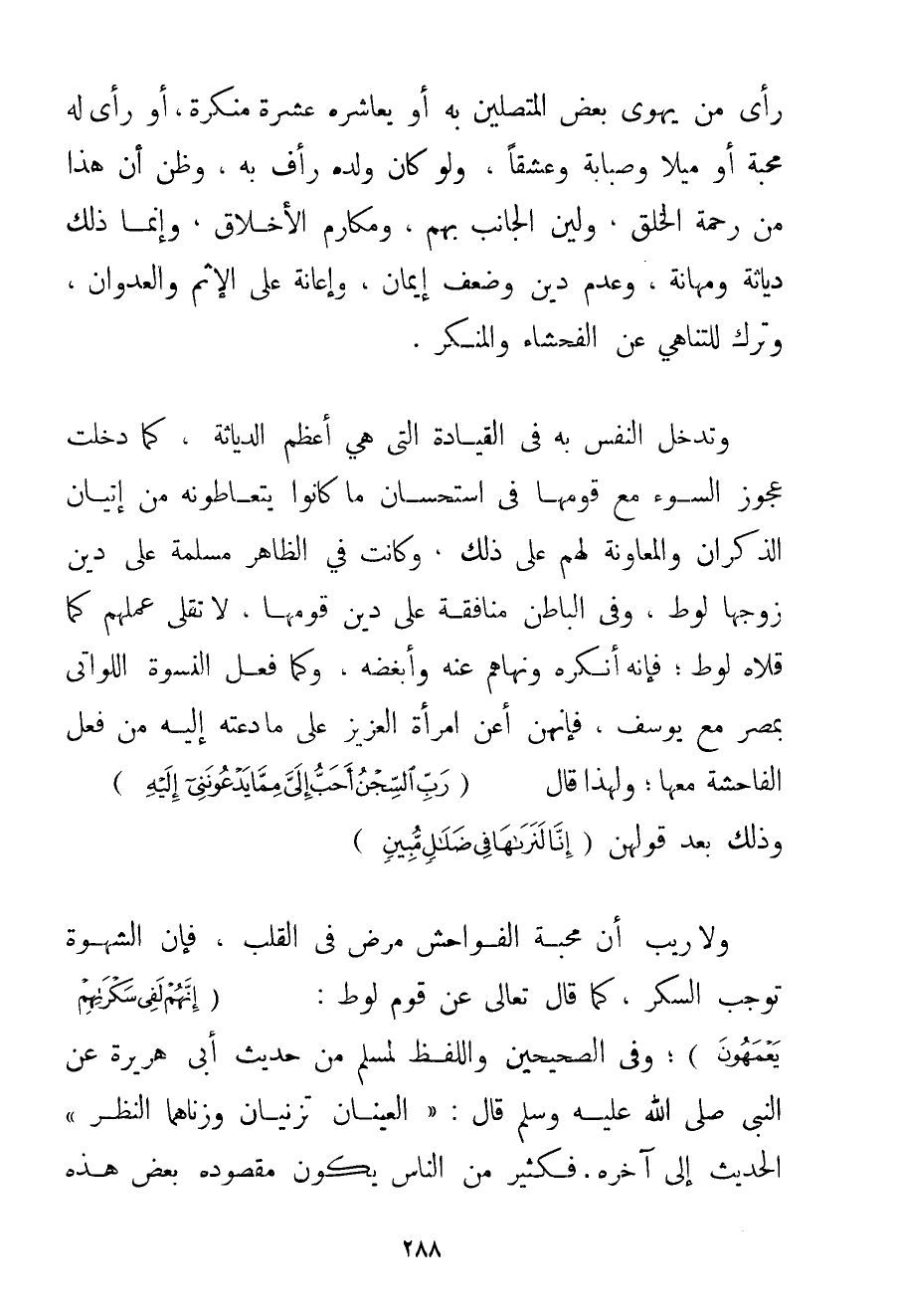 وَلَا رَيْبَ أَنَّ مَحَبَّةَ الْفَوَاحِشِ مَرَضٌ فِي الْقَلْبِ فَإِنَّ الشَّهْوَةَ تُوجِبُ السُّكْرَ كَمَا قَالَ تَعَالَى عَنْ قَوْمِ لُوطٍ: {إنَّهُمْ لَفِي سَكْرَتِهِمْ يَعْمَهُونَ} وَفِي الصَّحِيحَيْنِ وَاللَّفْظُ لِمُسْلِمِ مِنْ حَدِيثِ أَبِي هُرَيْرَةَ عَنْ النَّبِيِّ صَلَّى اللَّهُ عَلَيْهِ وَسَلَّمَ قَالَ: {الْعَيْنَانِ تَزْنِيَانِ وَزِنَاهُمَا النَّظَرُ} الْحَدِيثُ إلَى آخِرِهِ. فَكَثِيرٌ مِنْ النَّاسِ يَكُونُ مَقْصُودُهُ بَعْضَ هَذِهِ