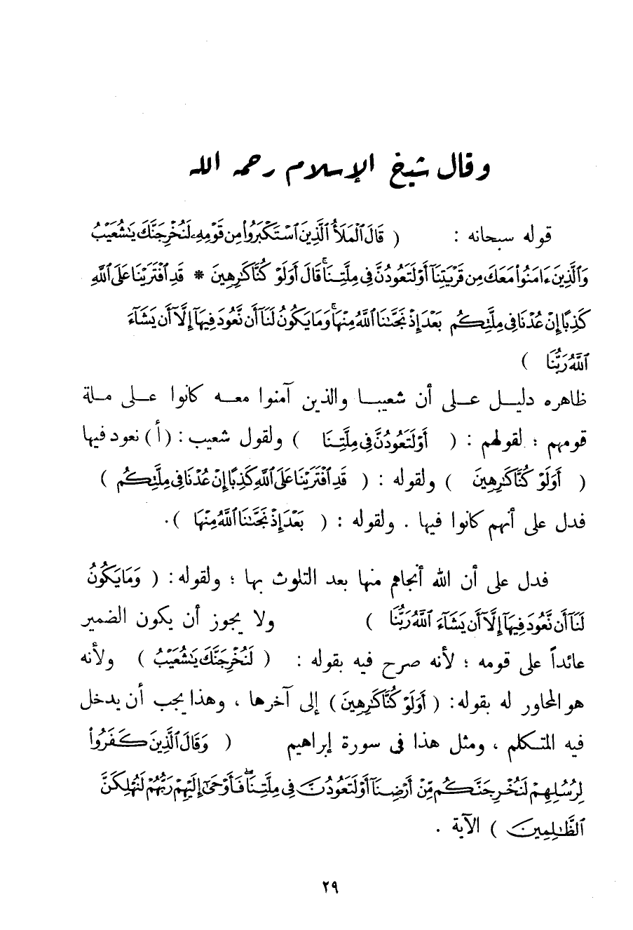 قَوْلُهُ سُبْحَانَهُ: {قَالَ الْمَلَأُ الَّذِينَ اسْتَكْبَرُوا مِنْ قَوْمِهِ لَنُخْرِجَنَّكَ يَا شُعَيْبُ وَالَّذِينَ آمَنُوا مَعَكَ مِنْ قَرْيَتِنَا أَوْ لَتَعُودُنَّ فِي مِلَّتِنَا قَالَ أَوَلَوْ كُنَّا كَارِهِينَ} {قَدِ افْتَرَيْنَا عَلَى اللَّهِ كَذِبًا إنْ عُدْنَا فِي مِلَّتِكُمْ بَعْدَ إذْ نَجَّانَا اللَّهُ مِنْهَا وَمَا يَكُونُ لَنَا أَنْ نَعُودَ فِيهَا إلَّا أَنْ يَشَاءَ اللَّهُ رَبُّنَا} ظَاهِرُهُ دَلِيلٌ عَلَى أَنَّ شُعَيْبًا وَاَلَّذِينَ آمَنُوا مَعَهُ كَانُوا عَلَى مِلَّةِ قَوْمِهِمْ؛ لِقَوْلِهِمْ: {أَوْ لَتَعُودُنَّ فِي مِلَّتِنَا} وَلِقَوْلِ شُعَيْبٍ: (أنَعُودُ فِيهَا {أَوَلَوْ كُنَّا كَارِهِينَ} وَلِقَوْلِهِ: {قَدِ افْتَرَيْنَا عَلَى اللَّهِ كَذِبًا إنْ عُدْنَا فِي مِلَّتِكُمْ} فَدَلَّ عَلَى أَنَّهُمْ كَانُوا فِيهَا. وَلِقَوْلِهِ: {بَعْدَ إذْ نَجَّانَا اللَّهُ مِنْهَا} . فَدَلَّ عَلَى أَنَّ اللَّهَ أَنْجَاهُمْ مِنْهَا بَعْدَ التَّلَوُّثِ بِهَا؛ وَلِقَوْلِهِ: {وَمَا يَكُونُ لَنَا أَنْ نَعُودَ فِيهَا إلَّا أَنْ يَشَاءَ اللَّهُ رَبُّنَا} وَلَا يَجُوزُ أَنْ يَكُونَ الضَّمِيرُ عَائِدًا عَلَى قَوْمِهِ؛ لِأَنَّهُ صَرَّحَ فِيهِ بِقَوْلِهِ: {لَنُخْرِجَنَّكَ يَا شُعَيْبُ} وَلِأَنَّهُ هُوَ الْمُحَاوِرُ لَهُ بِقَوْلِهِ: {أَوَلَوْ كُنَّا كَارِهِينَ} إلَى آخِرِهَا وَهَذَا يَجِبُ أَنْ يَدْخُلَ فِيهِ الْمُتَكَلِّمُ وَمِثْلُ هَذَا فِي سُورَةِ إبْرَاهِيمَ {وَقَالَ الَّذِينَ كَفَرُوا لِرُسُلِهِمْ لَنُخْرِجَنَّكُمْ مِنْ أَرْضِنَا أَوْ لَتَعُودُنَّ فِي مِلَّتِنَا فَأَوْحَى إلَيْهِمْ رَبُّهُمْ لَنُهْلِكَنَّ الظَّالِمِينَ} الْآيَةُ.