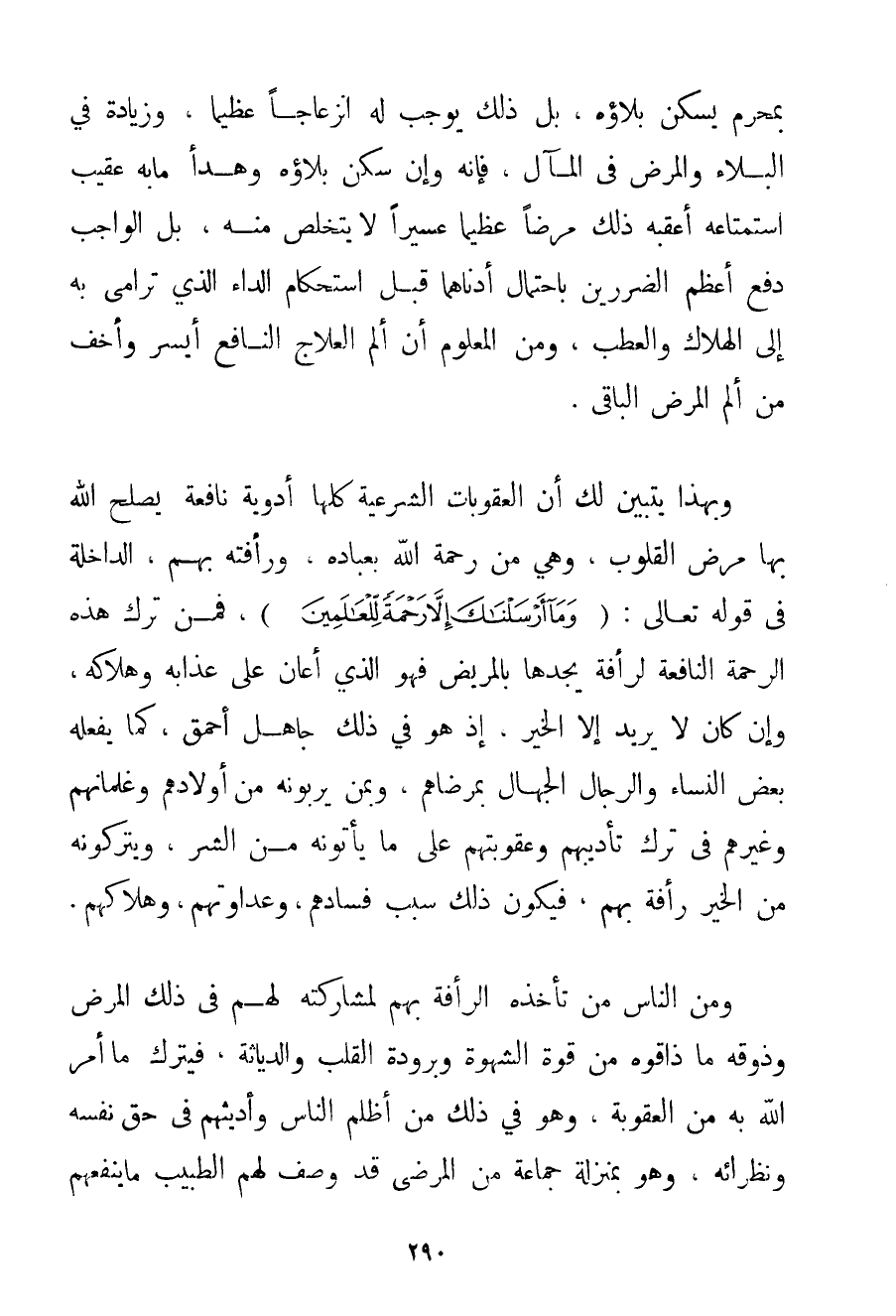 بِمُحَرَّمِ يَسْكُنُ بَلَاؤُهُ بَلْ ذَلِكَ يُوجِبُ لَهُ انْزِعَاجًا عَظِيمًا وَزِيَادَةً فِي الْبَلَاءِ وَالْمَرَضِ فِي الْمَآلِ فَإِنَّهُ وَإِنْ سَكَنَ بَلَاؤُهُ وَهَدَأَ مَا بِهِ عَقِيبَ اسْتِمْتَاعِهِ أَعْقَبَهُ ذَلِكَ مَرَضًا عَظِيمًا عَسِيرًا لَا يَتَخَلَّصُ مِنْهُ بَلْ الْوَاجِبُ دَفْعُ أَعْظَمِ الضَّرَرَيْنِ بِاحْتِمَالِ أَدْنَاهُمَا قَبْلَ اسْتِحْكَامِ الدَّاءِ الَّذِي تَرَامَى بِهِ إلَى الْهَلَاكِ وَالْعَطَبِ وَمِنْ الْمَعْلُومِ أَنَّ أَلَمَ الْعِلَاجِ النَّافِعِ أَيْسَرُ وَأَخَفُّ مِنْ أَلَمِ الْمَرَضِ الْبَاقِي. وَبِهَذَا يَتَبَيَّنُ لَك أَنَّ الْعُقُوبَاتِ الشَّرْعِيَّةَ كُلَّهَا أَدْوِيَةٌ نَافِعَةٌ يُصْلِحُ اللَّهُ بِهَا مَرَضُ الْقُلُوبِ وَهِيَ مِنْ رَحْمَةِ اللَّهِ بِعِبَادِهِ وَرَأْفَتِهِ بِهِمْ الدَّاخِلَةِ فِي قَوْله تَعَالَى {وَمَا أَرْسَلْنَاكَ إلَّا رَحْمَةً لِلْعَالَمِينَ} فَمَنْ تَرَكَ هَذِهِ الرَّحْمَةَ النَّافِعَةَ لِرَأْفَةِ يَجِدُهَا بِالْمَرِيضِ فَهُوَ الَّذِي أَعَانَ عَلَى عَذَابِهِ وَهَلَاكِهِ وَإِنْ كَانَ لَا يُرِيدُ إلَّا الْخَيْرَ إذْ هُوَ فِي ذَلِكَ جَاهِلٌ أَحْمَقُ كَمَا يَفْعَلُهُ بَعْضُ النِّسَاءِ وَالرِّجَالِ الْجُهَّالِ بِمَرْضَاهُمْ وَبِمَنْ يُرَبُّونَهُ مِنْ أَوْلَادِهِمْ وَغِلْمَانِهِمْ وَغَيْرِهِمْ فِي تَرْكِ تَأْدِيبِهِمْ وَعُقُوبَتِهِمْ عَلَى مَا يَأْتُونَهُ مِنْ الشَّرِّ وَيَتْرُكُونَهُ مِنْ الْخَيْرِ رَأْفَةً بِهِمْ فَيَكُونُ ذَلِكَ سَبَبَ فَسَادِهِمْ وَعَدَاوَتِهِمْ وَهَلَاكِهِمْ. وَمِنْ النَّاسِ مَنْ تَأْخُذُهُ الرَّأْفَةُ بِهِمْ لِمُشَارَكَتِهِ لَهُمْ فِي ذَلِكَ الْمَرَضِ وَذَوْقِهِ مَا ذَاقُوهُ مِنْ قُوَّةِ الشَّهْوَةِ وَبُرُودَةِ الْقَلْبِ وَالدِّيَاثَةِ فَيَتْرُكُ مَا أَمَرَ اللَّهُ بِهِ مِنْ الْعُقُوبَةِ وَهُوَ فِي ذَلِكَ مِنْ أَظْلَمِ النَّاسِ وأديثهم فِي حَقِّ نَفْسِهِ وَنُظَرَائِهِ وَهُوَ بِمَنْزِلَةِ جَمَاعَةٍ مِنْ الْمَرْضَى قَدْ وَصَفَ لَهُمْ الطَّبِيبُ مَا يَنْفَعُهُمْ
