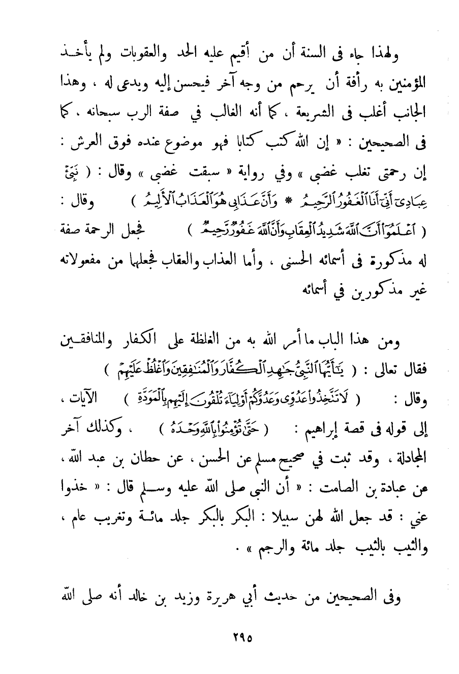 وَلِهَذَا جَاءَ فِي السُّنَّةِ أَنَّ مَنْ أُقِيمَ عَلَيْهِ الْحَدُّ وَالْعُقُوبَاتُ وَلَمْ يَأْخُذْ الْمُؤْمِنِينَ بِهِ رَأْفَةٌ أَنْ يُرْحَمَ مِنْ وَجْهٍ آخَرَ فَيُحْسَنُ إلَيْهِ وَيُدْعَى لَهُ وَهَذَا الْجَانِبُ أَغْلَبُ فِي الشَّرِيعَةِ كَمَا أَنَّهُ الْغَالِبُ فِي صِفَةِ الرَّبِّ سُبْحَانَهُ كَمَا فِي الصَّحِيحَيْنِ: {إنَّ اللَّهَ كَتَبَ كِتَابًا فَهُوَ مَوْضُوعٌ عِنْدَهُ فَوْقَ الْعَرْشِ: إنَّ رَحْمَتِي تَغْلِبُ غَضَبِي وَفِي رِوَايَةٍ سَبَقَتْ غَضَبِي} وَقَالَ: {نَبِّئْ عِبَادِي أَنِّي أَنَا الْغَفُورُ الرَّحِيمُ} {وَأَنَّ عَذَابِي هُوَ الْعَذَابُ الْأَلِيمُ} وَقَالَ: {اعْلَمُوا أَنَّ اللَّهَ شَدِيدُ الْعِقَابِ وَأَنَّ اللَّهَ غَفُورٌ رَحِيمٌ} فَجَعَلَ الرَّحْمَةَ صِفَةً لَهُ مَذْكُورَةً فِي أَسْمَائِهِ الْحُسْنَى وَأَمَّا الْعَذَابُ وَالْعِقَابُ فَجَعَلَهُمَا مِنْ مَفْعُولَاتِهِ غَيْرَ مَذْكُورَيْنِ فِي أَسْمَائِهِ. وَمِنْ هَذَا الْبَابِ مَا أَمَرَ اللَّهُ بِهِ مِنْ الْغِلْظَةِ عَلَى الْكُفَّارِ وَالْمُنَافِقِينَ فَقَالَ تَعَالَى: {يَا أَيُّهَا النَّبِيُّ جَاهِدِ الْكُفَّارَ وَالْمُنَافِقِينَ وَاغْلُظْ عَلَيْهِمْ} وَقَالَ: {لَا تَتَّخِذُوا عَدُوِّي وَعَدُوَّكُمْ أَوْلِيَاءَ تُلْقُونَ إلَيْهِمْ بِالْمَوَدَّةِ} الْآيَاتُ إلَى قَوْلِهِ فِي قِصَّةِ إبْرَاهِيمَ: {حَتَّى تُؤْمِنُوا بِاللَّهِ وَحْدَهُ} وَكَذَلِكَ آخِرُ الْمُجَادَلَةِ وَقَدْ ثَبَتَ فِي صَحِيحِ مُسْلِمٍ عَنْ الْحَسَنِ عَنْ حطان بْنِ عَبْدِ اللَّهِ عَنْ عبادة بْنِ الصَّامِتِ: " أَنَّ النَّبِيَّ صَلَّى اللَّهُ عَلَيْهِ وَسَلَّمَ قَالَ: {خُذُوا عَنِّي: قَدْ جَعَلَ اللَّهُ لَهُنَّ سَبِيلًا: الْبِكْرُ بِالْبِكْرِ جَلْدُ مِائَةٍ وَتَغْرِيبُ عَامٍ وَالثَّيِّبُ بِالثَّيِّبِ جَلْدُ مِائَةٍ وَالرَّجْمُ} . وَفِي الصَّحِيحَيْنِ مِنْ حَدِيثِ أَبِي هُرَيْرَةَ وَزَيْدِ بْنِ خَالِدٍ أَنَّهُ