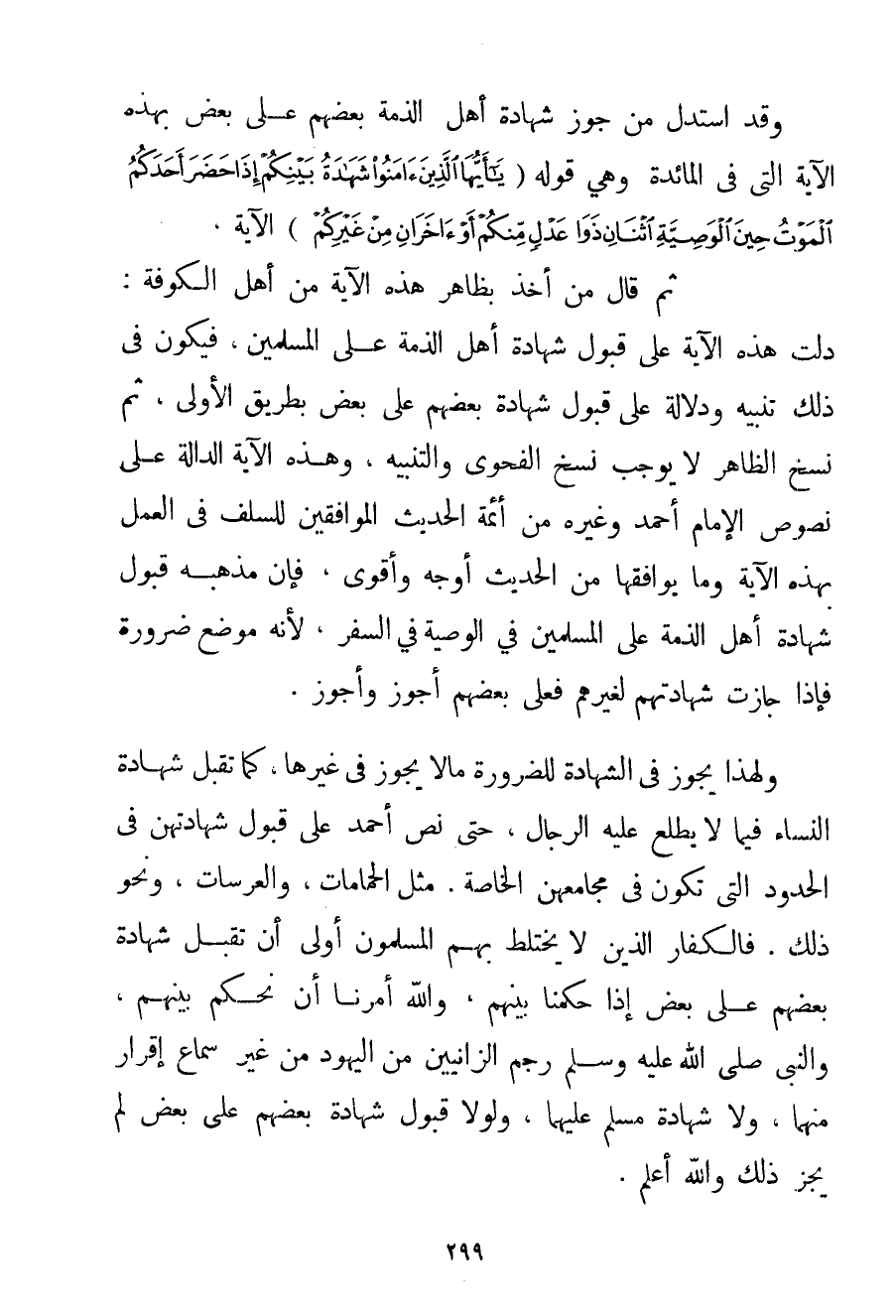 وَقَدْ اسْتَدَلَّ مَنْ جَوَّزَ شَهَادَةَ أَهْلِ الذِّمَّةِ بَعْضِهِمْ عَلَى بَعْضٍ بِهَذِهِ الْآيَةِ الَّتِي فِي الْمَائِدَةِ وَهِيَ قَوْلُهُ {يَا أَيُّهَا الَّذِينَ آمَنُوا شَهَادَةُ بَيْنِكُمْ إذَا حَضَرَ أَحَدَكُمُ الْمَوْتُ حِينَ الْوَصِيَّةِ اثْنَانِ ذَوَا عَدْلٍ مِنْكُمْ أَوْ آخَرَانِ مِنْ غَيْرِكُمْ} الْآيَةُ ثُمَّ قَالَ مَنْ أَخَذَ بِظَاهِرِ هَذِهِ الْآيَةِ مِنْ أَهْلِ الْكُوفَةِ: دَلَّتْ هَذِهِ الْآيَةُ عَلَى قَبُولِ شَهَادَةِ أَهْلِ الذِّمَّةِ عَلَى الْمُسْلِمِينَ فَيَكُونُ فِي ذَلِكَ تَنْبِيهٌ وَدَلَالَةٌ عَلَى قَبُولِ شَهَادَةِ بَعْضِهِمْ عَلَى بَعْضٍ بِطَرِيقِ الْأَوْلَى ثُمَّ نَسْخُ الظَّاهِرِ لَا يُوجِبُ نَسْخَ الْفَحْوَى وَالتَّنْبِيهِ وَهَذِهِ الْآيَةُ الدَّالَّةُ عَلَى نُصُوصِ الْإِمَامِ أَحْمَدَ وَغَيْرِهِ مِنْ أَئِمَّةِ الْحَدِيثِ الْمُوَافِقِينَ لِلسَّلَفِ فِي الْعَمَلِ بِهَذِهِ الْآيَةِ وَمَا يُوَافِقُهَا مِنْ الْحَدِيثِ أَوْجَهُ وَأَقْوَى فَإِنَّ مَذْهَبَهُ قَبُولُ شَهَادَةِ أَهْلِ الذِّمَّةِ عَلَى الْمُسْلِمِينَ فِي الْوَصِيَّةِ فِي السَّفَرِ لِأَنَّهُ مَوْضِعُ ضَرُورَةٍ فَإِذَا جَازَتْ شَهَادَتُهُمْ لِغَيْرِهِمْ فَعَلَى بَعْضِهِمْ أجوز وأجوز. وَلِهَذَا يَجُوزُ فِي الشَّهَادَةِ لِلضَّرُورَةِ مَا لَا يَجُوزُ فِي غَيْرِهَا كَمَا تُقْبَلُ شَهَادَةُ النِّسَاءِ فِيمَا لَا يَطَّلِعُ عَلَيْهِ الرِّجَالُ حَتَّى نَصَّ أَحْمَدُ عَلَى قَبُولِ شَهَادَتِهِنَّ فِي الْحُدُودِ الَّتِي تَكُونُ فِي مَجَامِعِهِنَّ الْخَاصَّةِ. مِثْلَ الْحَمَّامَاتِ وَالْعُرْسَاتِ وَنَحْوِ ذَلِكَ. فَالْكُفَّارُ الَّذِينَ لَا يَخْتَلِطُ بِهِمْ الْمُسْلِمُونَ أَوْلَى أَنْ تُقْبَلَ شَهَادَةُ بَعْضِهِمْ عَلَى بَعْضٍ إذَا حَكَمْنَا بَيْنَهُمْ وَاَللَّهُ أَمَرَنَا أَنْ نَحْكُمَ بَيْنَهُمْ وَالنَّبِيُّ صَلَّى اللَّهُ عَلَيْهِ وَسَلَّمَ رَجَمَ الزَّانِيَيْنِ مِنْ الْيَهُودِ مِنْ غَيْرِ سَمَاعِ إقْرَارٍ مِنْهُمَا وَلَا شَهَادَةِ مُسْلِمٍ عَلَيْهِمَا وَلَوْلَا قَبُولُ شَهَادَةِ بَعْضِهِمْ عَلَى بَعْضٍ لَمْ يَجُزْ ذَلِكَ وَاَللَّهُ أَعْلَمُ.