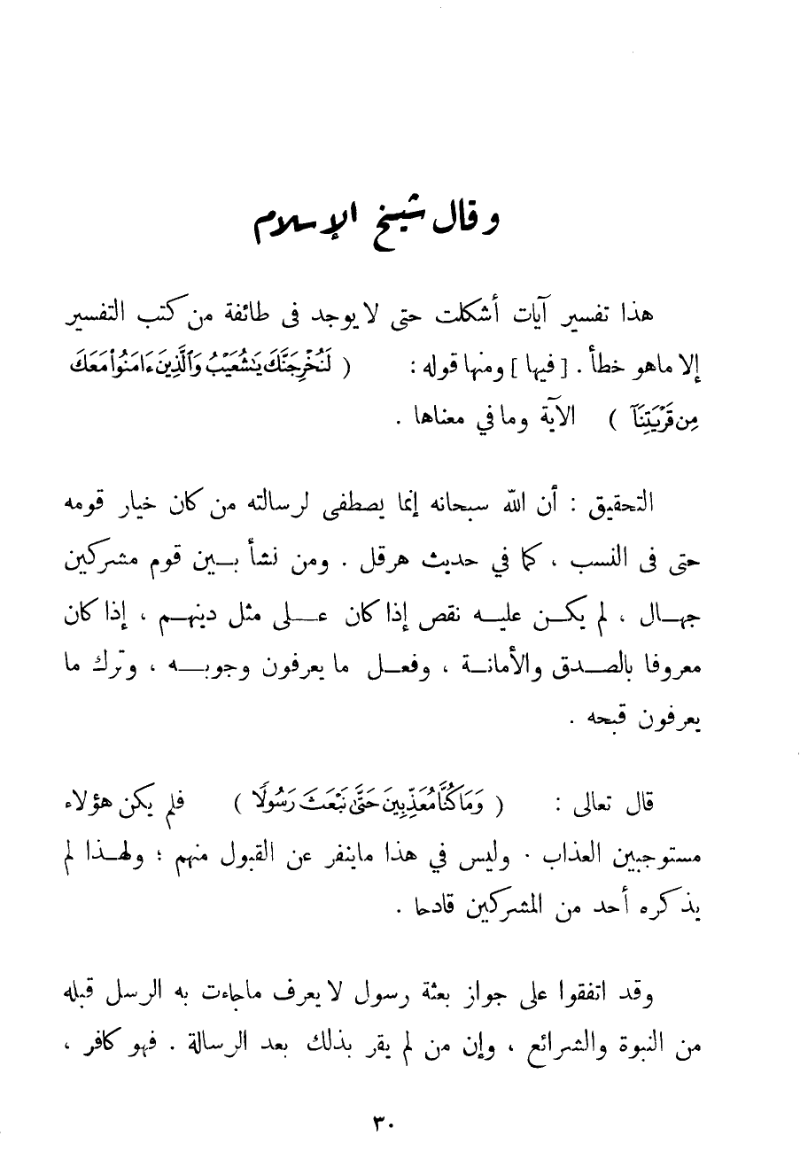 وَمِنْهَا قَوْلُهُ: {لَنُخْرِجَنَّكَ يَا شُعَيْبُ وَالَّذِينَ آمَنُوا مَعَكَ مِنْ قَرْيَتِنَا} الْآيَةُ وَمَا فِي مَعْنَاهَا. التَّحْقِيقُ: أَنَّ اللَّهَ سُبْحَانَهُ إنَّمَا يَصْطَفِي لِرِسَالَتِهِ مَنْ كَانَ خِيَارَ قَوْمِهِ حَتَّى فِي النَّسَبِ كَمَا فِي حَدِيثِ هِرَقْلَ. وَمَنْ نَشَأَ بَيْنَ قَوْمٍ مُشْرِكِينَ جُهَّالٍ لَمْ يَكُنْ عَلَيْهِ نَقْصٌ إذَا كَانَ عَلَى مِثْلِ دِينِهِمْ إذَا كَانَ مَعْرُوفًا بِالصِّدْقِ وَالْأَمَانَةِ وَفِعْلِ مَا يَعْرِفُونَ وُجُوبَهُ وَتَرْكِ مَا يَعْرِفُونَ قُبْحَهُ. قَالَ تَعَالَى: {وَمَا كُنَّا مُعَذِّبِينَ حَتَّى نَبْعَثَ رَسُولًا} فَلَمْ يَكُنْ هَؤُلَاءِ مُسْتَوْجِبِينَ الْعَذَابَ وَلَيْسَ فِي هَذَا مَا يُنَفِّرُ عَنْ الْقَبُولِ مِنْهُمْ؛ وَلِهَذَا لَمْ يَذْكُرْهُ أَحَدٌ مِنْ الْمُشْرِكِينَ قَادِحًا. وَقَدْ اتَّفَقُوا عَلَى جَوَازِ بَعْثَةِ رَسُولٍ لَا يَعْرِفُ مَا جَاءَتْ بِهِ الرُّسُلُ قَبْلَهُ مِنْ النُّبُوَّةِ وَالشَّرَائِعِ وَأَنَّ مَنْ لَمْ يُقِرَّ بِذَلِكَ بَعْدَ الرِّسَالَةِ فَهُوَ كَافِرٌ،